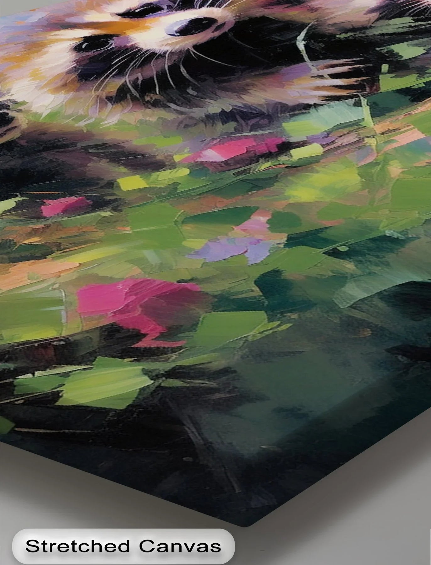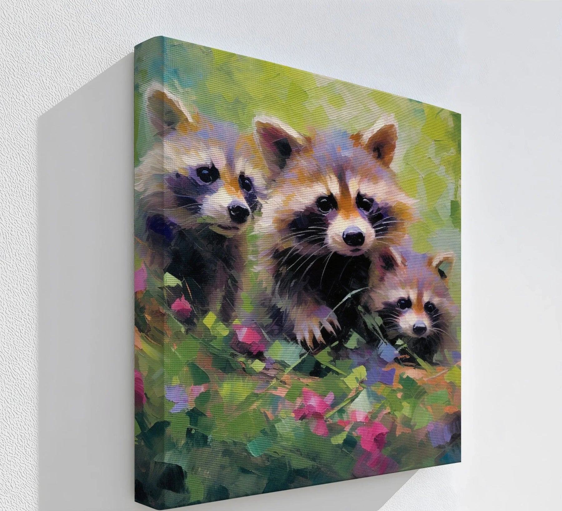 Celebrate the playful spirit of the forest with this energetic and colorful animal canvas print featuring three curious raccoons peeking through lush, impressionistic foliage. Bold brushstrokes and vivid tones of green, pink, and purple create a joyful and whimsical composition, perfect for adding personality and charm to your walls.