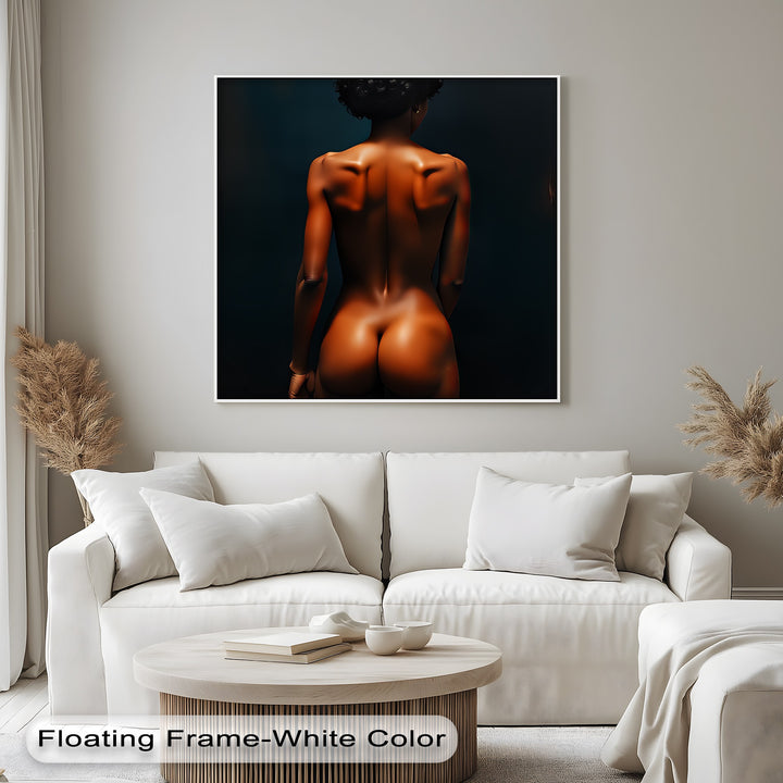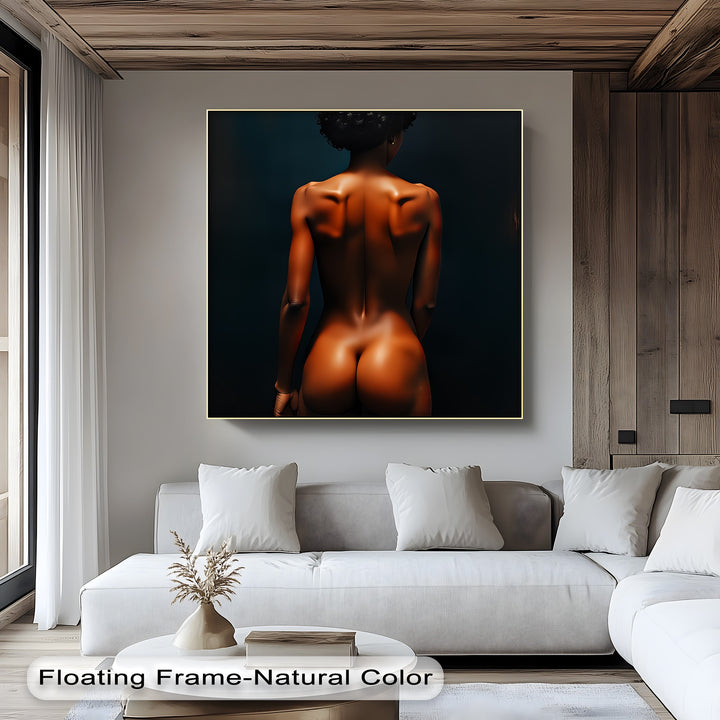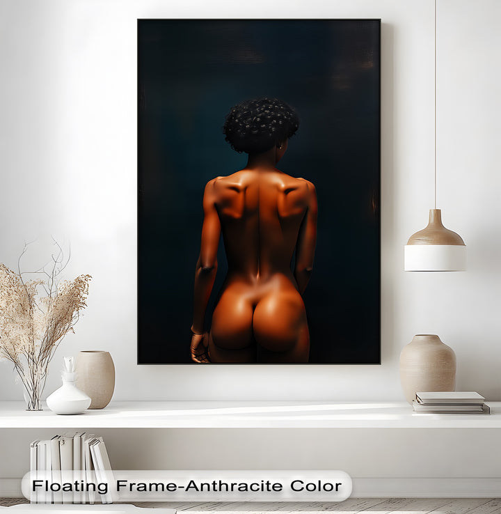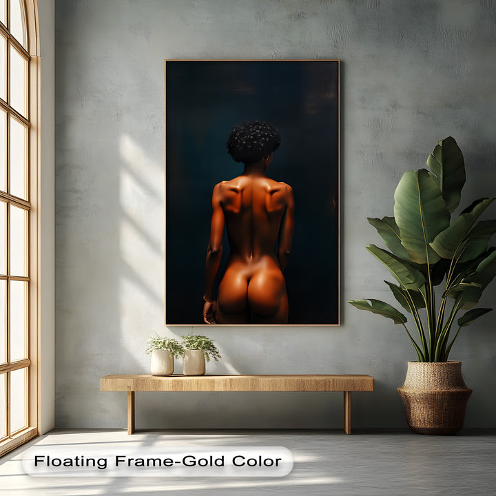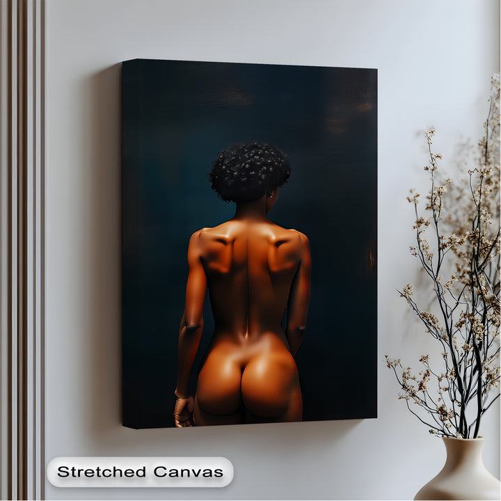 Celebrate the strength and serenity of the human form with this back-view figurative canvas print showcasing a beautifully defined Black woman. Her posture—bold yet calm—emphasizes the graceful curvature of her spine, her powerful shoulders, and the soft highlights dancing on her skin. Framed by a deep, moody background, the image draws attention to her silhouette, evoking both vulnerability and pride.