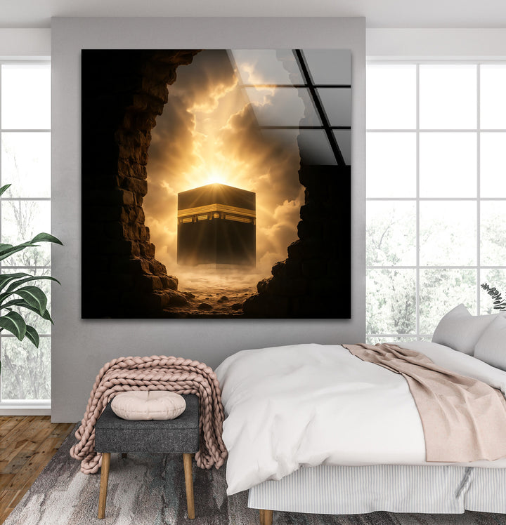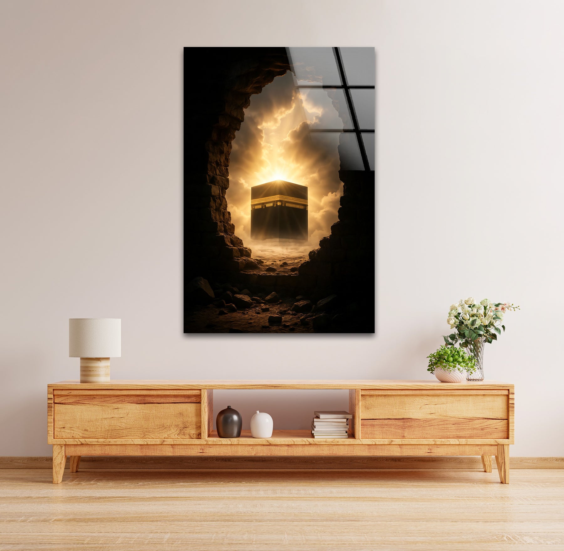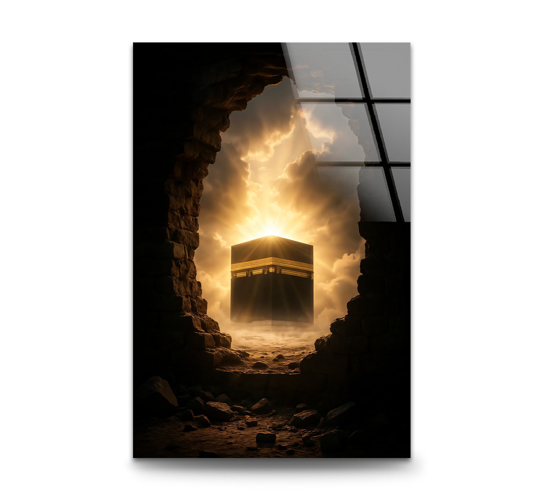 Divine Dawn – Kaaba Emerging Through Light and Stone Glass Wall Art