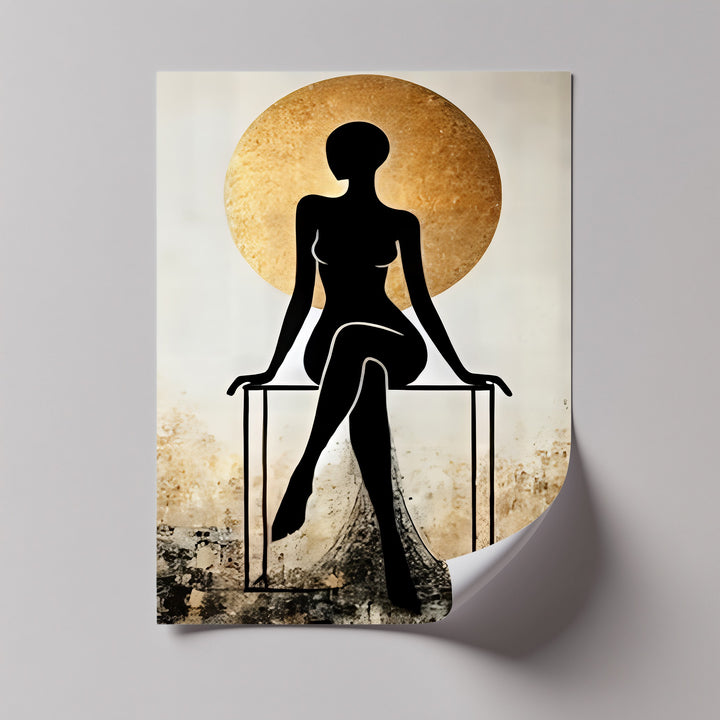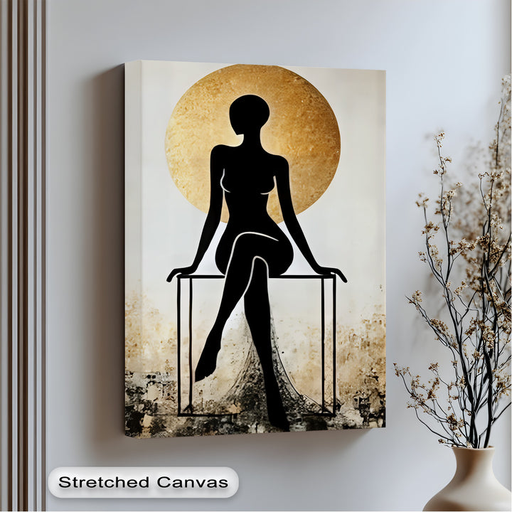 This minimalist canvas print showcases the silhouette of a poised woman seated gracefully, her form outlined in black against a glowing golden orb reminiscent of a celestial halo. The contrast between light and shadow evokes a sense of mystery, empowerment, and serenity.