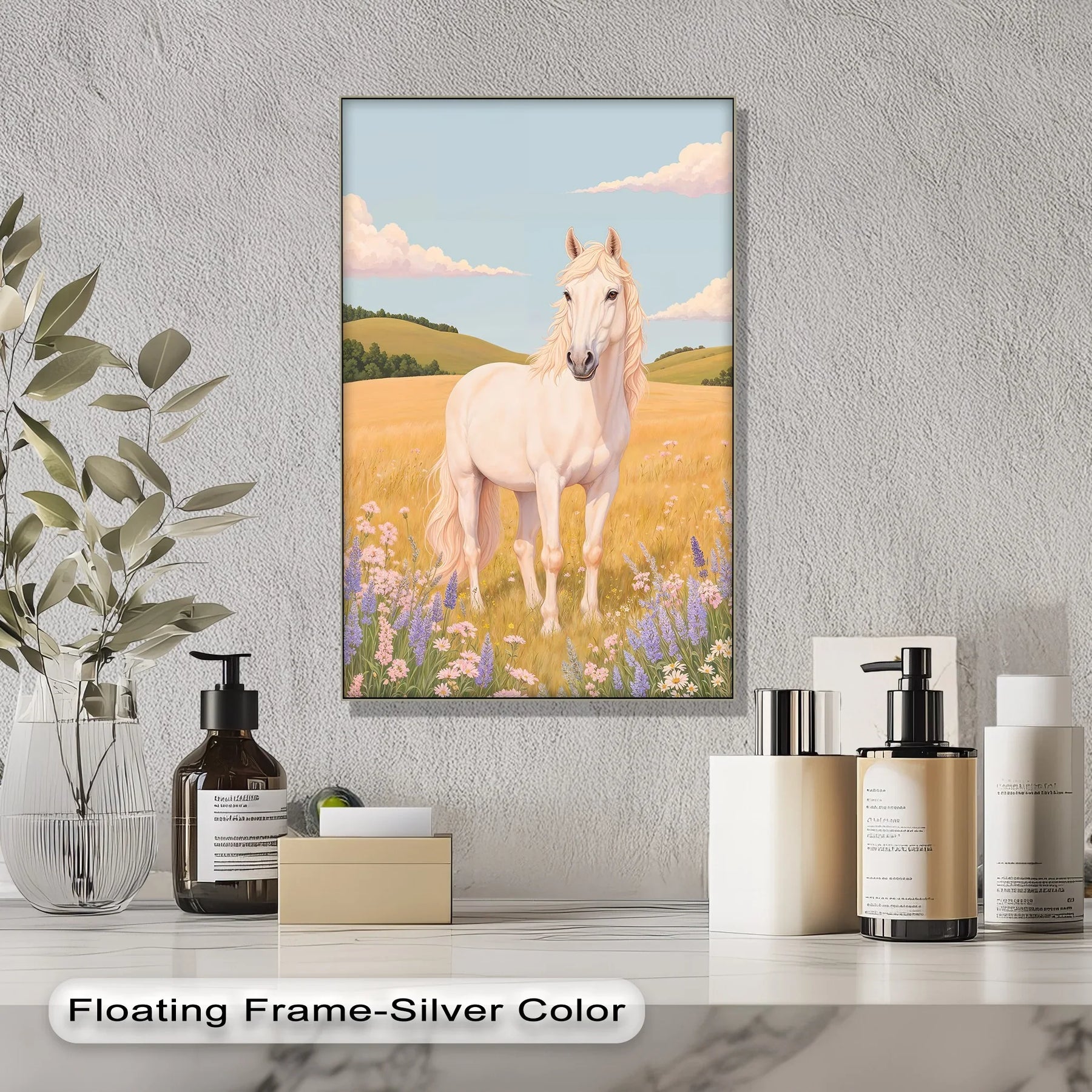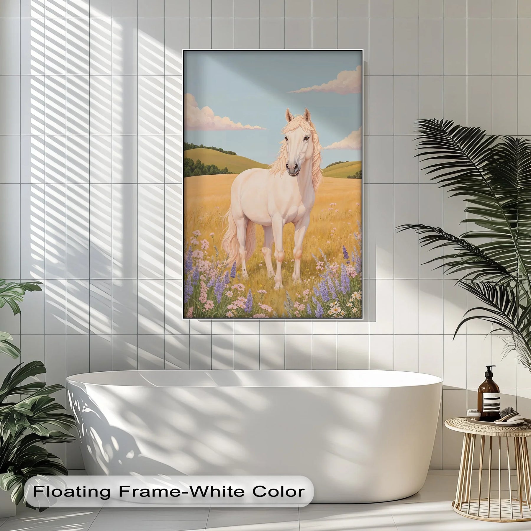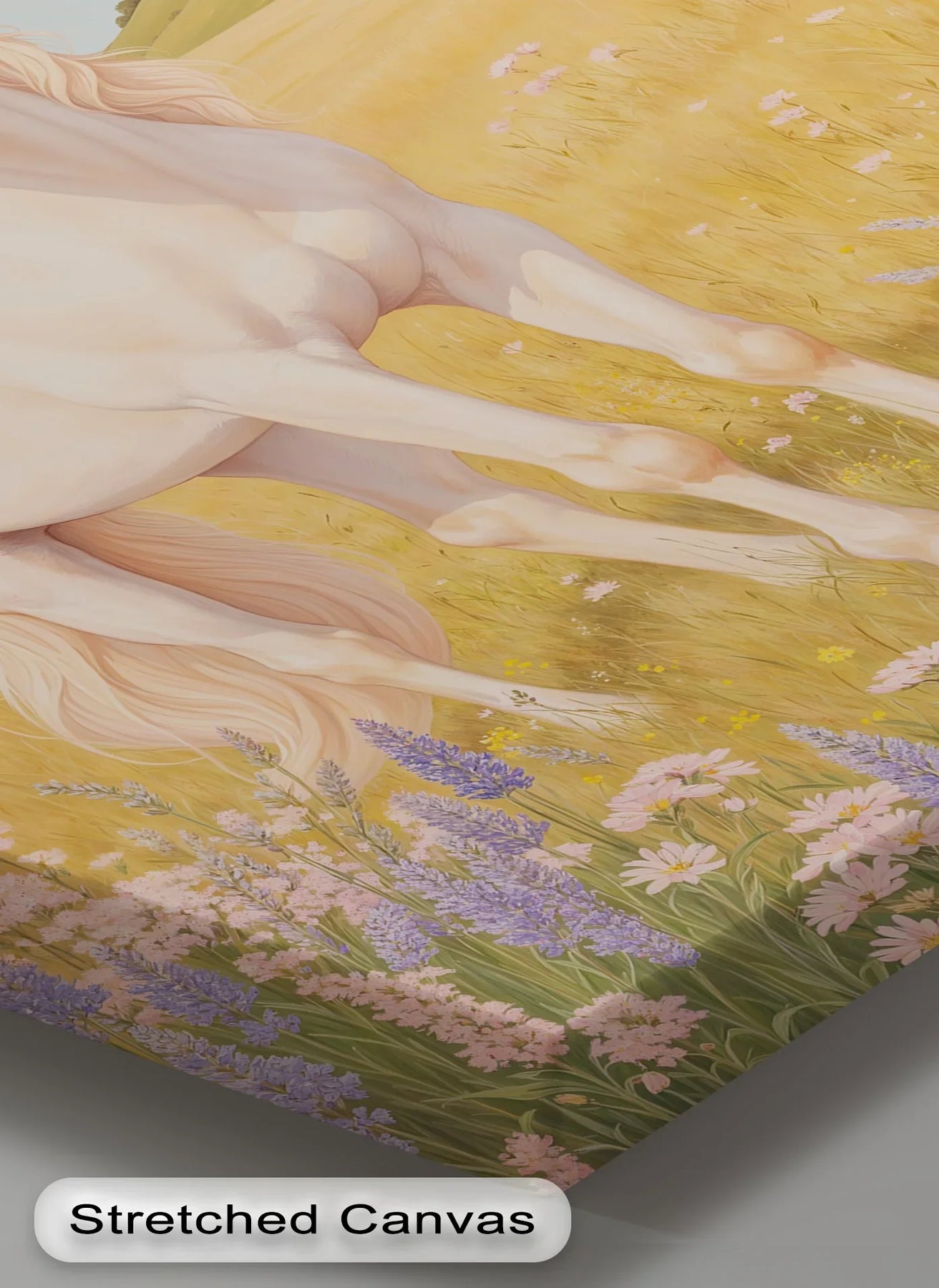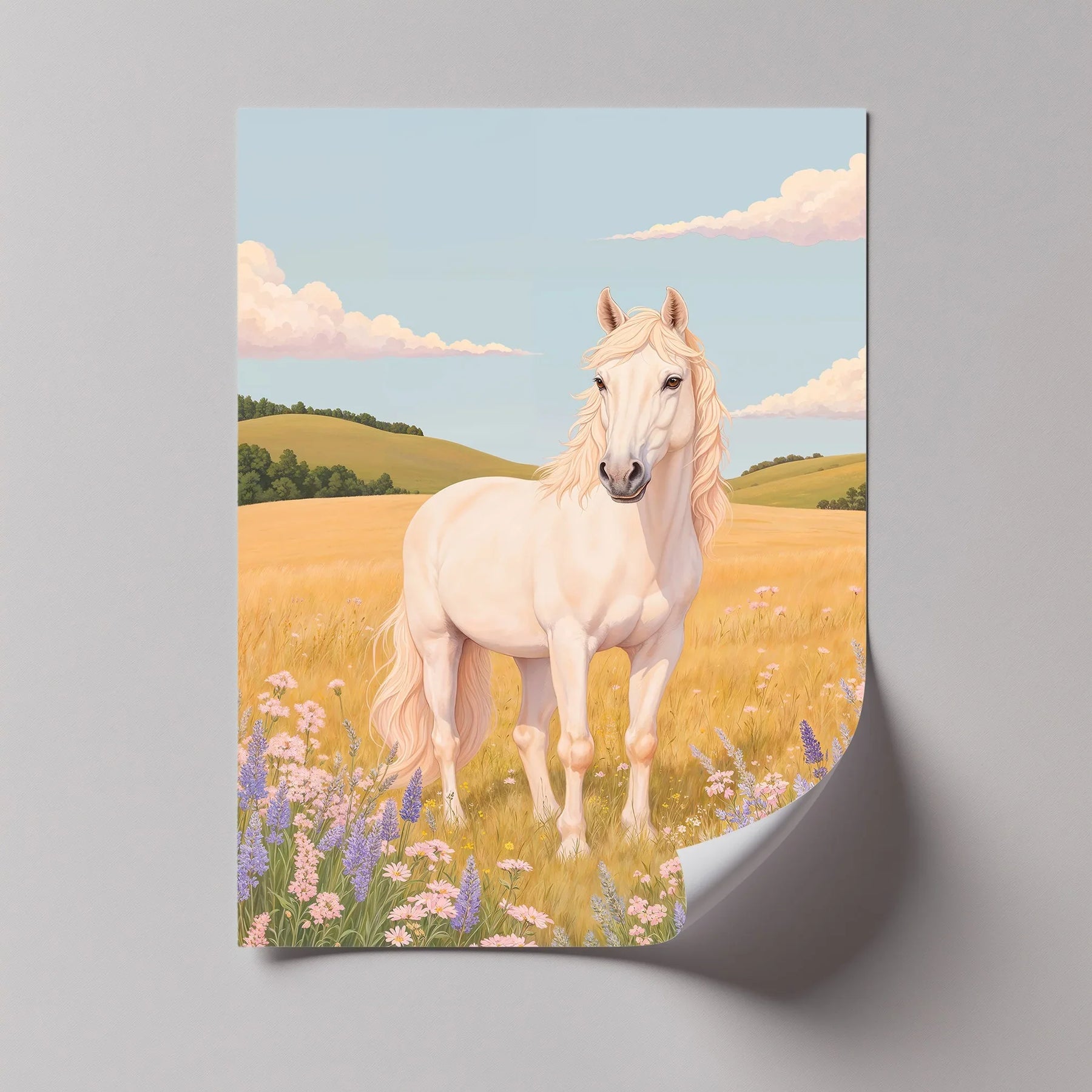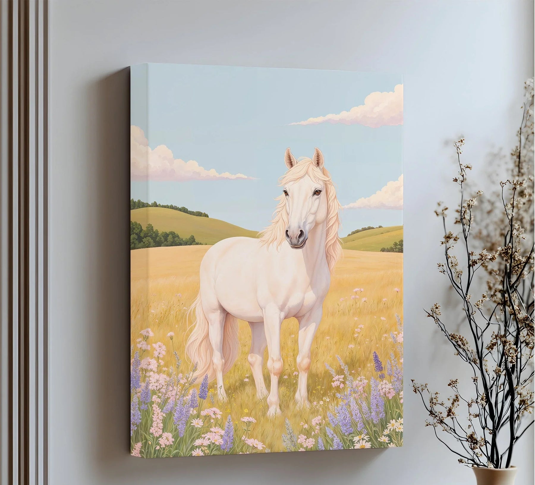 Step into the golden calm of a summer meadow with this majestic white horse standing proudly among wildflowers. Surrounded by soft hills, pastel clouds, and blooming lavender, this animal canvas print brings an atmosphere of purity, peace, and natural beauty to any room. The flowing mane and serene expression evoke strength and grace.