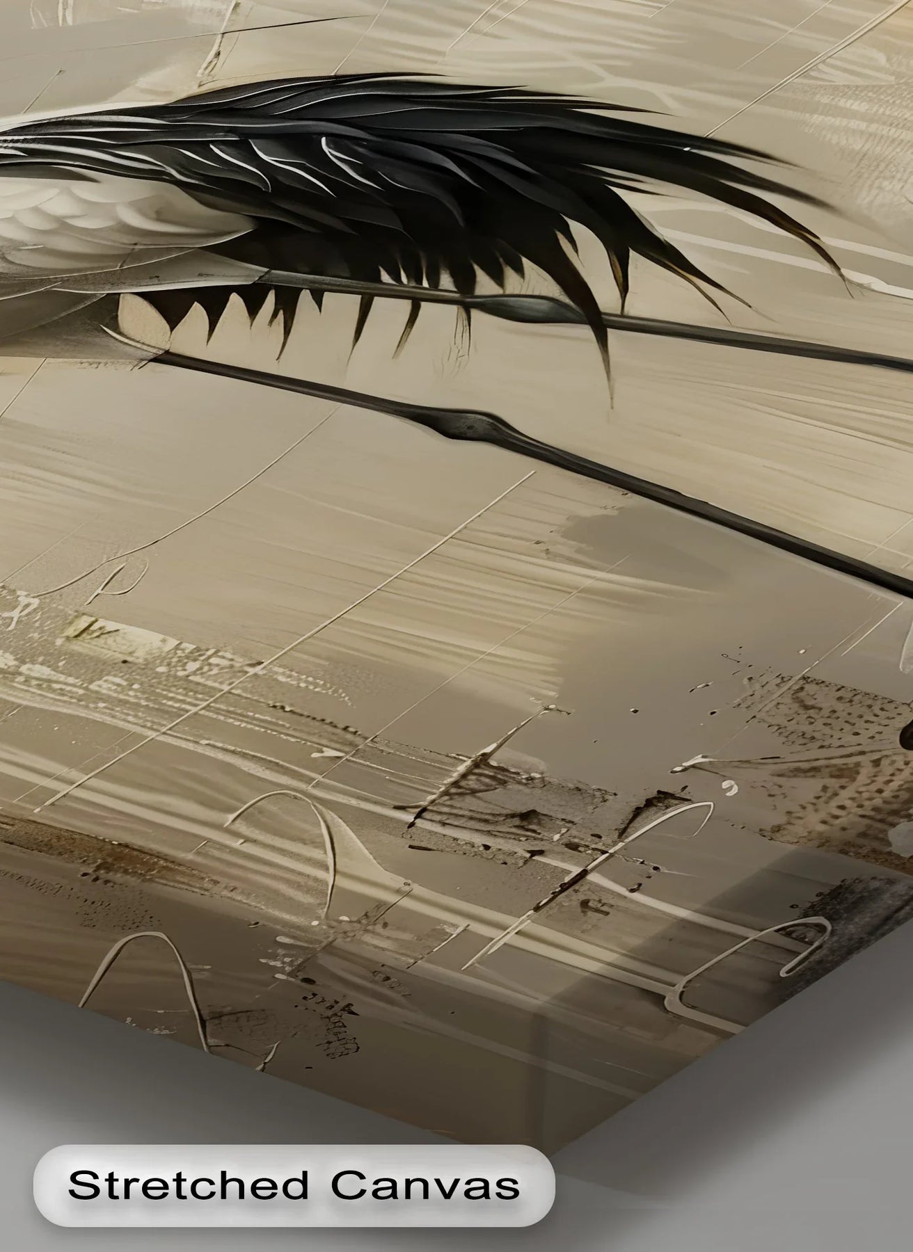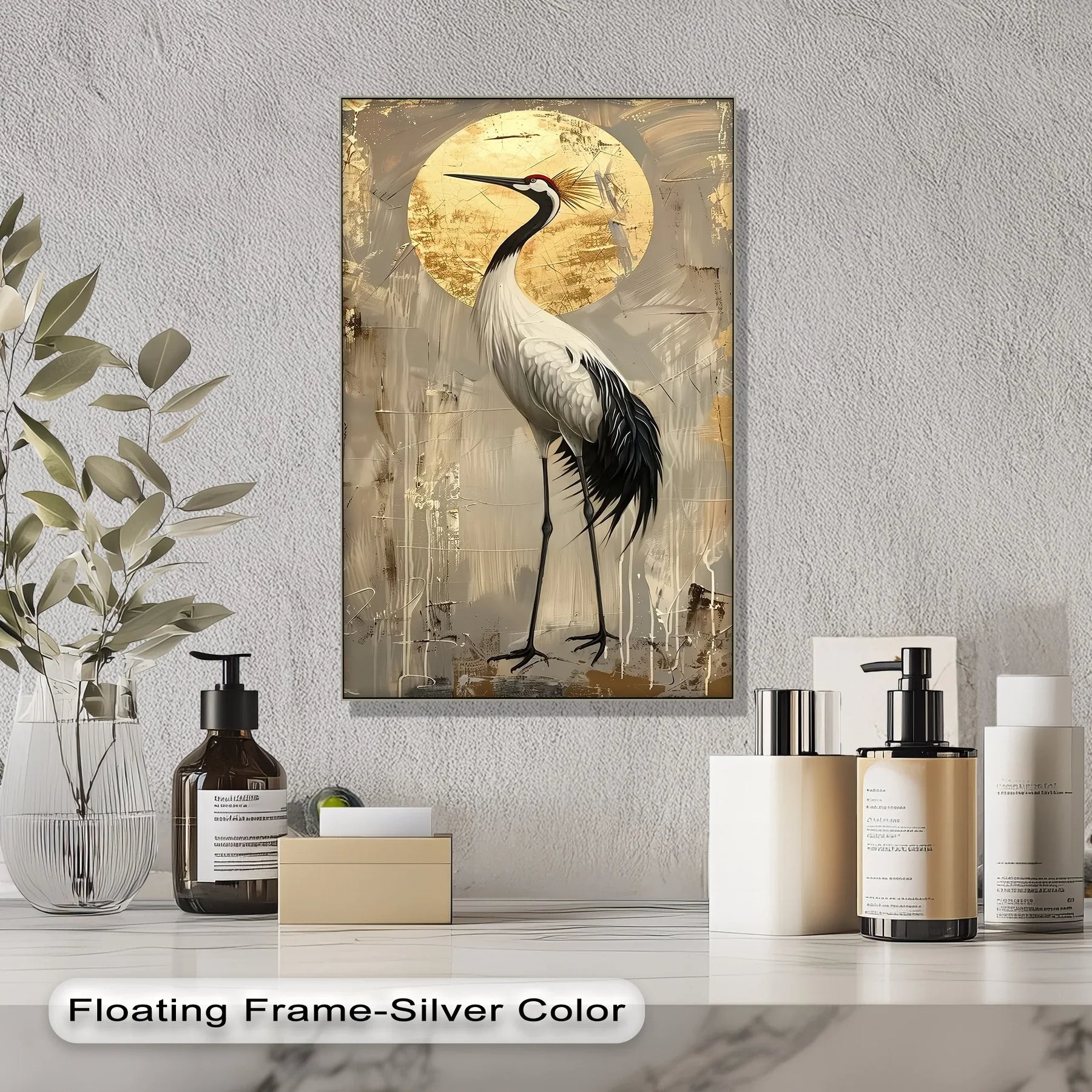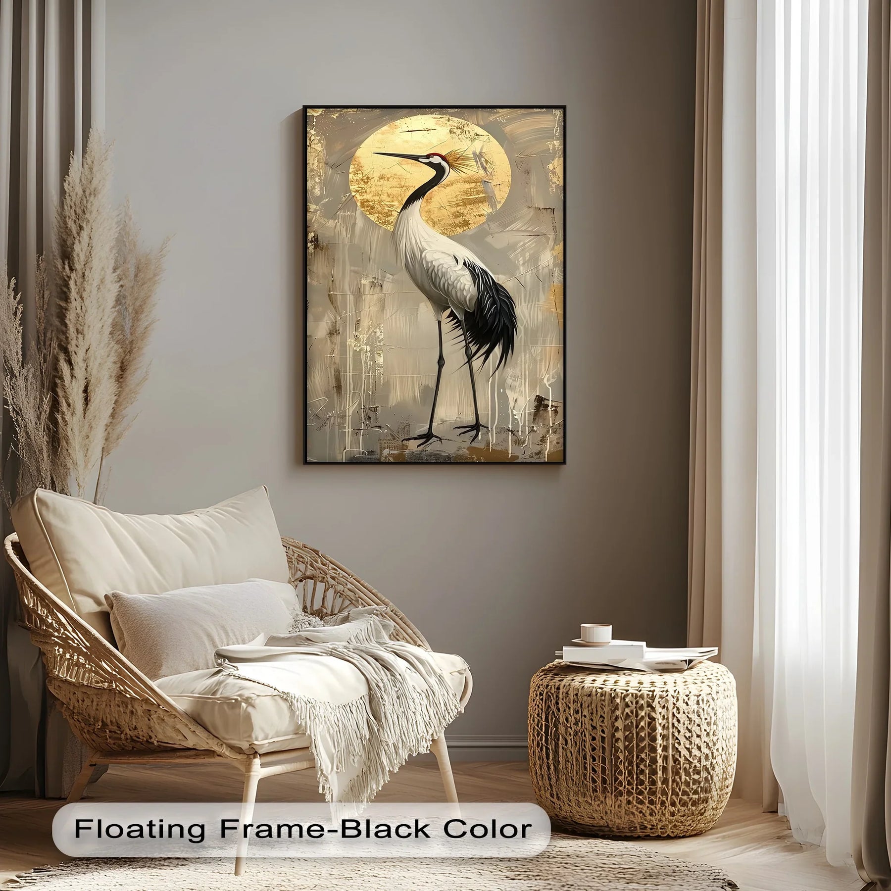 Radiating elegance and stillness, this canvas print showcases a poised crane in front of a bold golden sun, blending Eastern symbolism with contemporary art. The textured, neutral-toned background and sleek crane form a striking contrast, while the golden circle behind its head creates a halo-like glow, evoking harmony and grace. Perfect for living rooms, meditation spaces, or modern interiors, this crane artwork brings sophistication and a serene presence to any wall.
