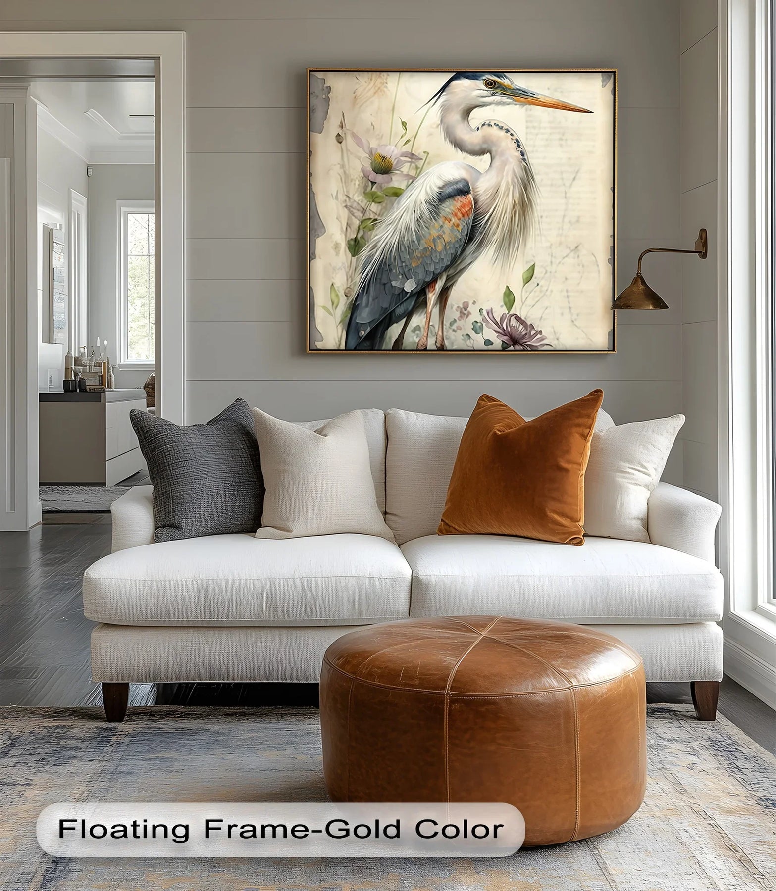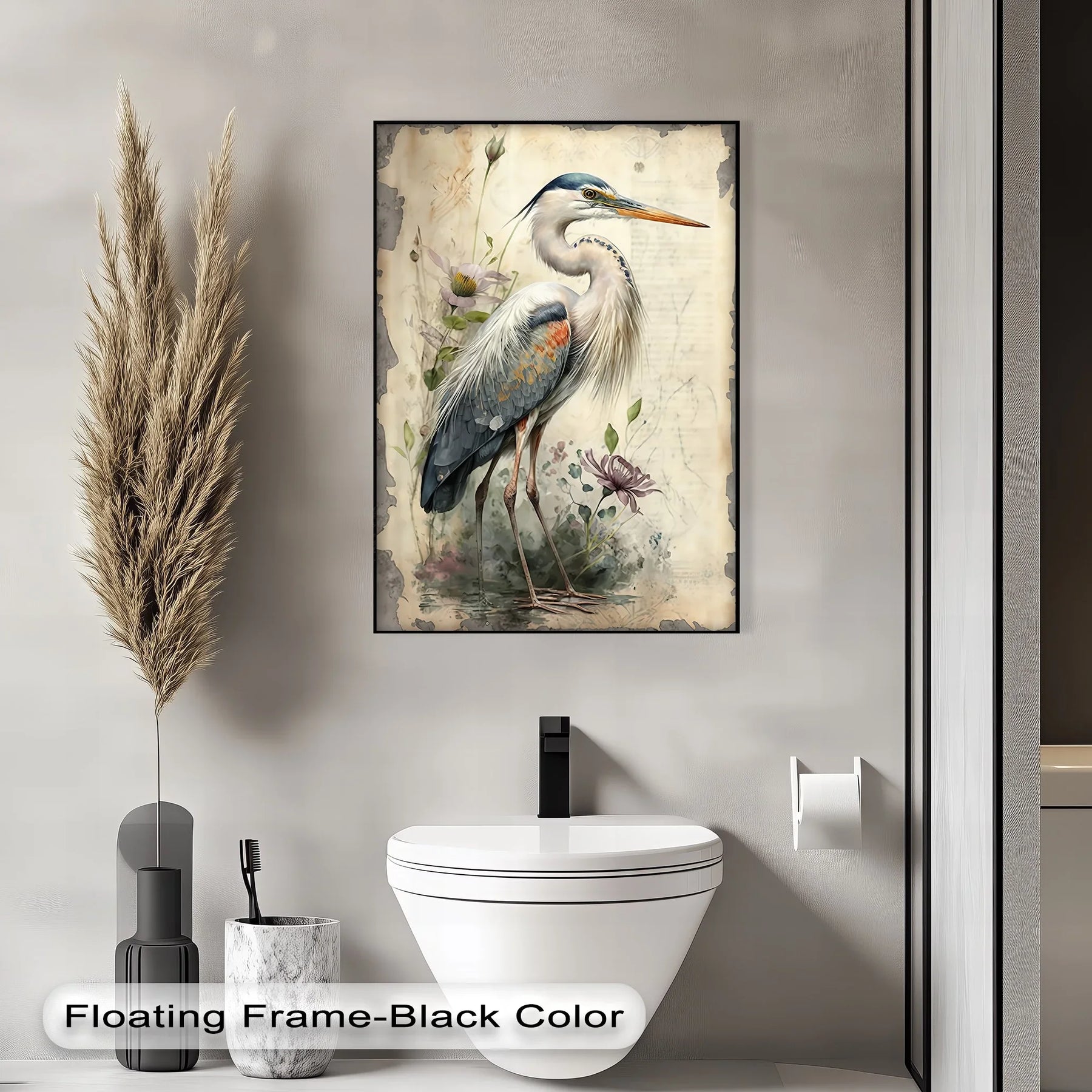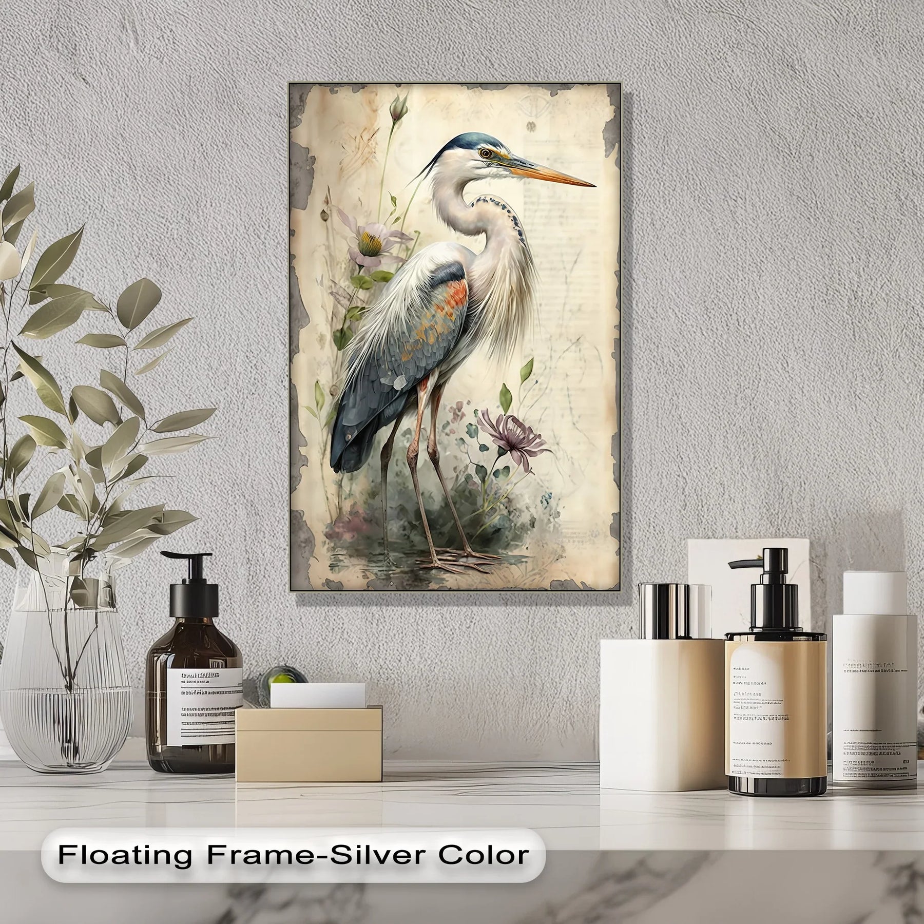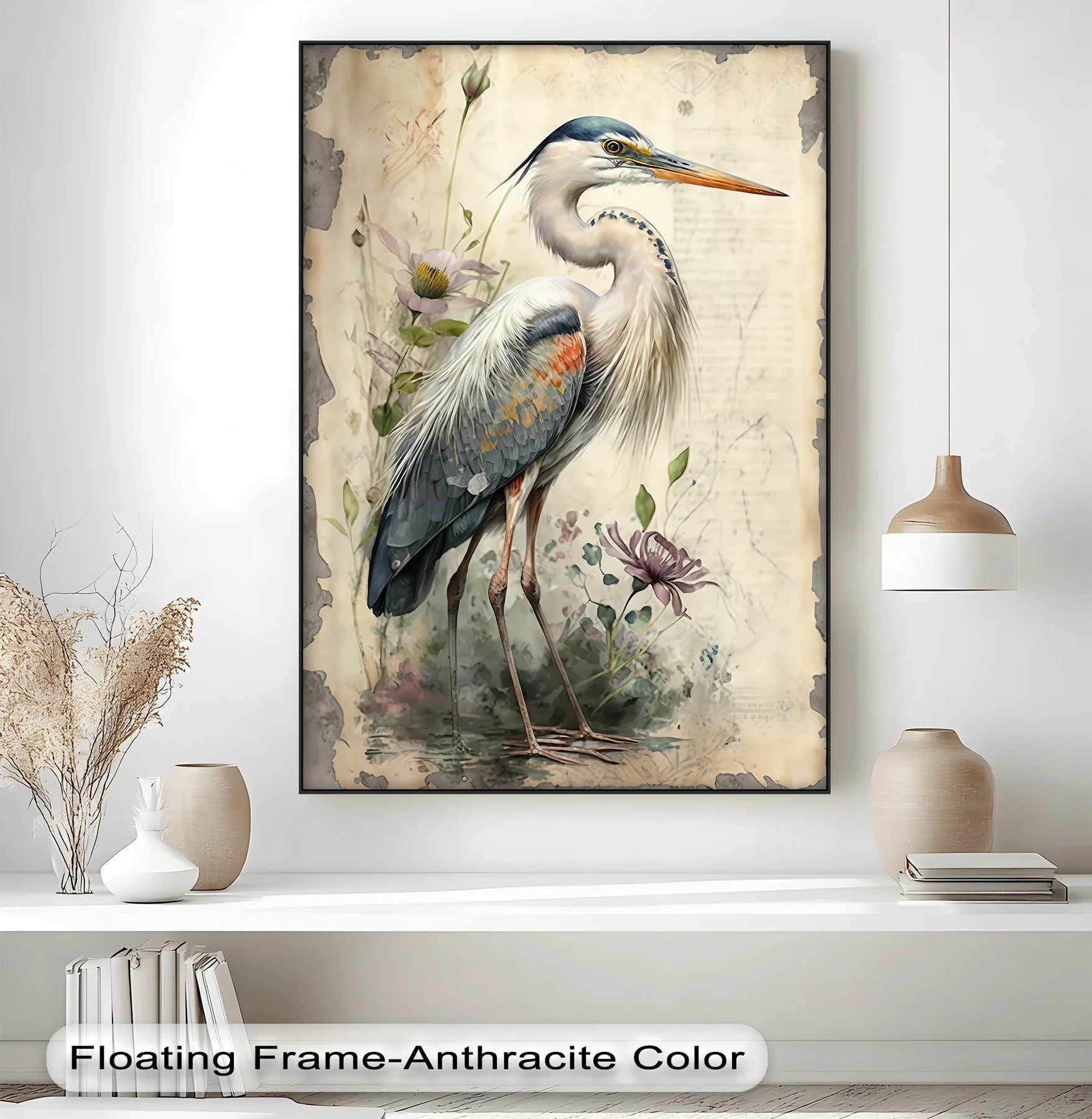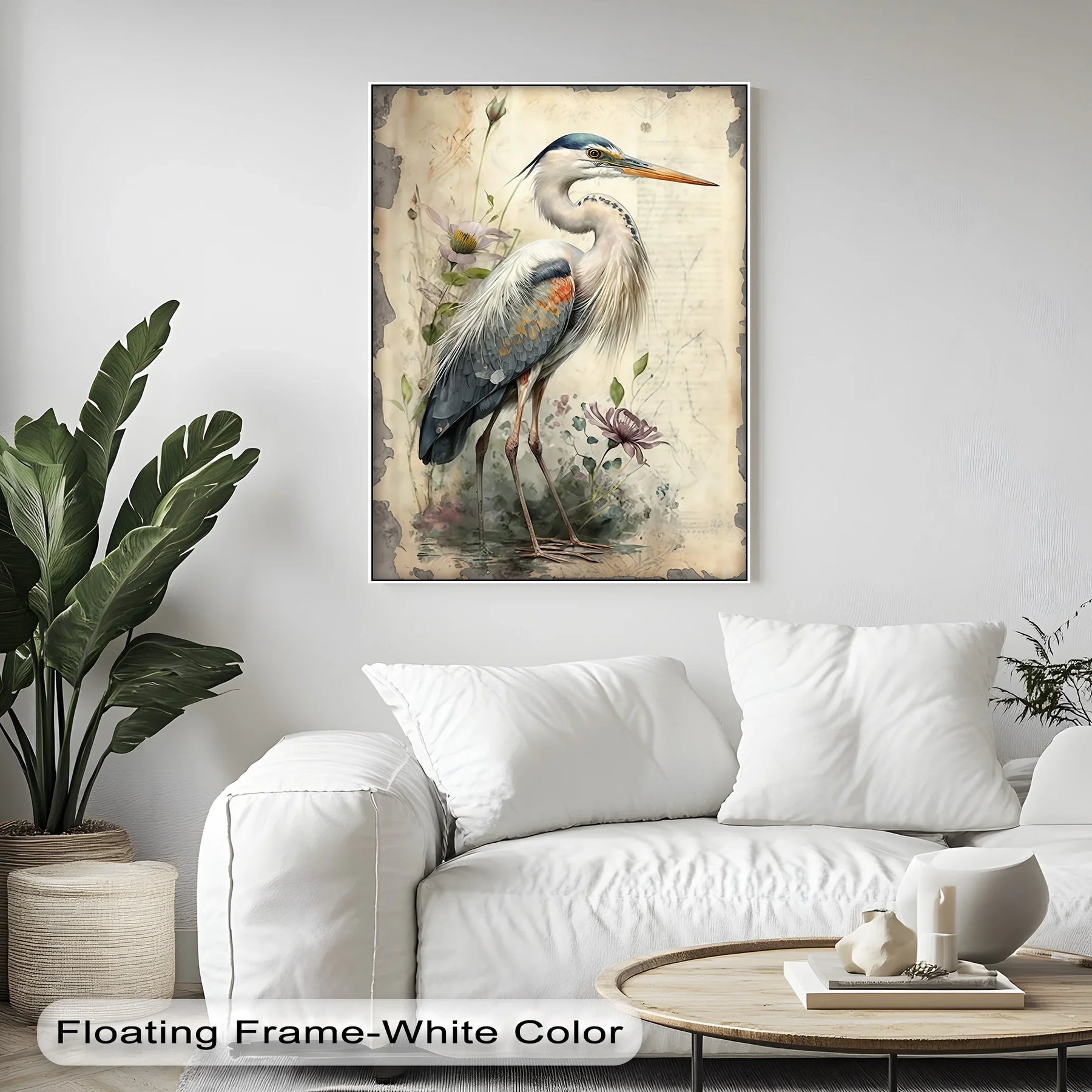 Immerse your space in natural elegance with this vintage-inspired heron canvas print. Featuring a beautifully detailed heron standing tall among blooming wildflowers, the design blends classical botanical charm with subtle artistic textures. The soft, neutral tones paired with muted pinks and earthy greens make it a sophisticated choice for nature lovers and those seeking tranquil wall décor. Perfect for bedrooms, reading nooks, or entryways, this canvas art brings a calm, contemplative mood while celebrating the delicate balance of wildlife and flora.