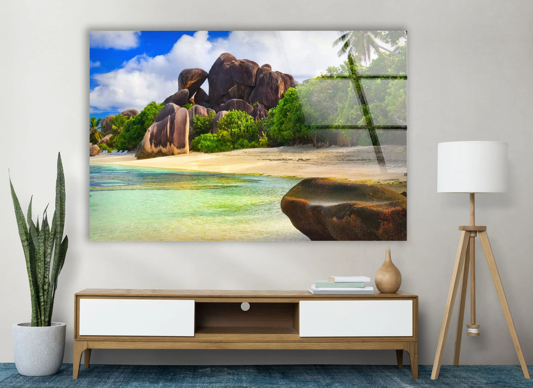 Granitküsten-Wandbild – Üppiger tropischer Strandglasdruck