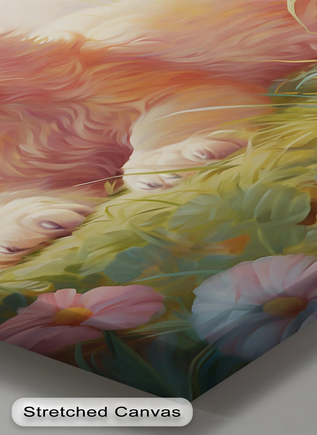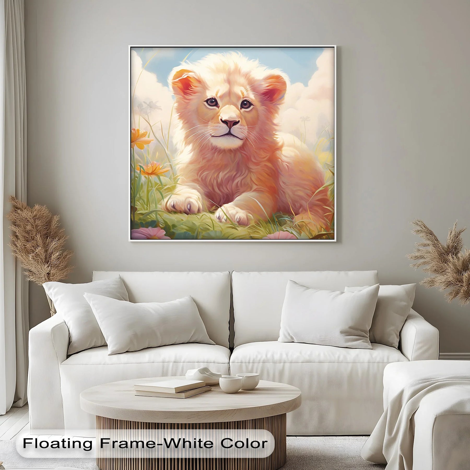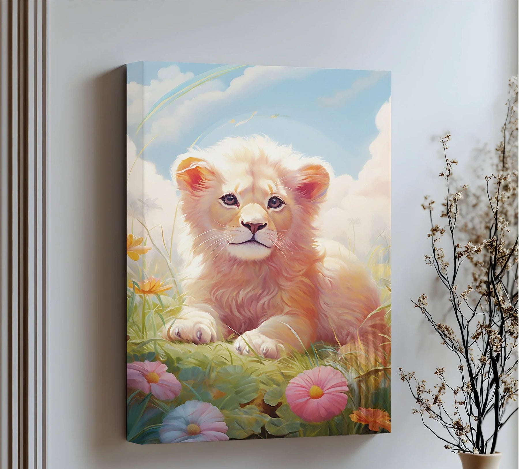 Capture the heart of the savanna with this charming animal canvas print. A tender lion cub rests amid a dreamy meadow of pastel flowers, bathed in soft sunlight under a sky painted with gentle clouds and a glowing rainbow arc. With its wide, soulful eyes and velvety fur, the cub exudes innocence, wonder, and emerging strength — a perfect symbol of new beginnings and natural grace.