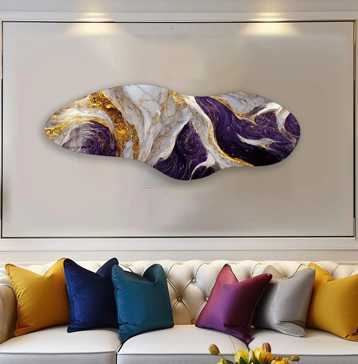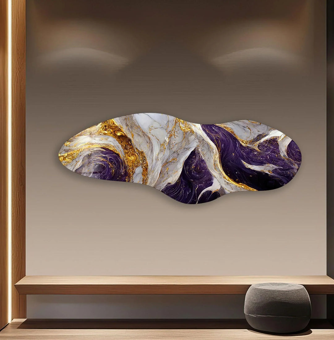 Verleihen Sie Ihrem Raum einen Hauch von Luxus mit dem unregelmäßigen, asymmetrischen Lila & Golden abstrakte Drucke. Dieses exquisite Glasbilder zeigt Wirbel in satten Lilatönen, akzentuiert mit goldenen Streifen, und schafft so eine beeindruckende Mischung aus Eleganz und Raffinesse. Seine unregelmäßige Form und die glänzende Glasoberfläche machen ihn zu einem einzigartigen Blickfang für moderne Innenräume.
