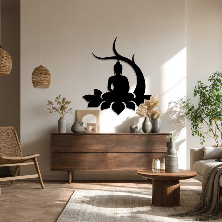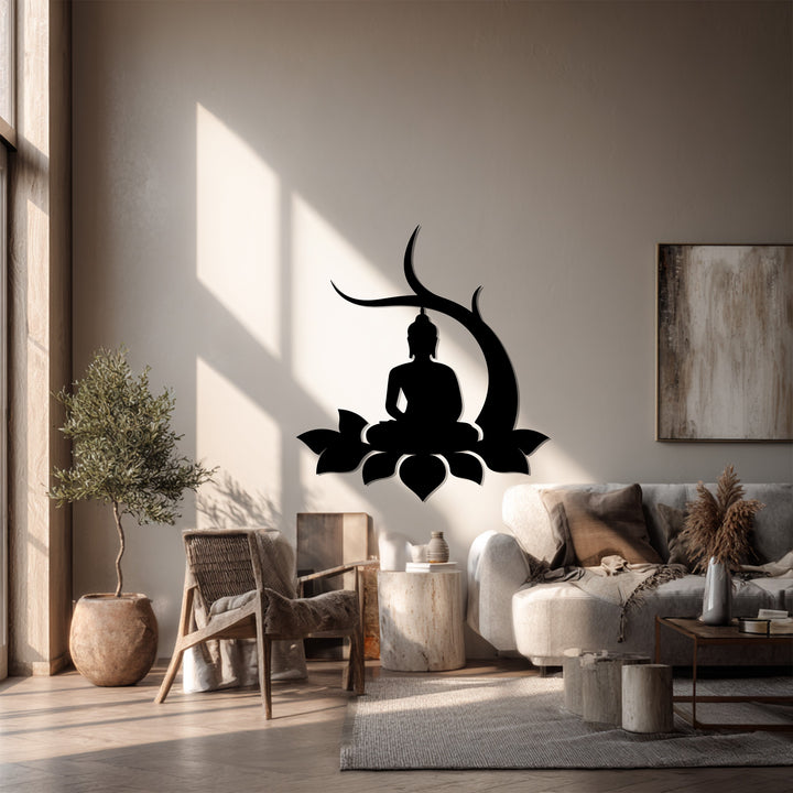 Bring serenity and mindfulness into your home with this Lotus Buddha Metal Wall Art. Featuring the graceful silhouette of Buddha in meditation, seated upon a blooming lotus flower beneath an elegantly curved tree, this design radiates peace, balance, and inner harmony. The minimal black outline emphasizes simplicity while creating a powerful spiritual presence on your wall.