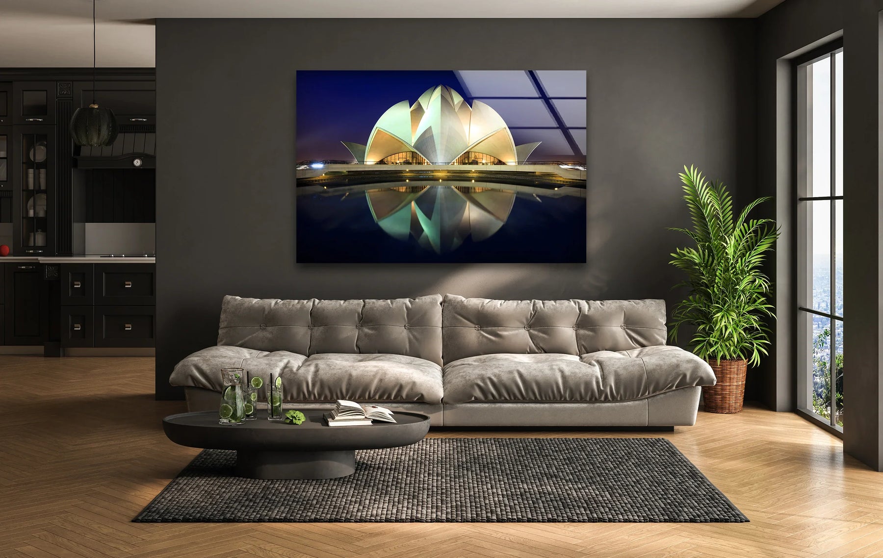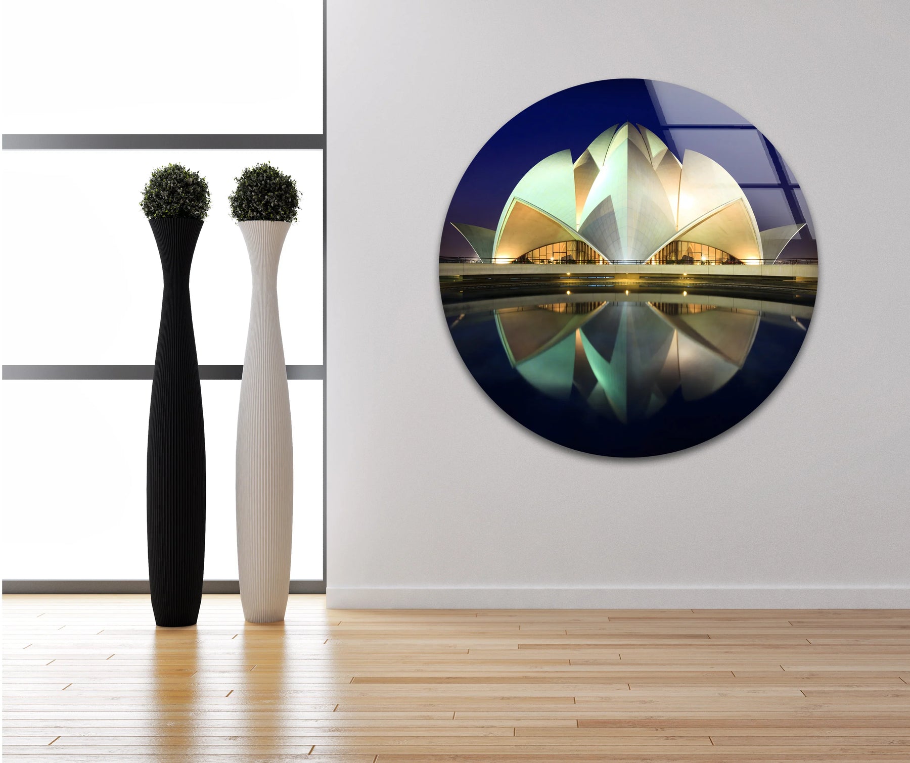 Dieses atemberaubende Lotus-Tempel Glasbilder Bringt die majestätische Schönheit von Delhis ikonischem Wahrzeichen direkt in Ihr Zuhause und schafft so eine ruhige und inspirierende Atmosphäre, wo immer es aufgestellt wird.