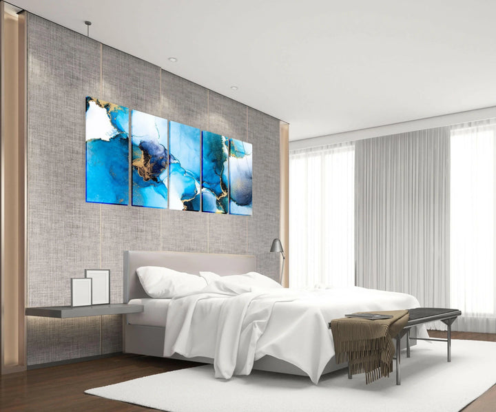 Luxus Blau, Weiß Fluid Art Abstrakt Glasbilder – 5 Stück