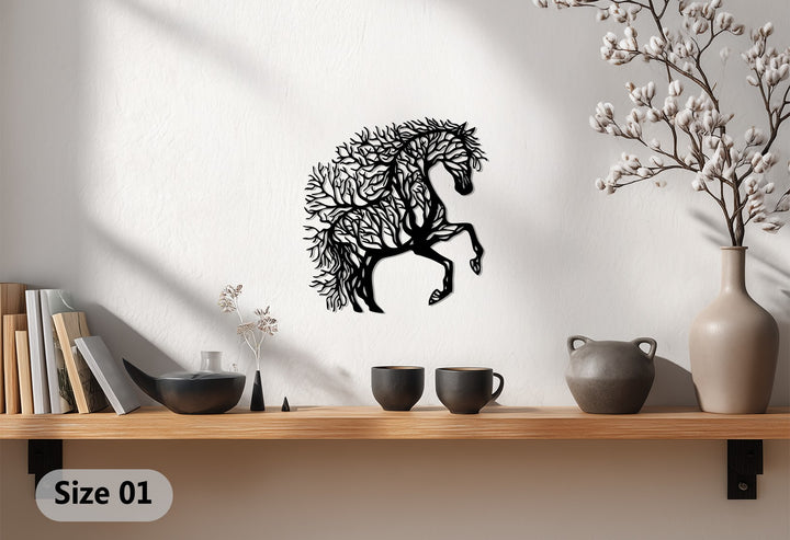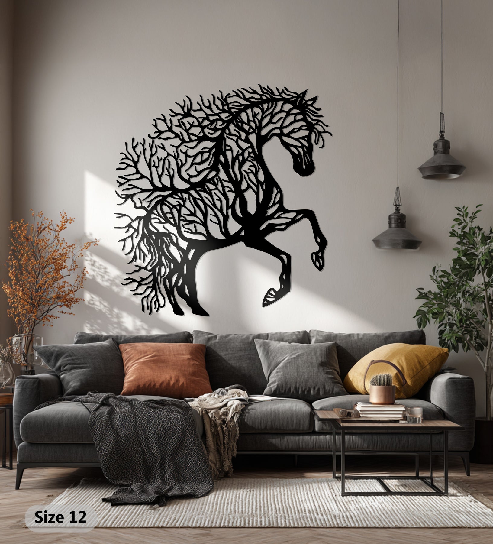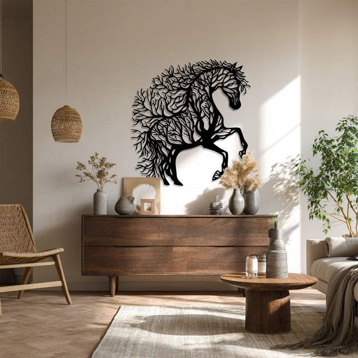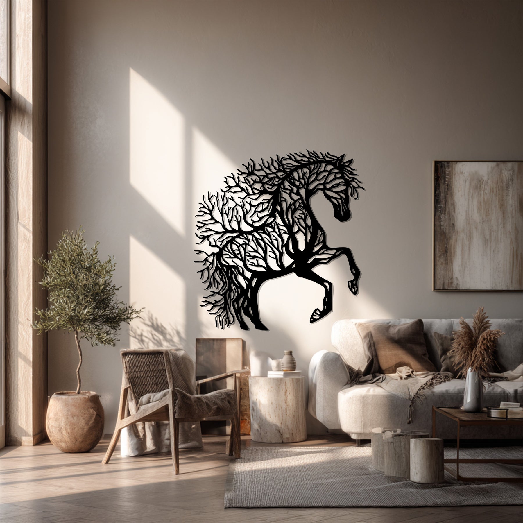 Bring the wild spirit of nature and strength into your home with the Majestic Tree Horse Metal Wall Art, a captivating fusion of equine grace and organic design. This masterpiece depicts a rearing horse seamlessly intertwined with delicate tree branches, symbolizing power, freedom, and natural balance.