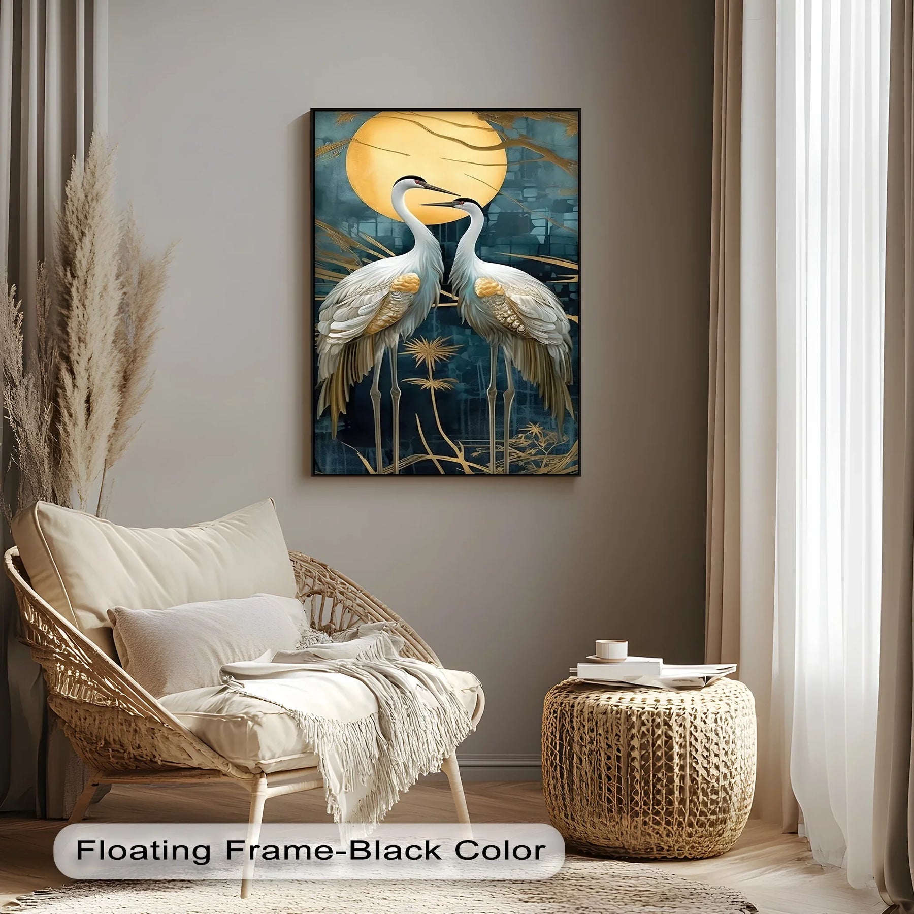 Step into a world of grace and harmony with Moonlit Elegance, a stunning canvas print featuring two majestic cranes standing beneath a glowing full moon. With their intricate feathers touched in gold and a backdrop of deep midnight blues and stylized flora, this piece evokes both tranquility and luxury. Perfect for living rooms, bedrooms, or meditation spaces, this artwork celebrates balance, beauty, and serenity.