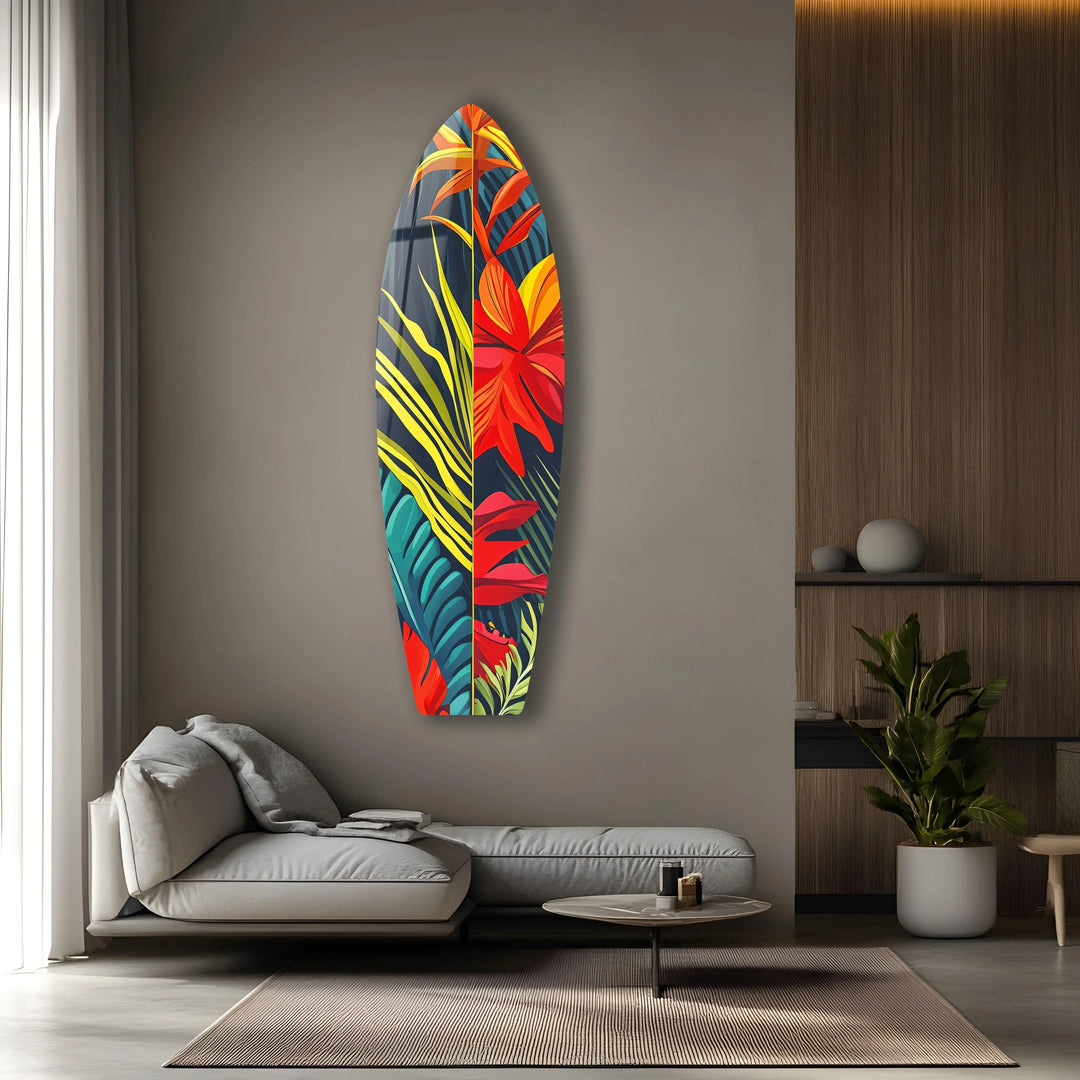 Verleihen Sie Ihrem Raum mit dem Red Botanical Surfboard ein tropisches Flair florale WandkunstDieses auffällige Glasbilder kombiniert leuchtend rote, orange und gelbe botanische Drucke mit einem Surfbrett-Design und schafft so ein auffälliges, modernes Herzstück. Perfekt für Strandhäuser, moderne Innenräume oder jede Wand, die ein farbenfrohes Statement braucht, spiegelt dieses Stück sowohl Kunstfertigkeit als auch Handwerkskunst wider.
