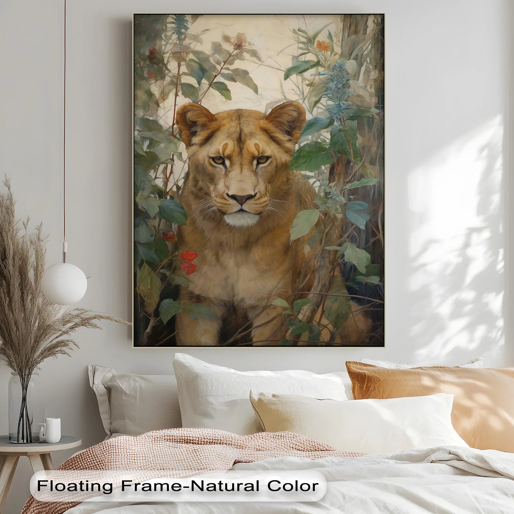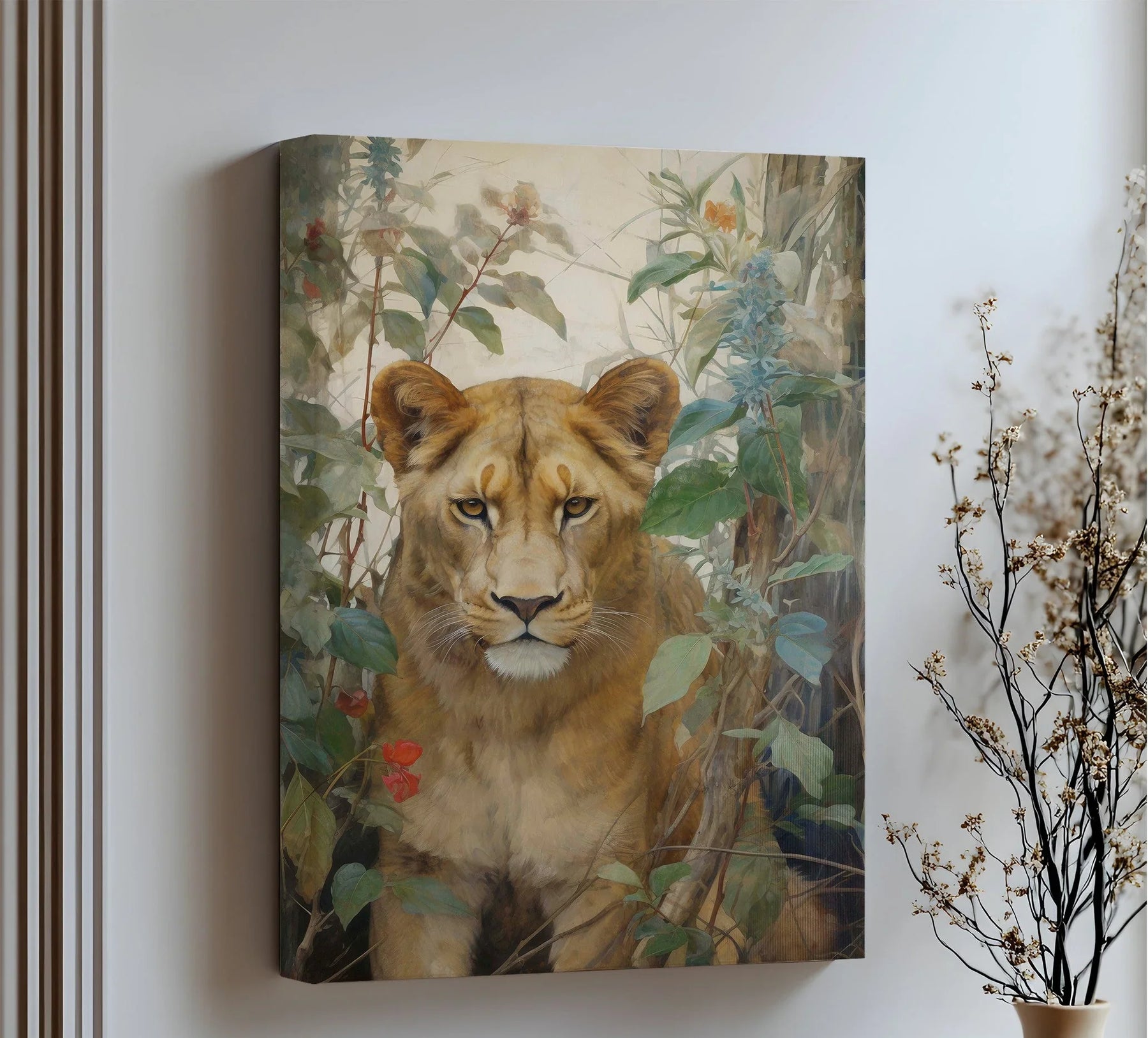 Capture the quiet authority of the wilderness with this breathtaking animal canvas print. A powerful lioness emerges from a tapestry of dense foliage and wild blooms, her steady gaze evoking grace, wisdom, and watchful strength. The muted earthy tones and botanical accents lend a natural elegance, making this piece a perfect focal point for interiors that embrace organic textures and serene strength.