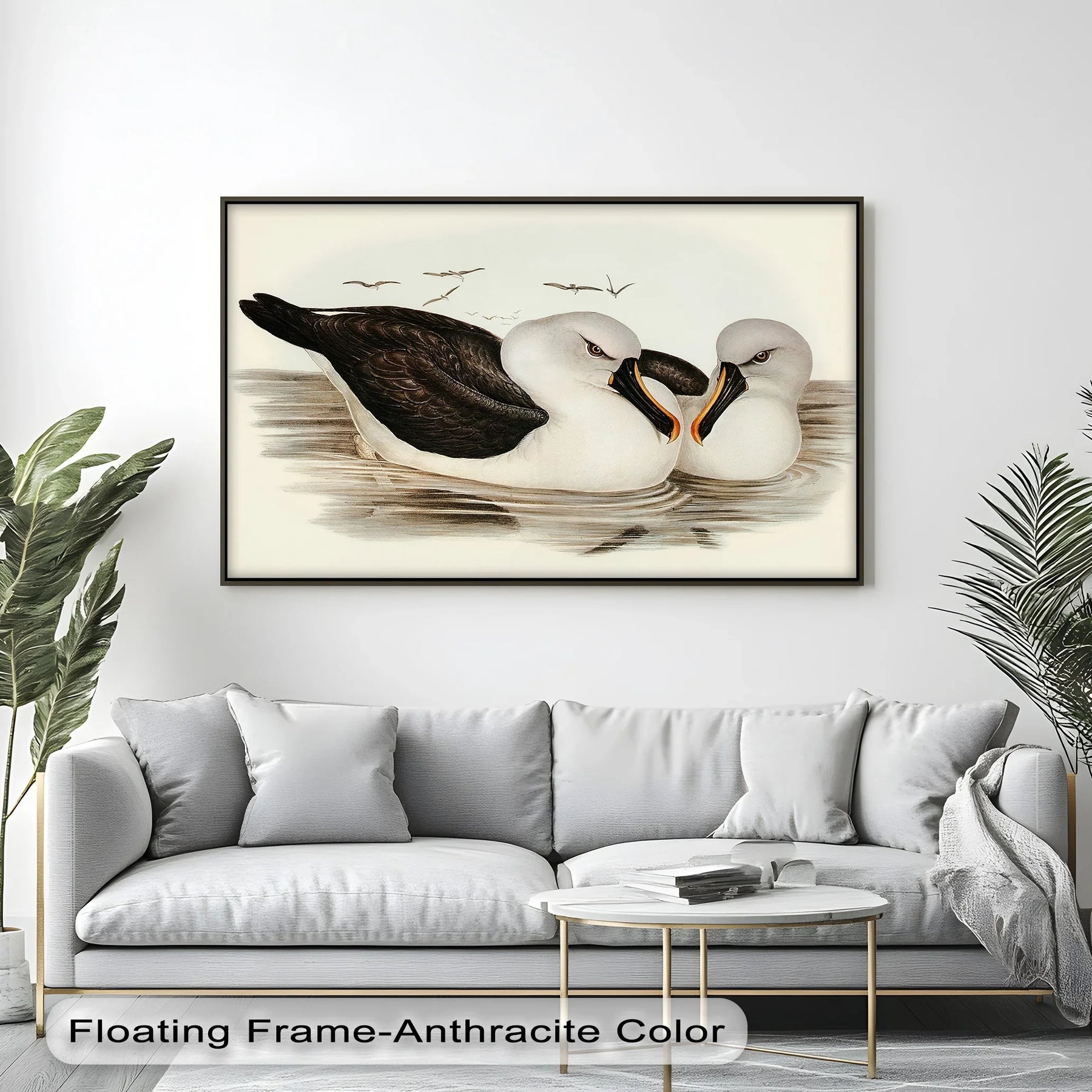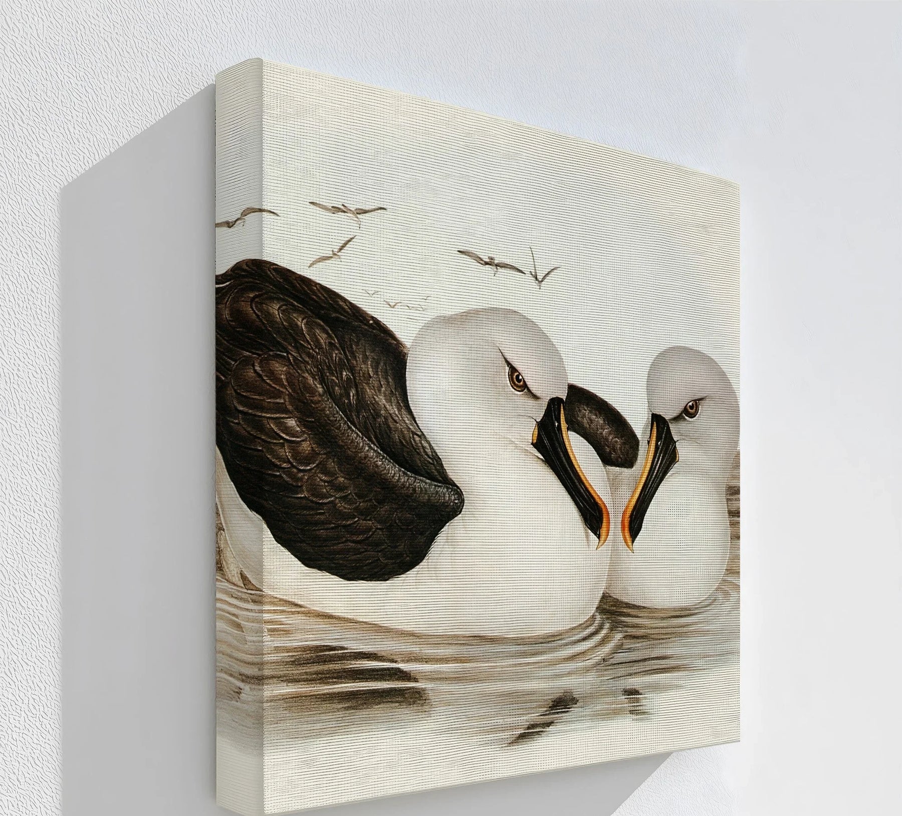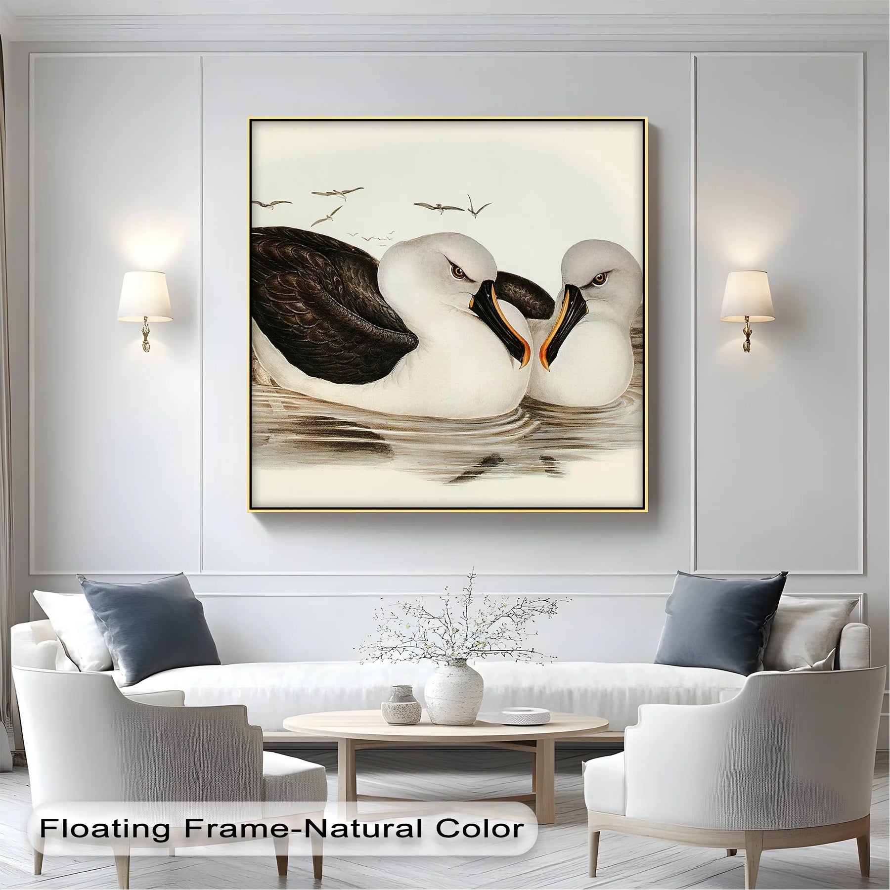 A timeless depiction of grace and bond, this vintage-style animal canvas print features a striking pair of albatrosses calmly floating across still waters. With masterful detailing and soft neutral tones, the artwork channels classical scientific illustration while evoking the quiet strength and dignity of these magnificent seabirds. Ideal for coastal homes, bird lovers, or those who admire refined natural art.