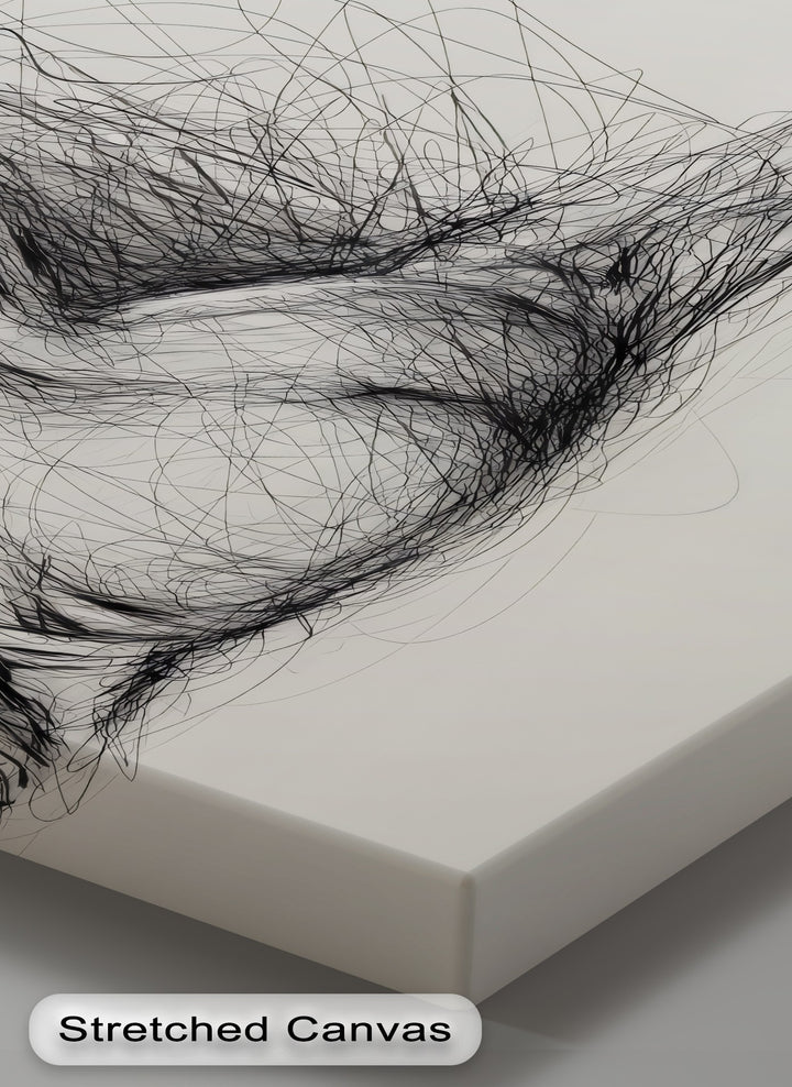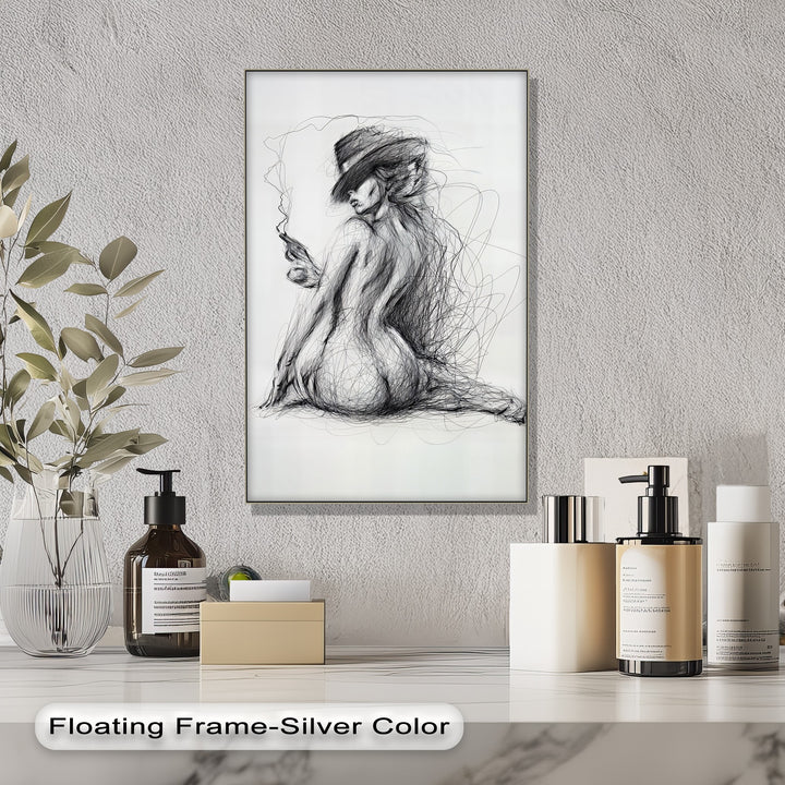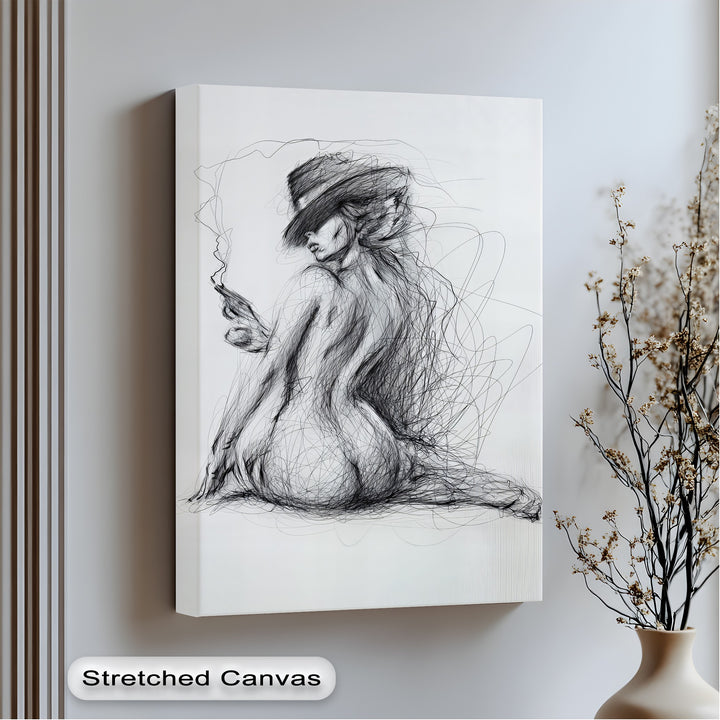 This dynamic canvas print captures a raw, expressive silhouette of a nude woman drawn entirely with tangled black lines, seated with elegance and attitude. A tilted hat shadows her eyes as she smokes from a sleek cigarette, giving the composition a noir-like mystery.