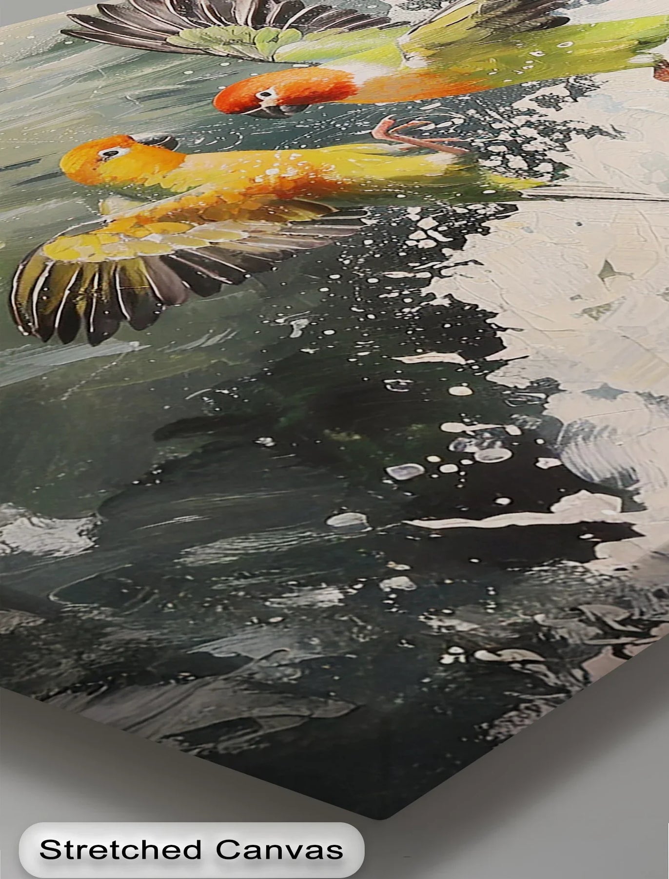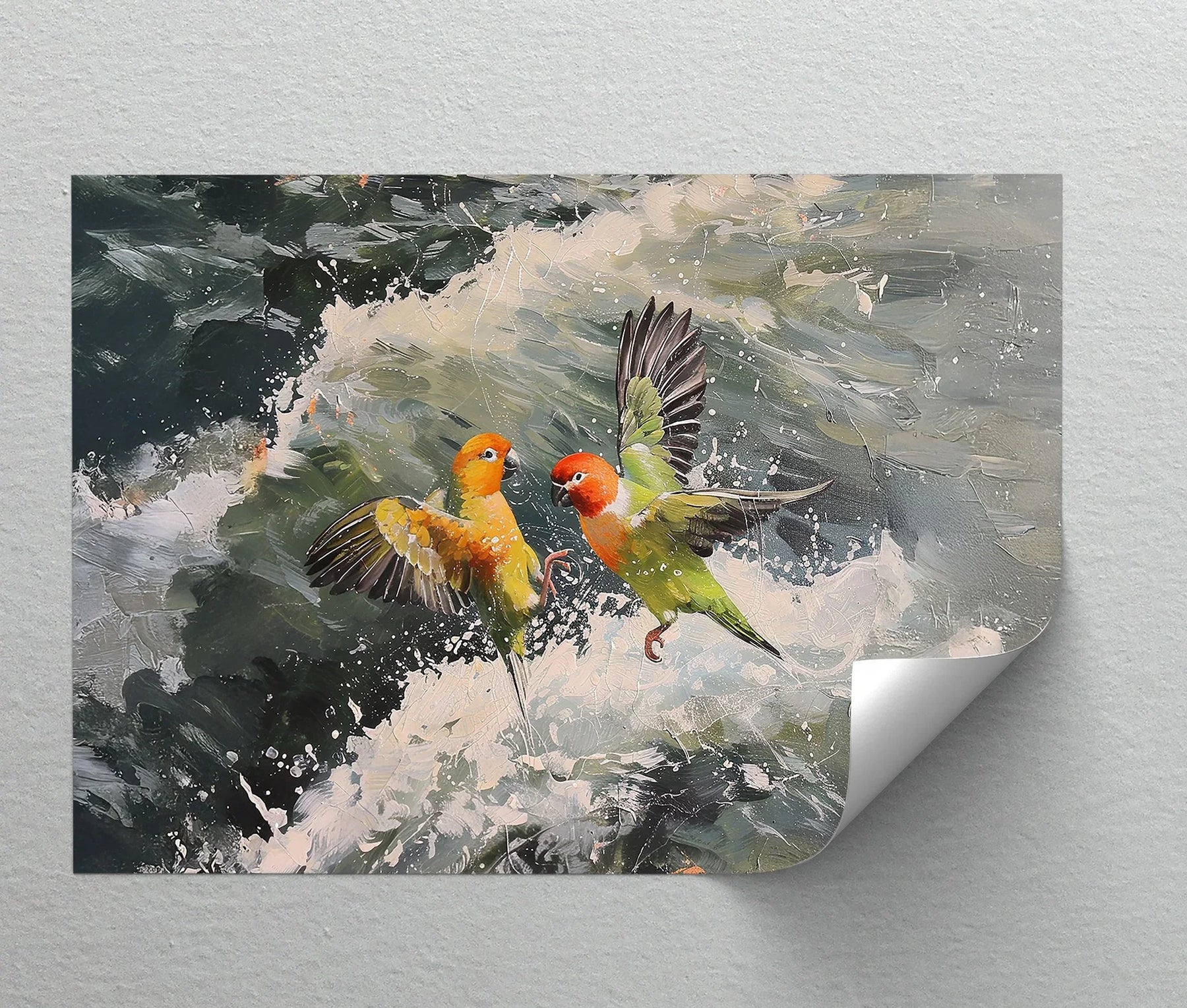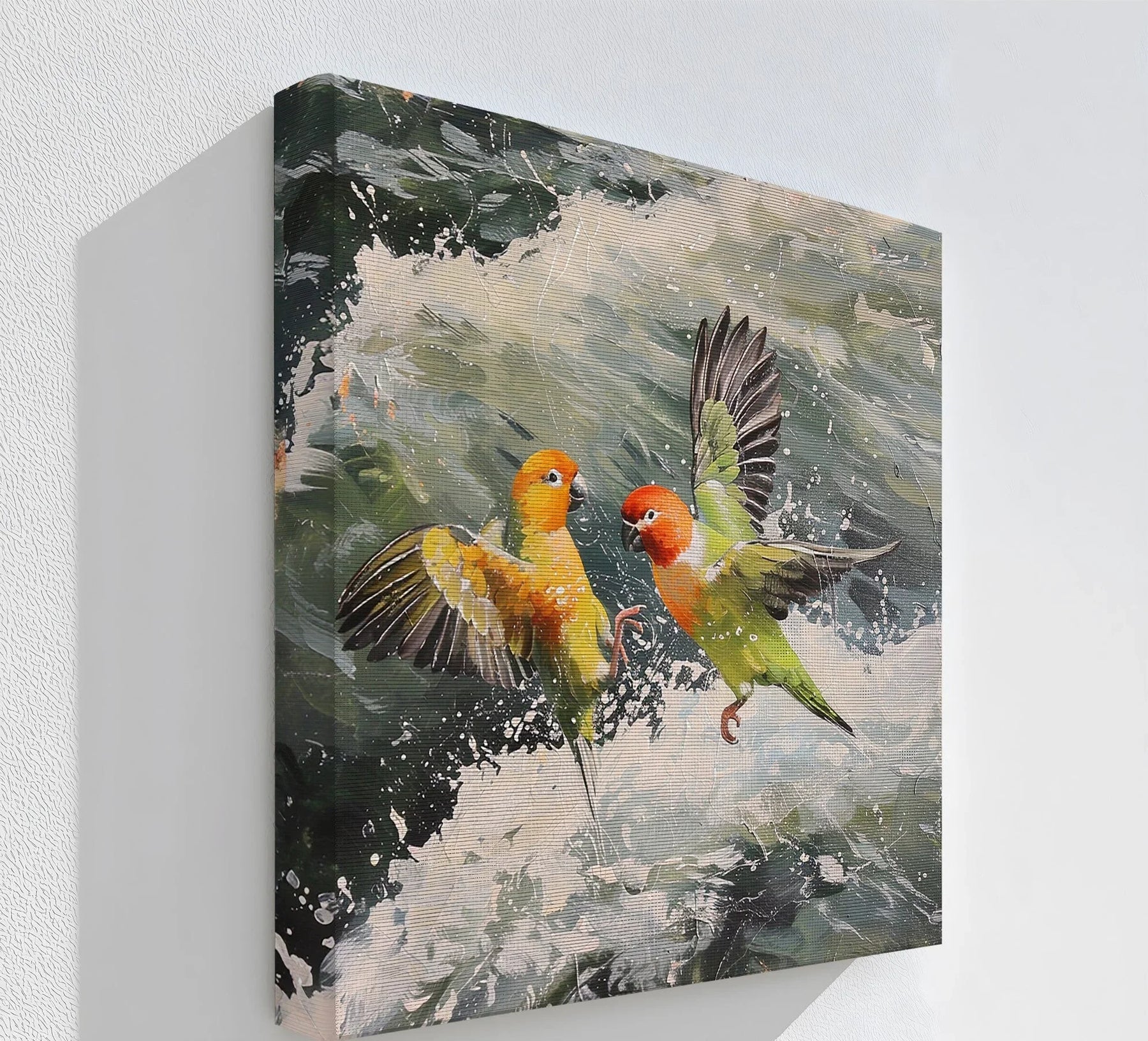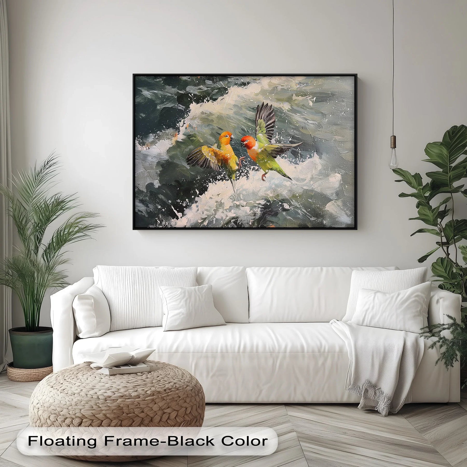 Capture the energy of the wild and the beauty of connection with this dynamic animal canvas print. Two vibrant lovebirds soar above turbulent waves, their wings outstretched in perfect harmony. The textured brushstrokes and splash effects create a sense of motion, passion, and nature’s unpredictability—making it an ideal statement piece for modern interiors or coastal-inspired homes.