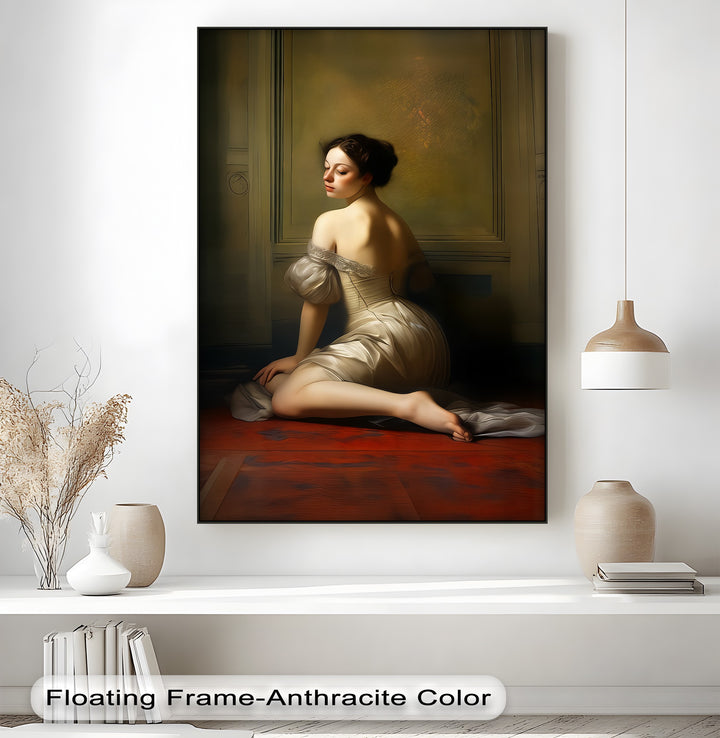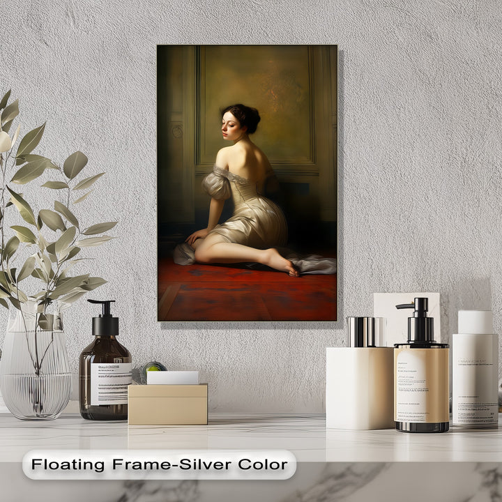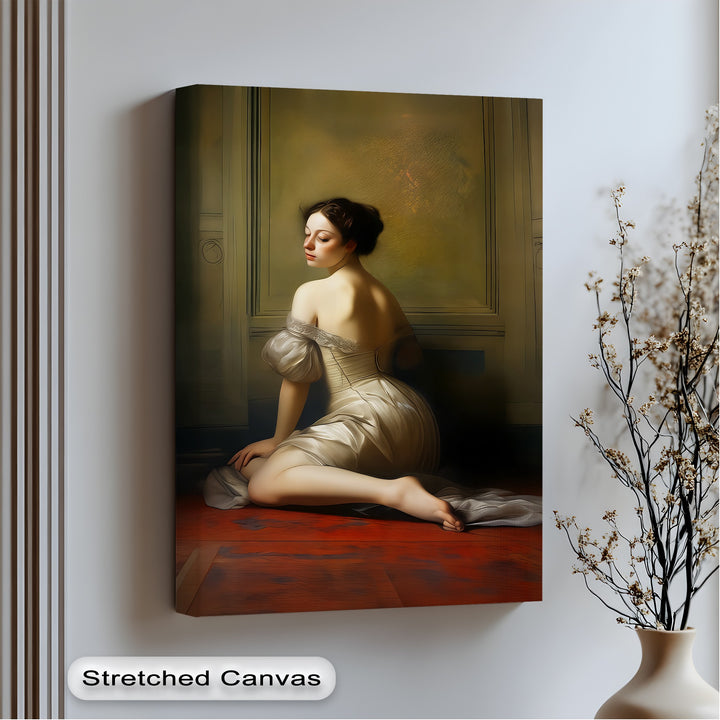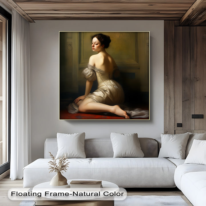 This enchanting canvas print features a noble lady in an ivory satin gown, captured in a delicate kneeling pose, her gaze cast down in poetic introspection. With glowing skin and refined features, she radiates a quiet strength and timeless grace evocative of Renaissance and Victorian portraiture.