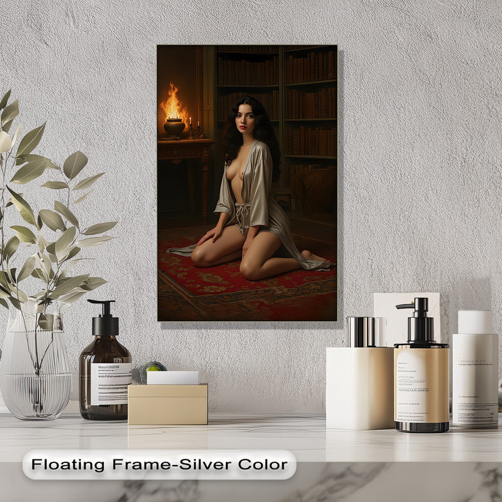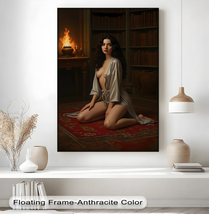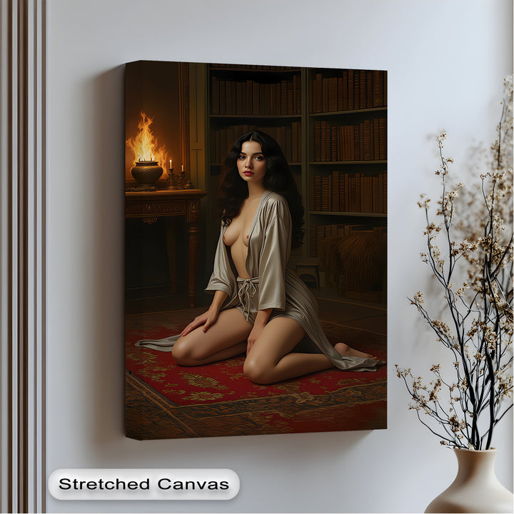 This mesmerizing canvas print features a dark-haired woman kneeling gracefully on a Persian rug, framed by a rich library and the warm glow of a fireplace. Draped in a loosely tied satin robe, her poised elegance and calm gaze evoke intimacy, mystery, and regal allure.