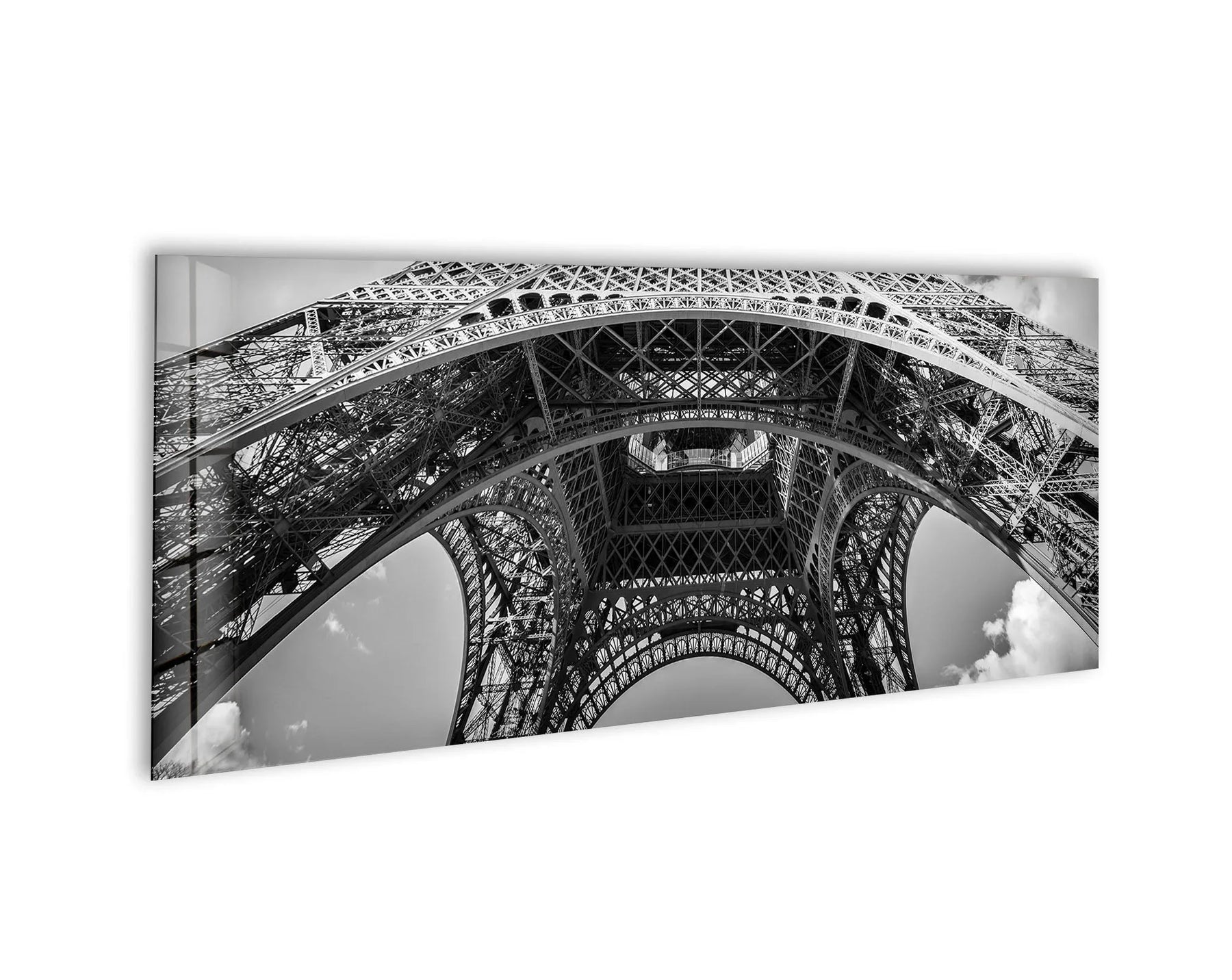 Black and white glass wall art featuring an upward architectural view of the Eiffel Tower.