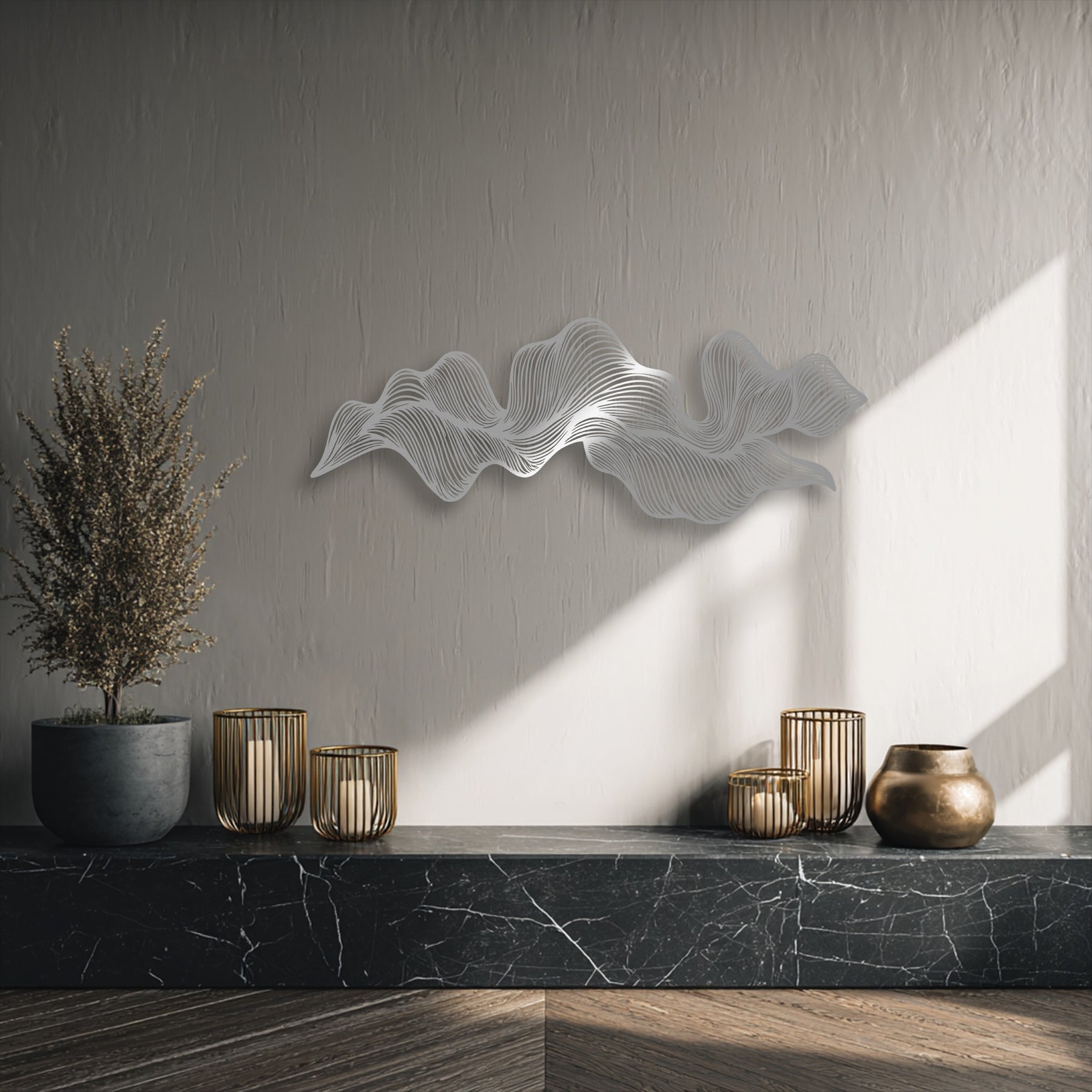 The focal point is a striking abstract wave flow decorative metal art piece, featuring intricate interlocking dark metal lines.
