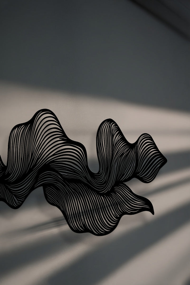 The elegant transition between the black abstract wave flow decorative metal art and the lightly shaded wall offers a subtle play of colors.