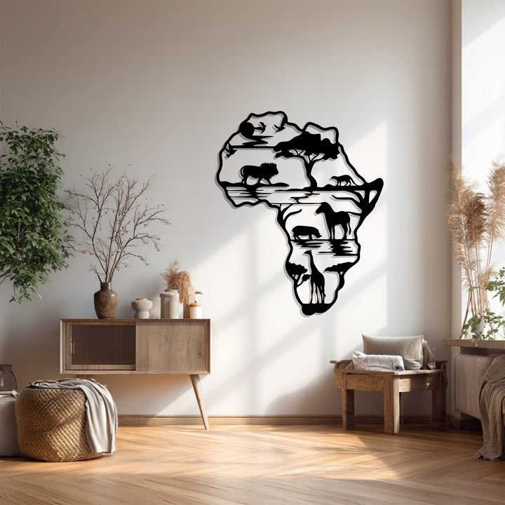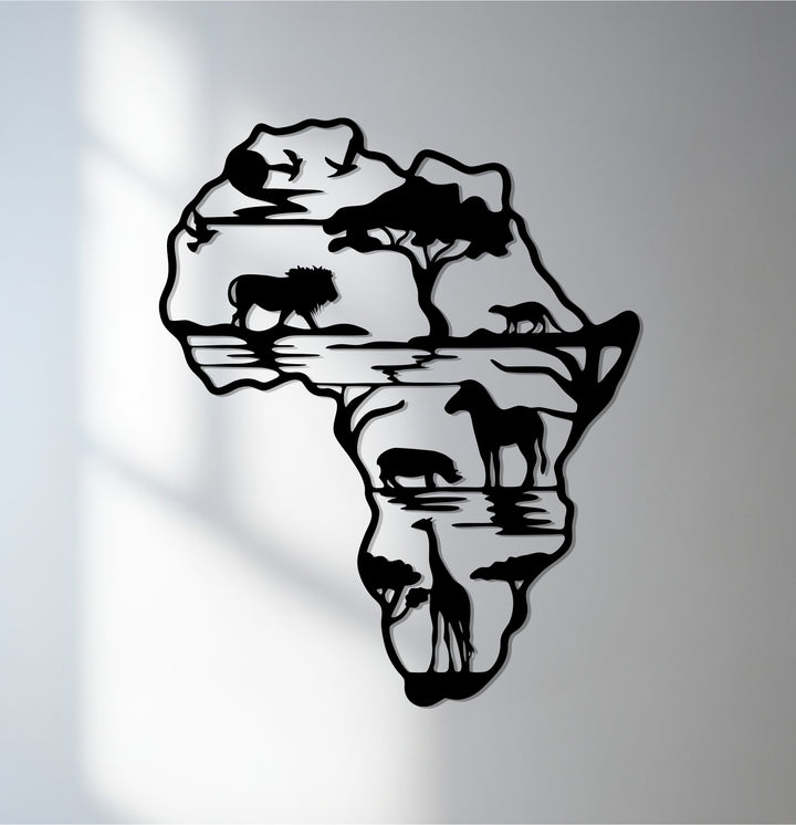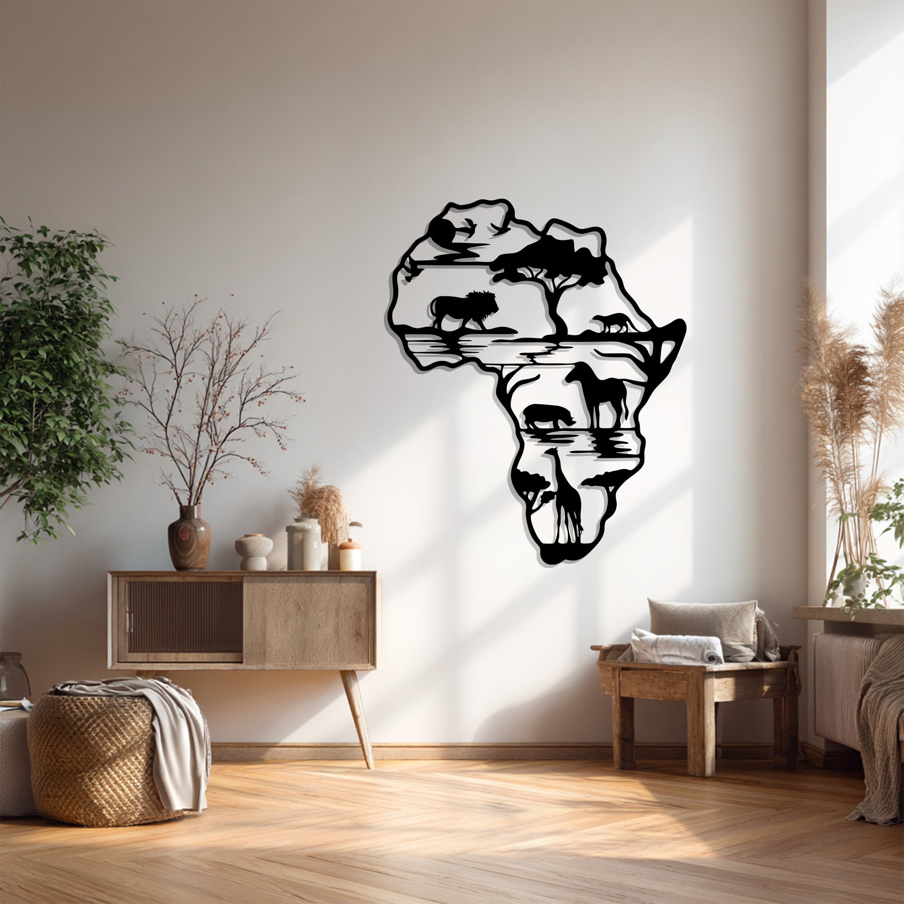 Celebrate the raw beauty of nature with the African Wilderness Metal Wall Art. This stunning piece captures the majestic spirit of Africa through intricate silhouettes of iconic wildlife — lions, elephants, giraffes, and more — all framed within the shape of the continent itself.
