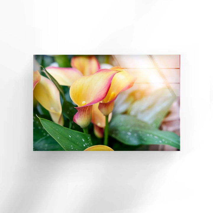Bringen Sie die Eleganz der Natur in Ihr Zuhause mit farbenfrohen Calla-Lilien blume wandbilderDie leuchtenden Farbtöne Gelb, Orange und Rosa erstrahlen vor üppigen grünen Blättern und bilden einen markanten Blickfang in jedem Raum. Dieses Glasbilder verleiht Ihrem Wohnzimmer, Schlafzimmer oder Büro eine elegante Note und ist das perfekte Dekorationsstück für Natur- und Blumenliebhaber.