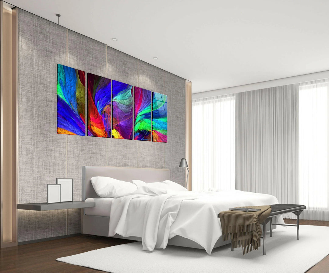 Erhellen Sie Ihren Raum mit dem farbenfrohen Neon Abstract 5-teiliges Wandbild, eine atemberaubende Explosion wirbelnder Farben, die jedem Raum Leben einhauchen. Dieses Wandbild aus Glas vereint leuchtende Rot-, Blau-, Grün- und Lilatöne in einem faszinierenden abstrakten Design, das Ihrer Einrichtung ein kräftiges und dynamisches Statement verleiht.