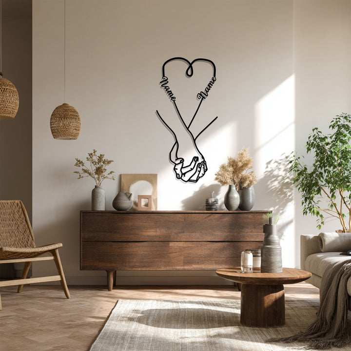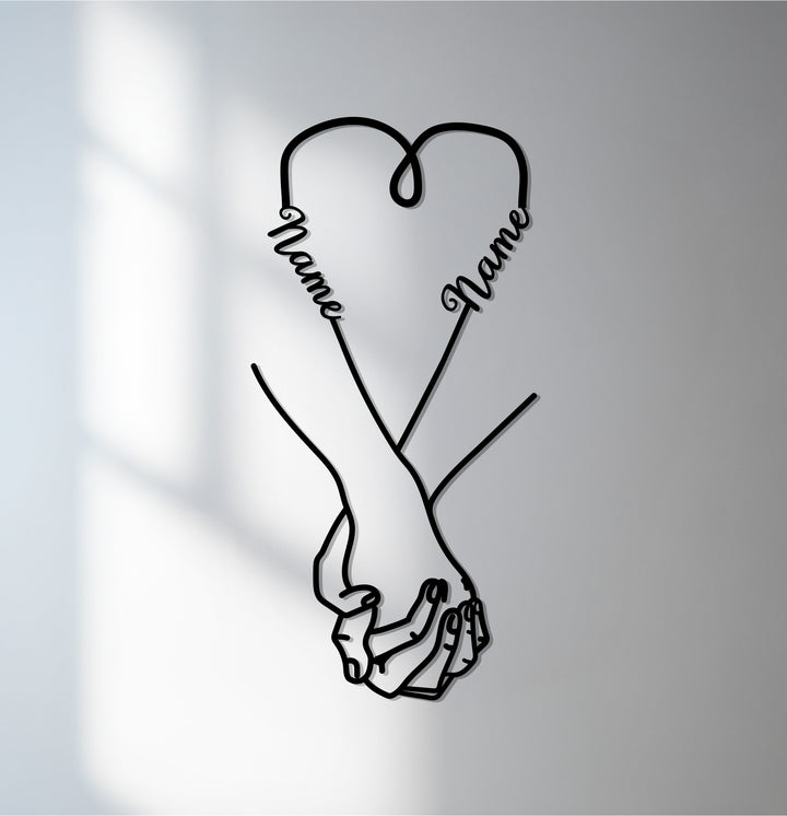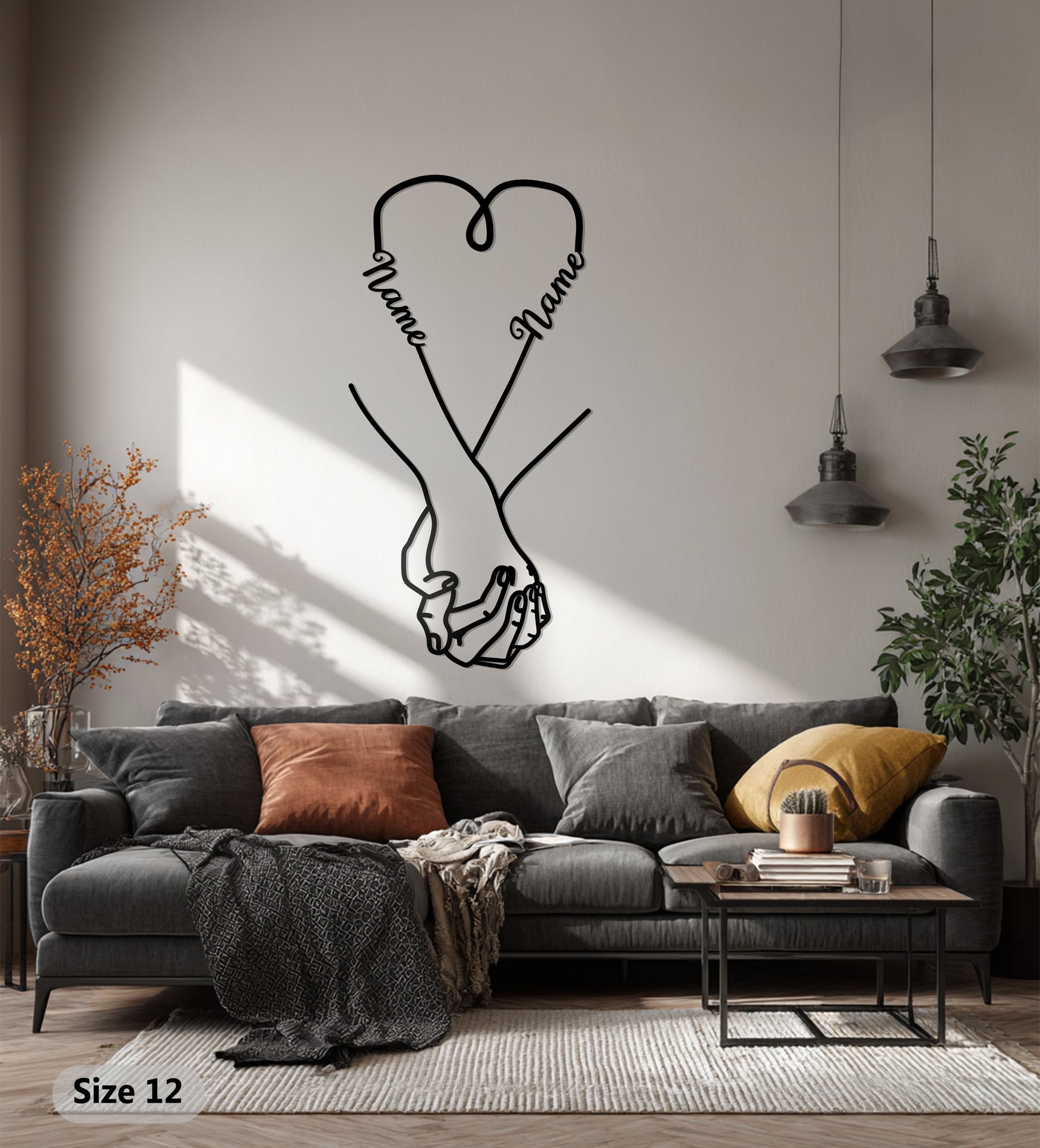 Celebrate love and togetherness with this Personalized Holding Hands Metal Wall Art. Designed with two hands gently intertwined beneath a heart outline, this romantic piece allows you to add custom names on each side, making it a truly unique symbol of connection.
