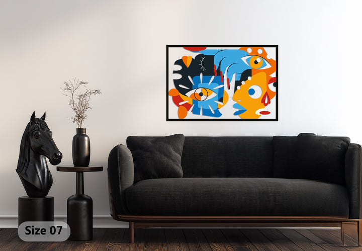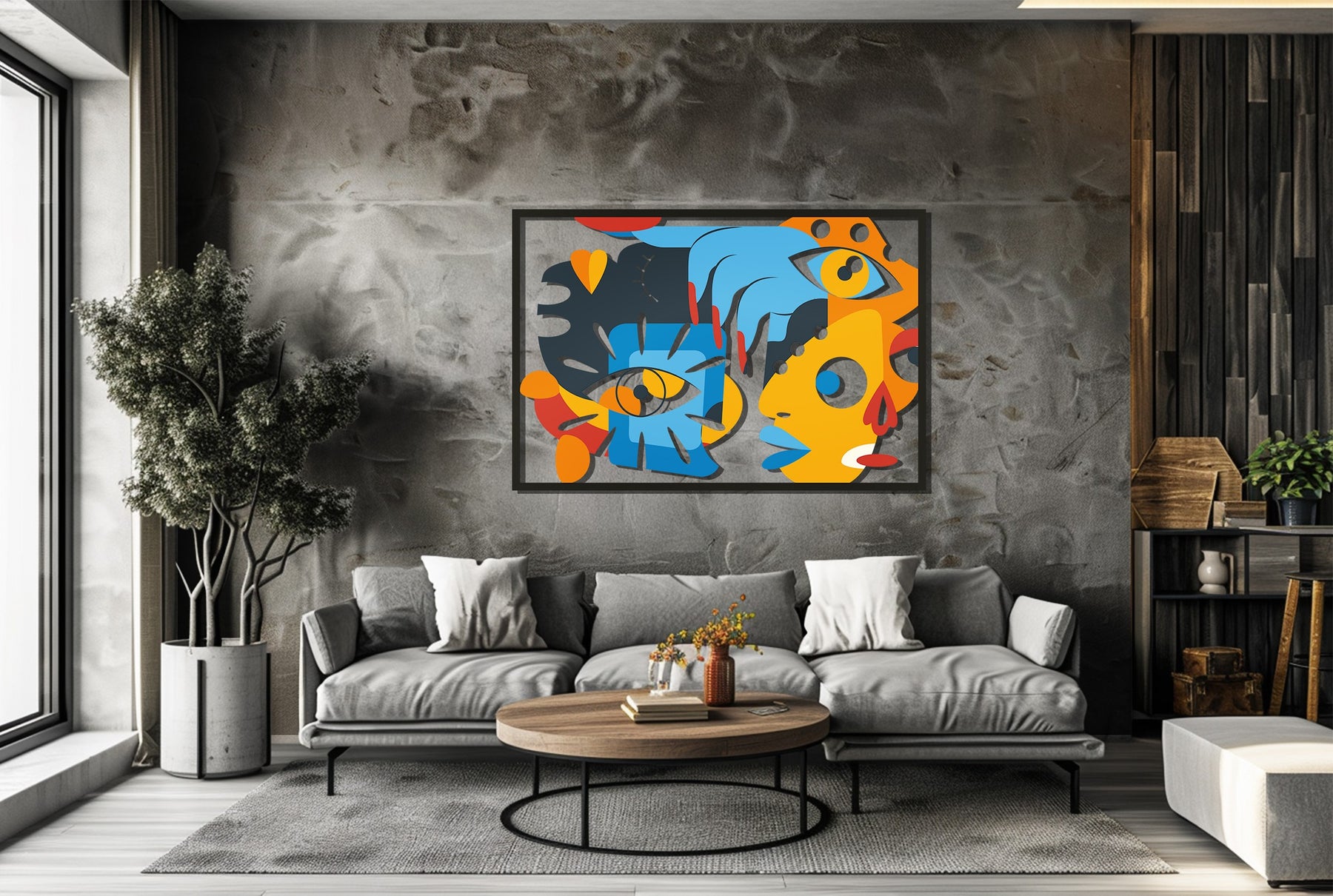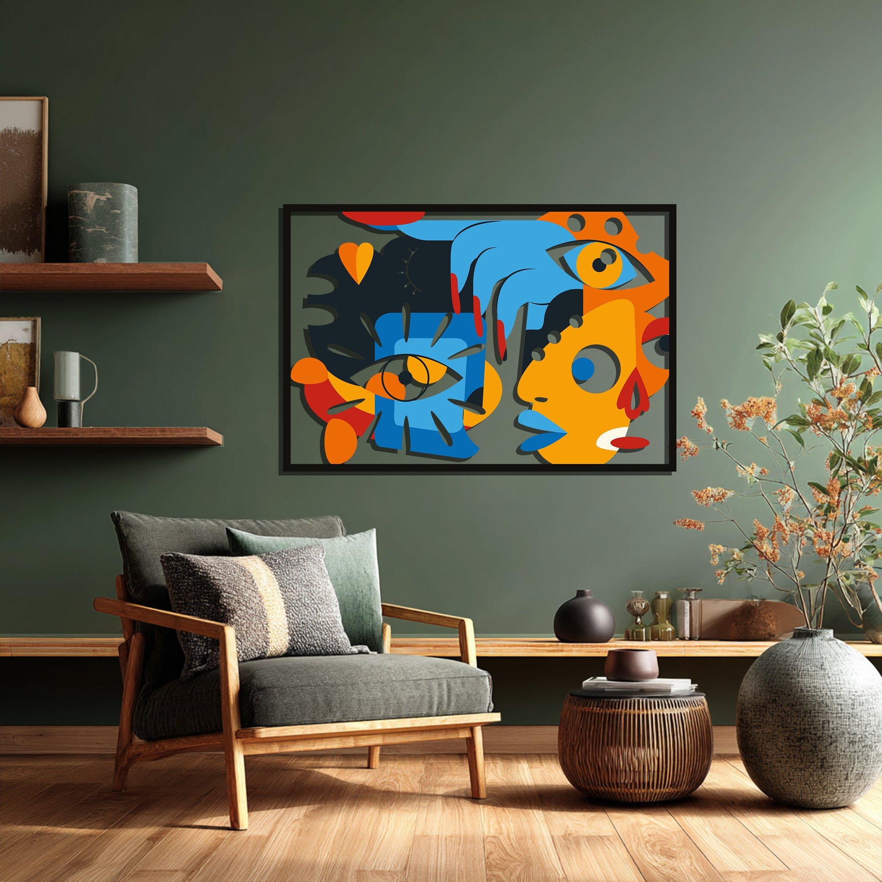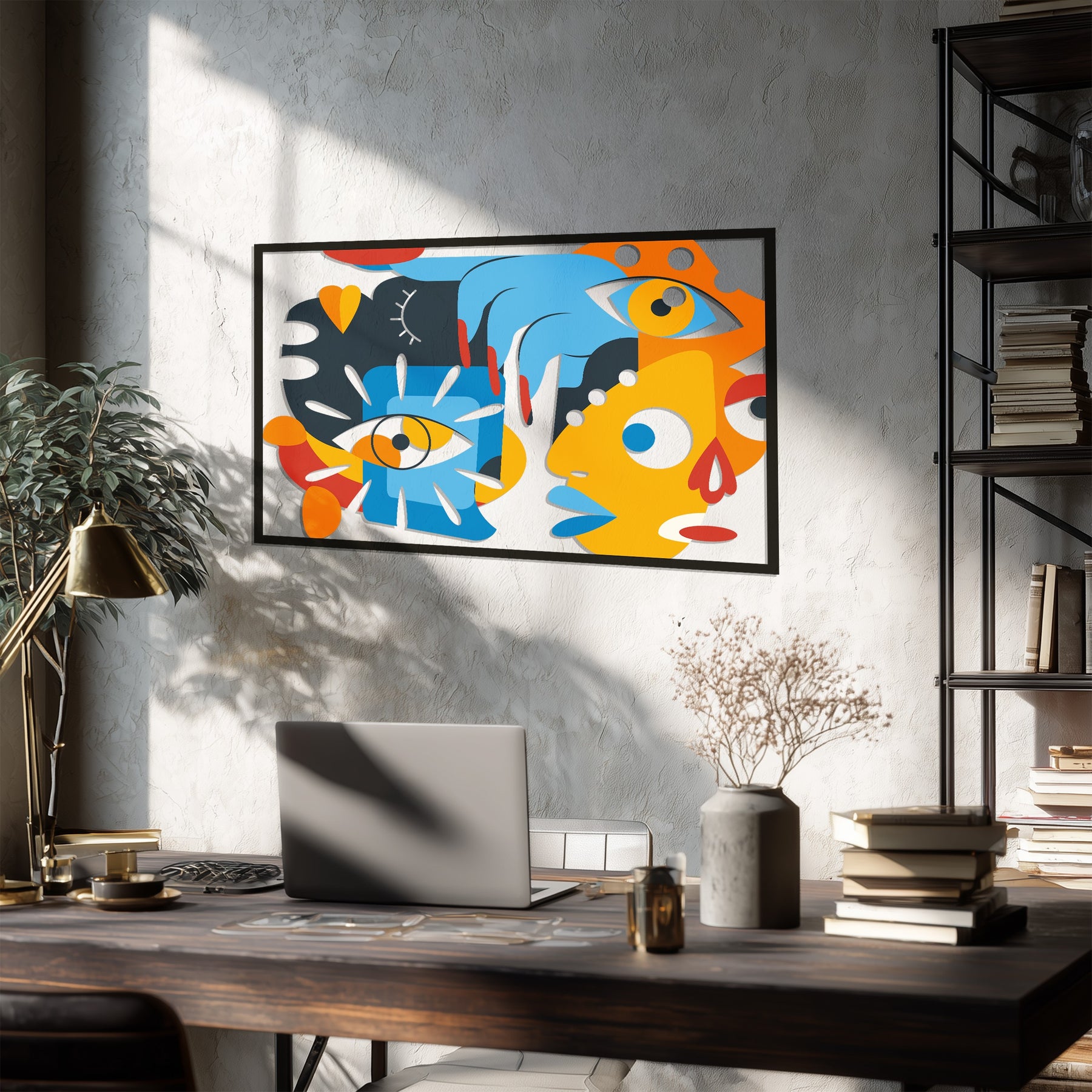 Dive into the vibrant world of Fragmented Emotions Metal Wall Art, where color and emotion collide in a stunning abstract composition. The bold interplay of blue, orange, red, and yellow forms expressive faces and surreal shapes that evoke the raw complexity of human emotion. Inspired by cubism and modern art aesthetics, this piece brings depth, contrast, and artistic intensity to your walls.