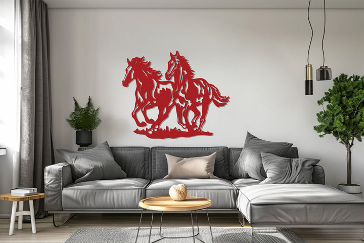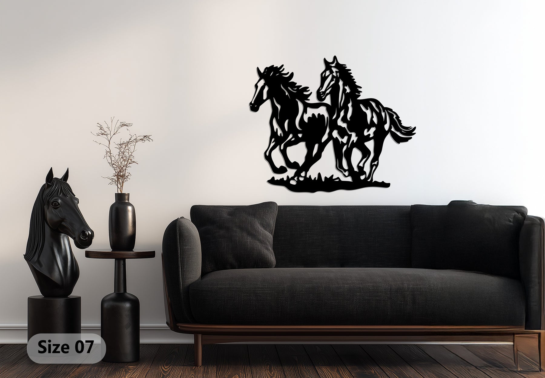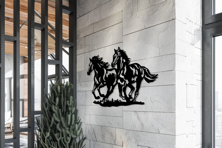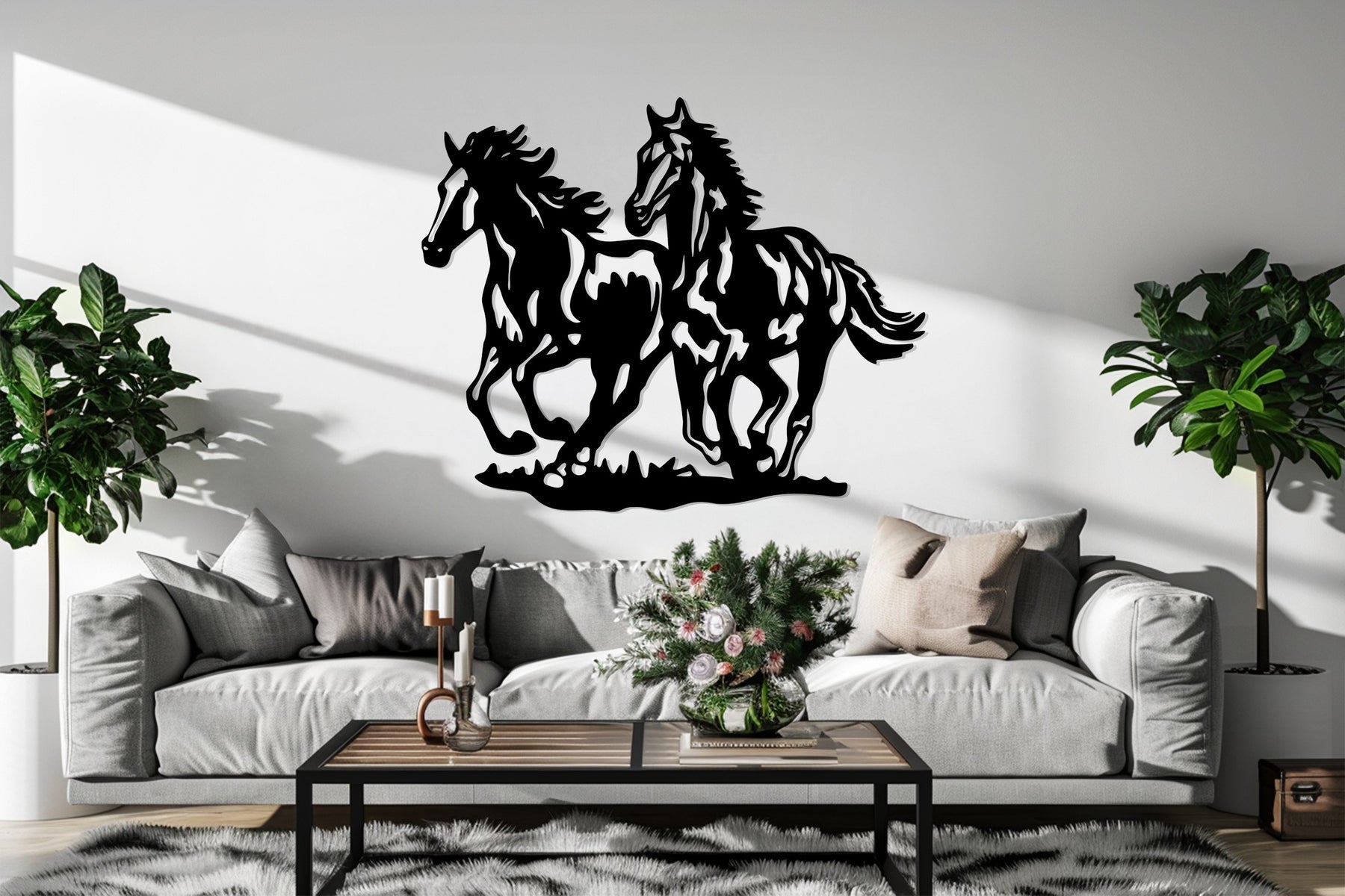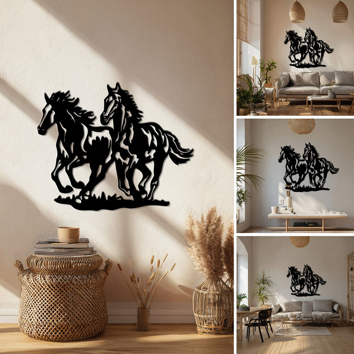 Celebrate the beauty, strength, and grace of nature with the Galloping Freedom Metal Wall Art. This dynamic design captures two horses in full stride, their manes flowing and bodies full of motion — symbolizing power, freedom, and harmony. The sleek black metal finish adds a bold statement to any interior.