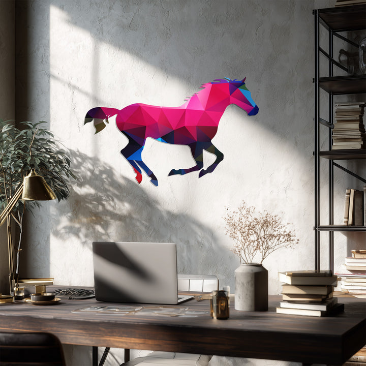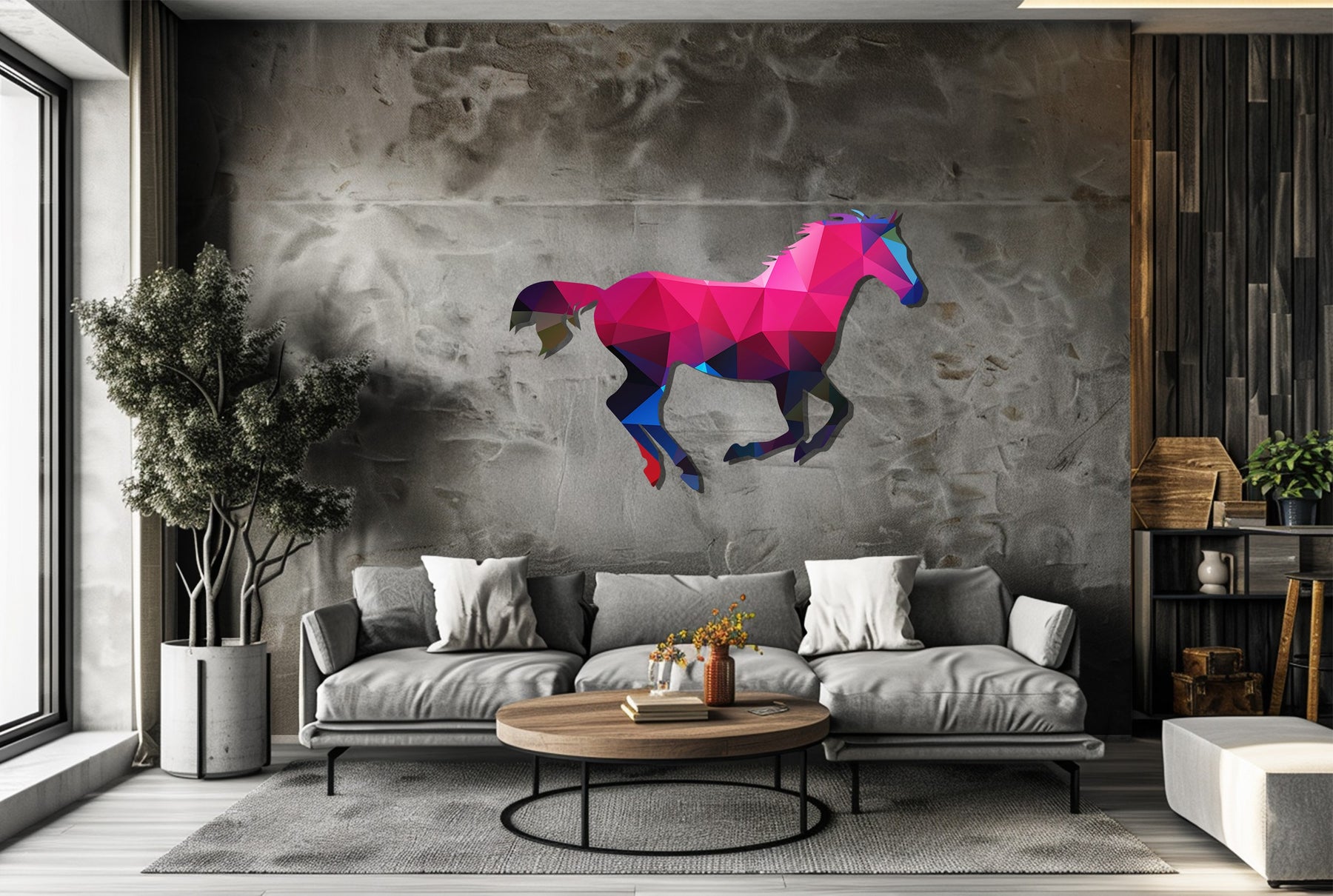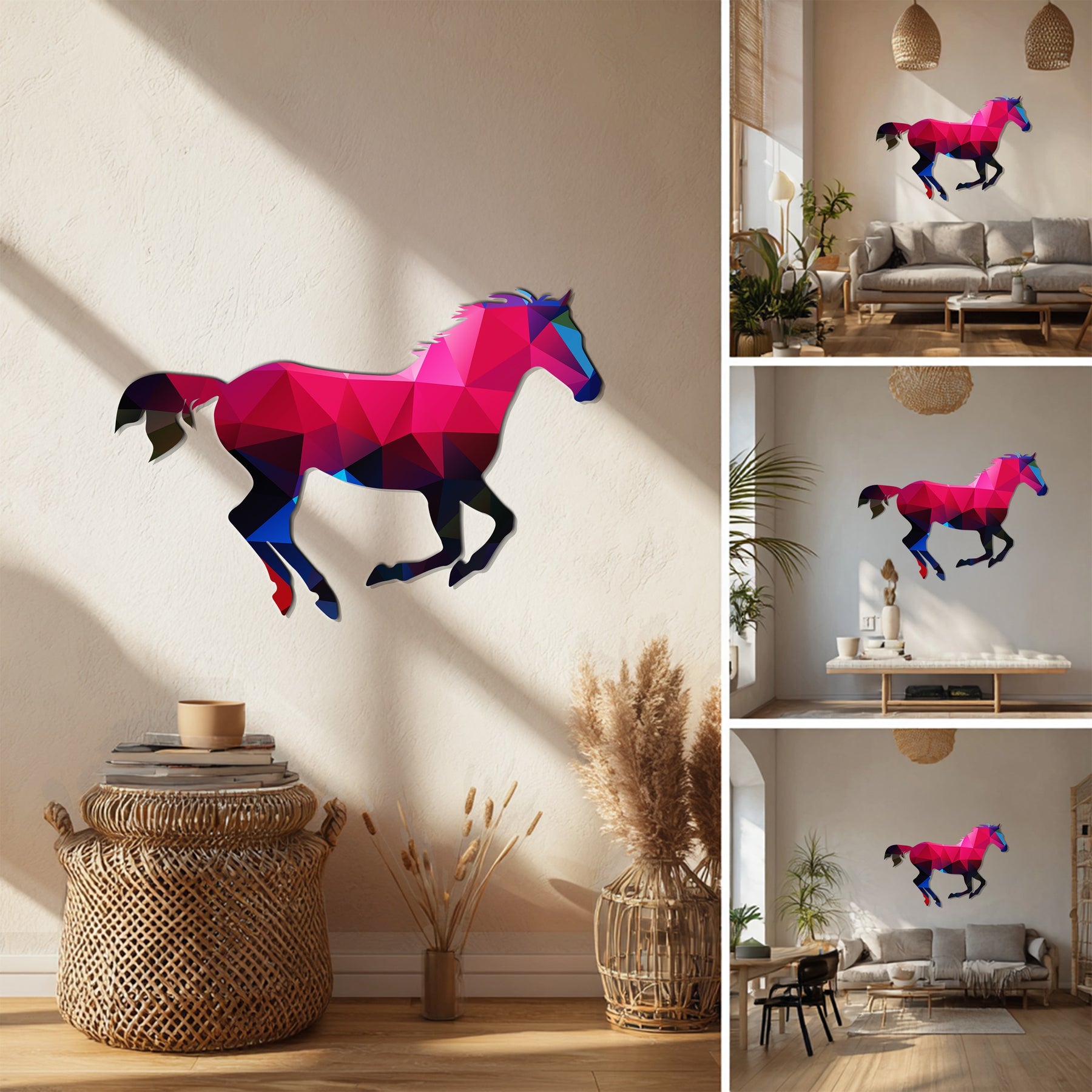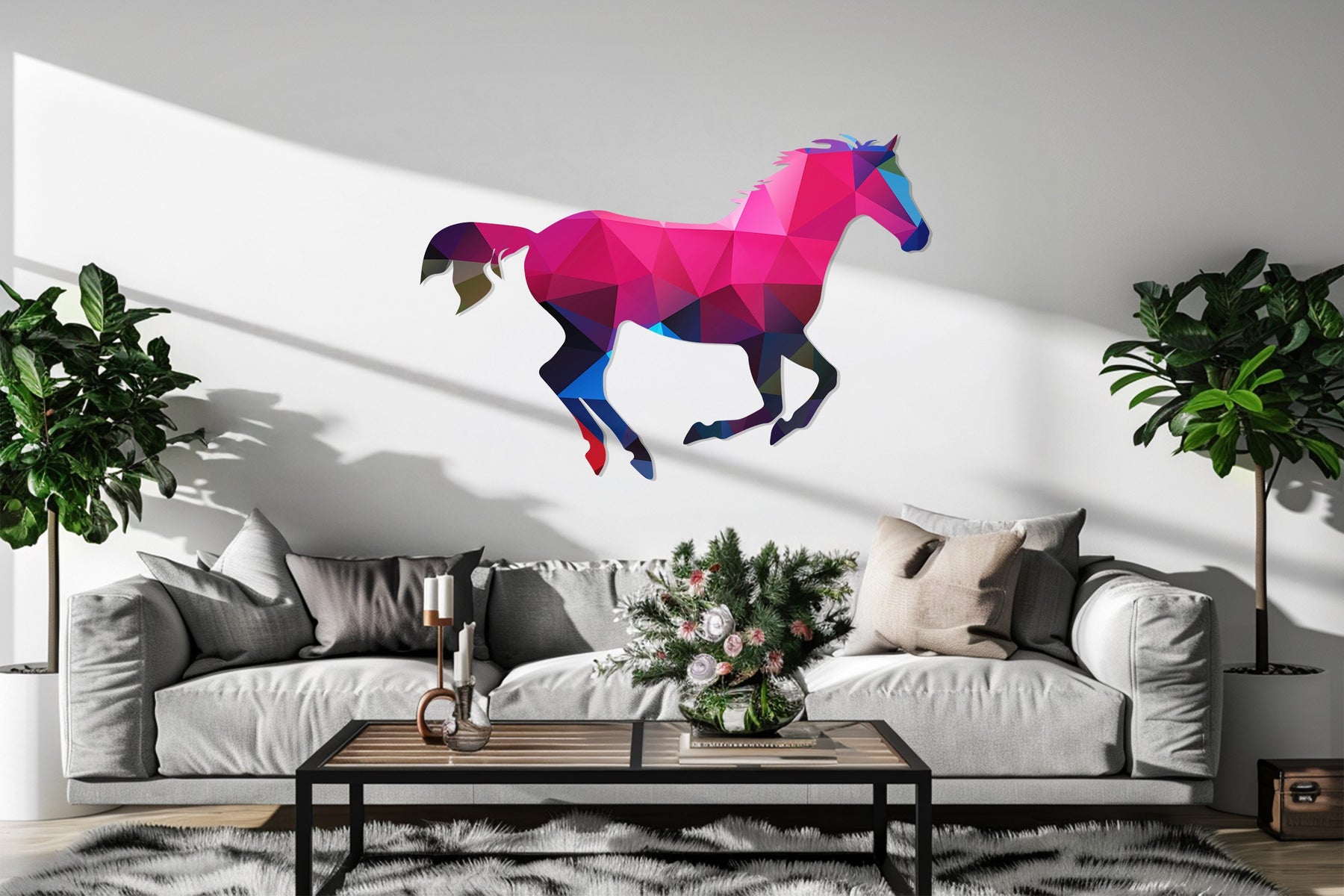 Elevate your interior with the Geometric Running Horse Metal Wall Art, a bold fusion of modern minimalism and dynamic energy. This striking design features polygonal geometry in radiant shades of magenta, blue, and violet, forming a galloping horse that embodies strength, motion, and freedom.