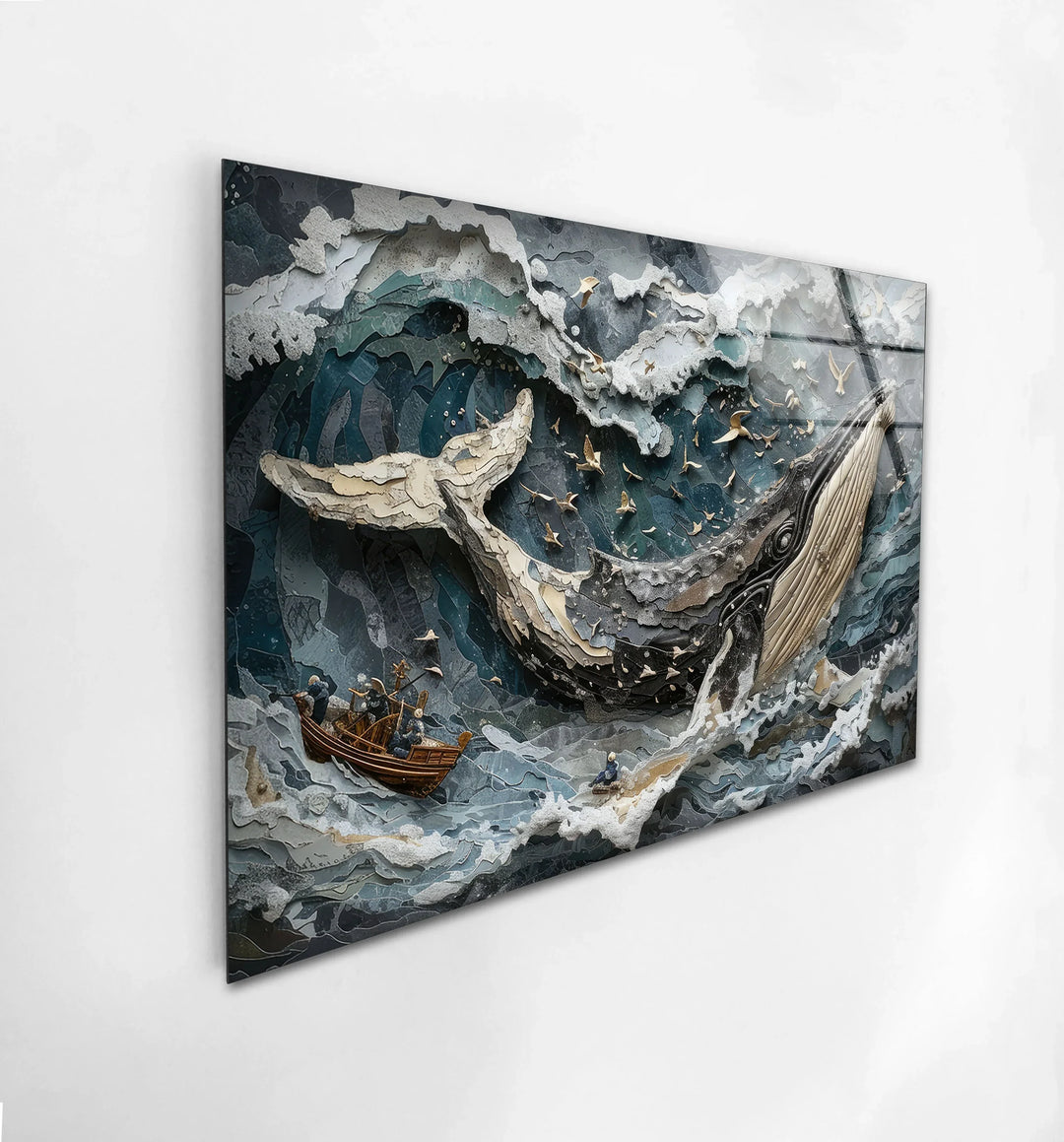 Tauchen Sie mit diesem prächtigen Riesenwal in das Herz des Ozeans ein Tierwelt Malerei. Dieses fesselnde Glas Wandkunst erweckt die Erhabenheit der Tiefsee zum Leben und zeigt einen riesigen Wal inmitten rollender Wellen und komplizierter Meeresdetails.