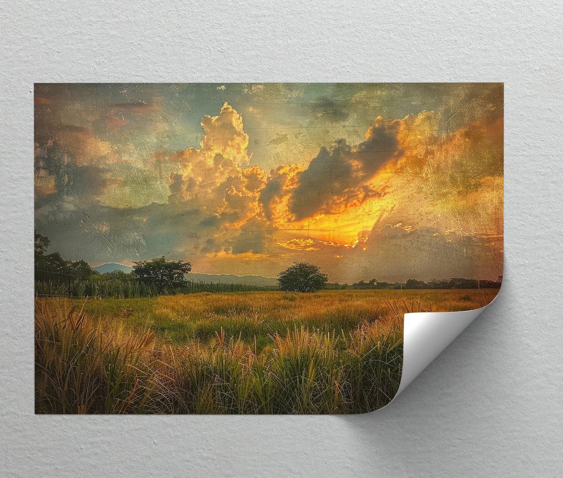 Bathed in warm, golden light, this rustic canvas print captures a dramatic sunset igniting the clouds above a windswept field. The painterly texture and vintage aesthetic add depth and nostalgia, evoking the quiet beauty of rural landscapes just before twilight. A perfect piece for cozy interiors, farmhouse-style decor, or anyone drawn to the golden-hour glow.