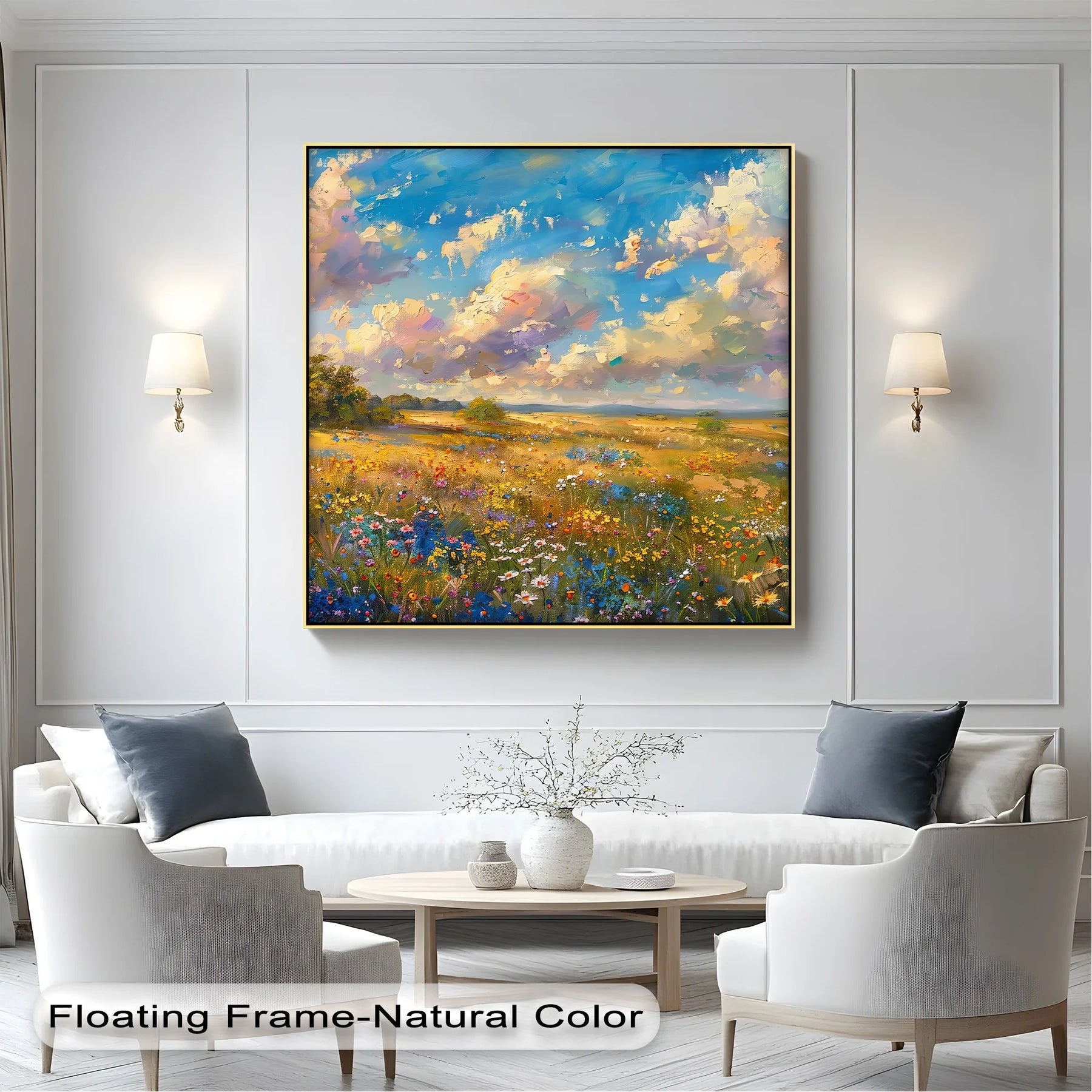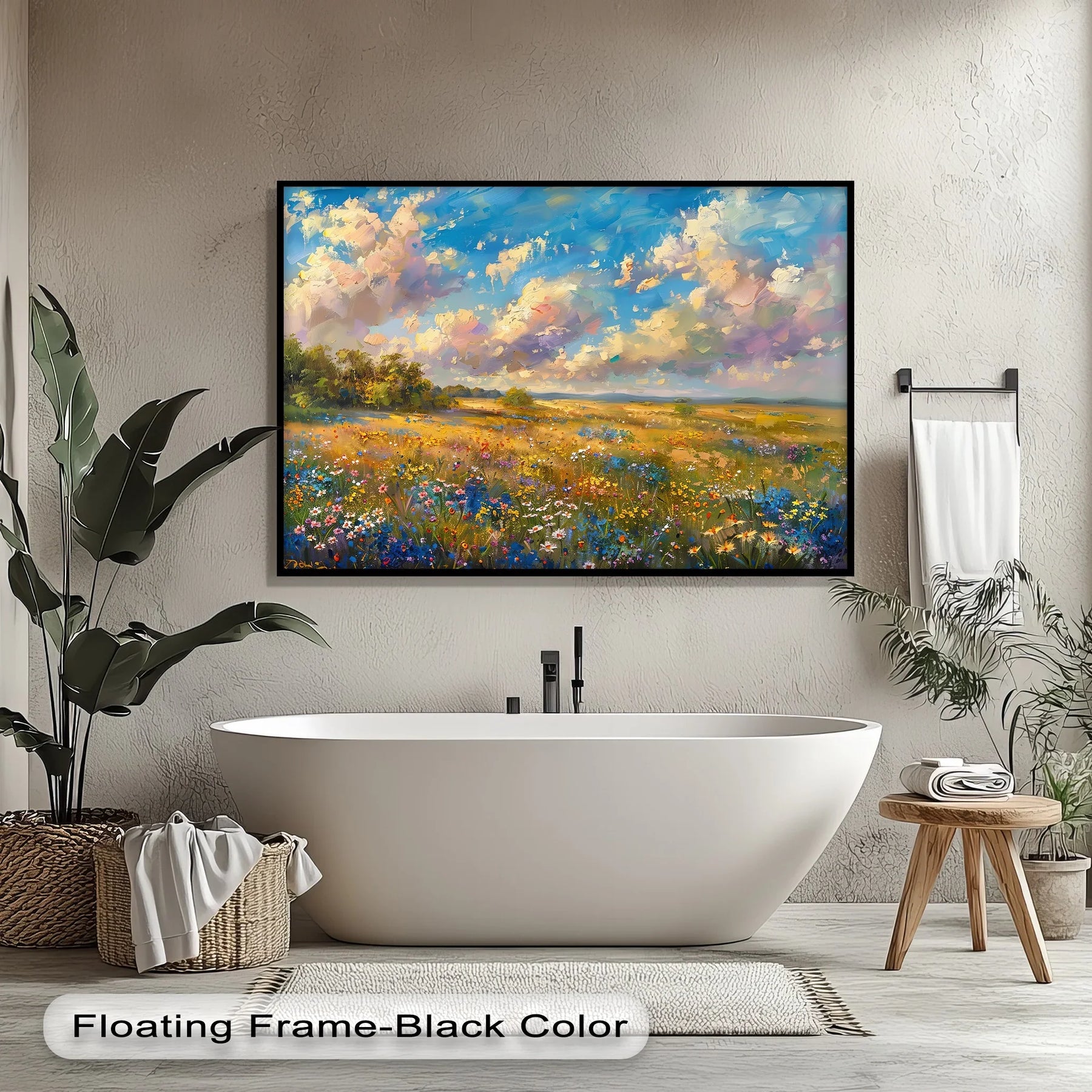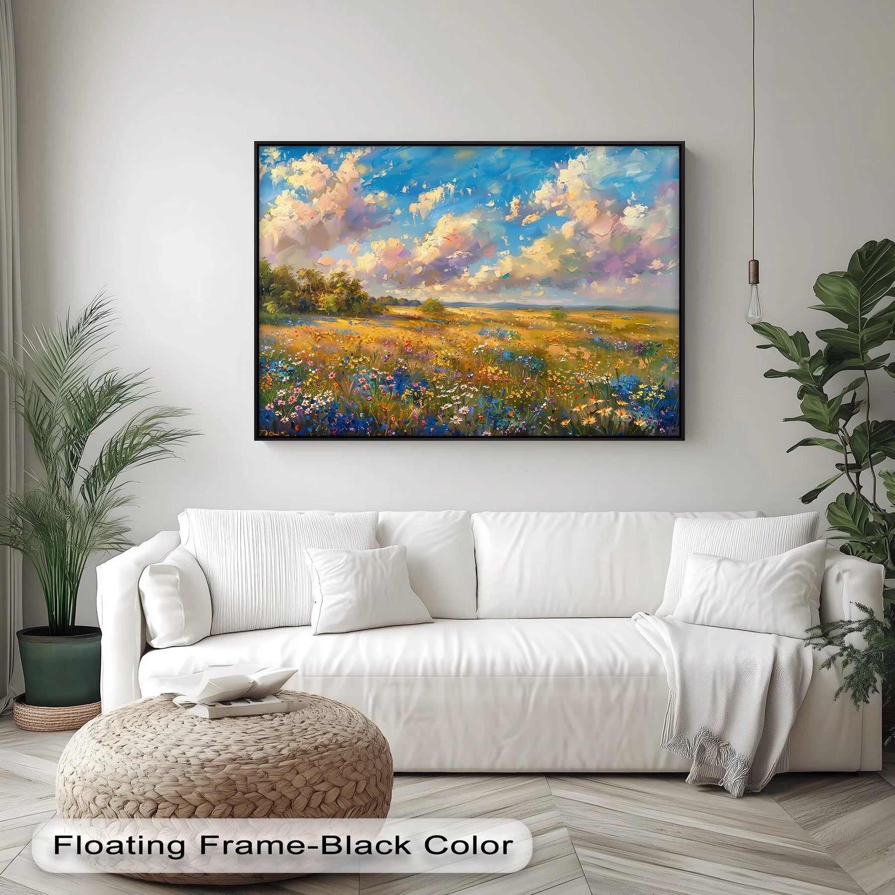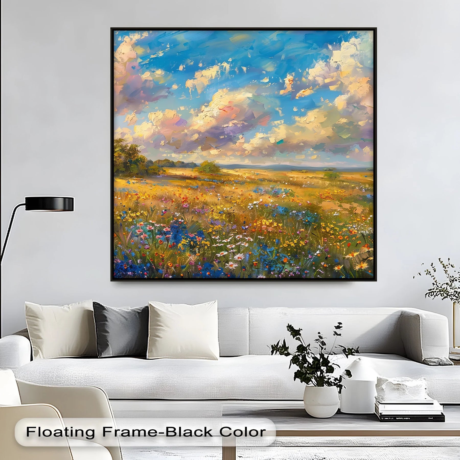 Step into an endless summer with Golden Meadow Bloom, a radiant landscape canvas print featuring rolling wildflower fields under a painterly sky. Brilliant blues, fiery reds, and golden yellows dance across the prairie, framed by lush greenery and distant hills. The sweeping brushstrokes and vivid colors create a sense of movement and peace—perfect for adding warmth and life to any room.