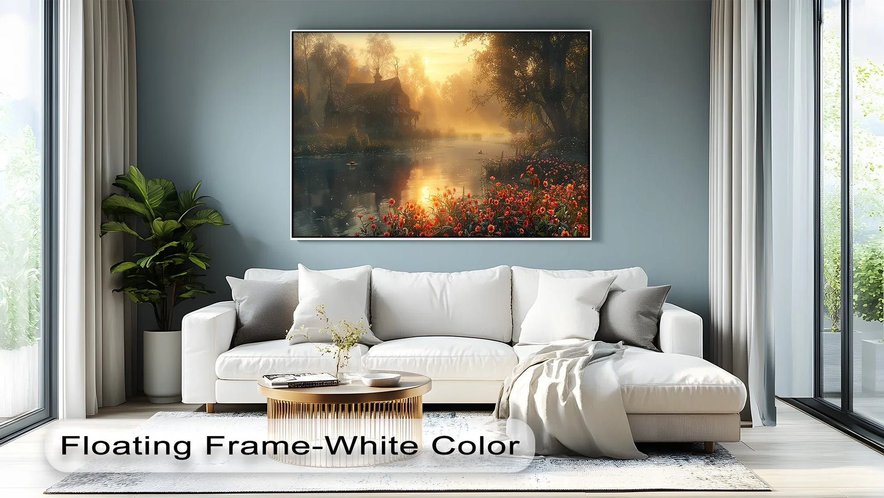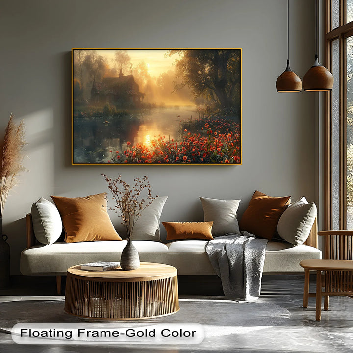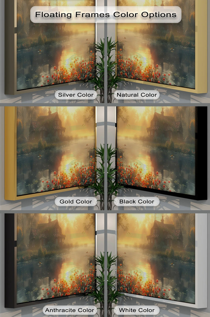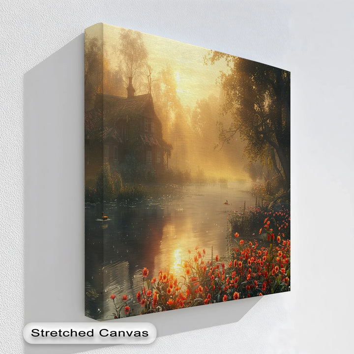 Step into a fairy tale with this enchanting canvas print, where golden sunlight bathes a riverside cottage in dreamy warmth. Lush flowers bloom in the foreground, while light sparkles on the water, inviting feelings of peace, nostalgia, and gentle wonder. Ideal for cozy reading nooks, farmhouse interiors, or nature-inspired decor, this scene captures the magic of morning light and rural serenity.