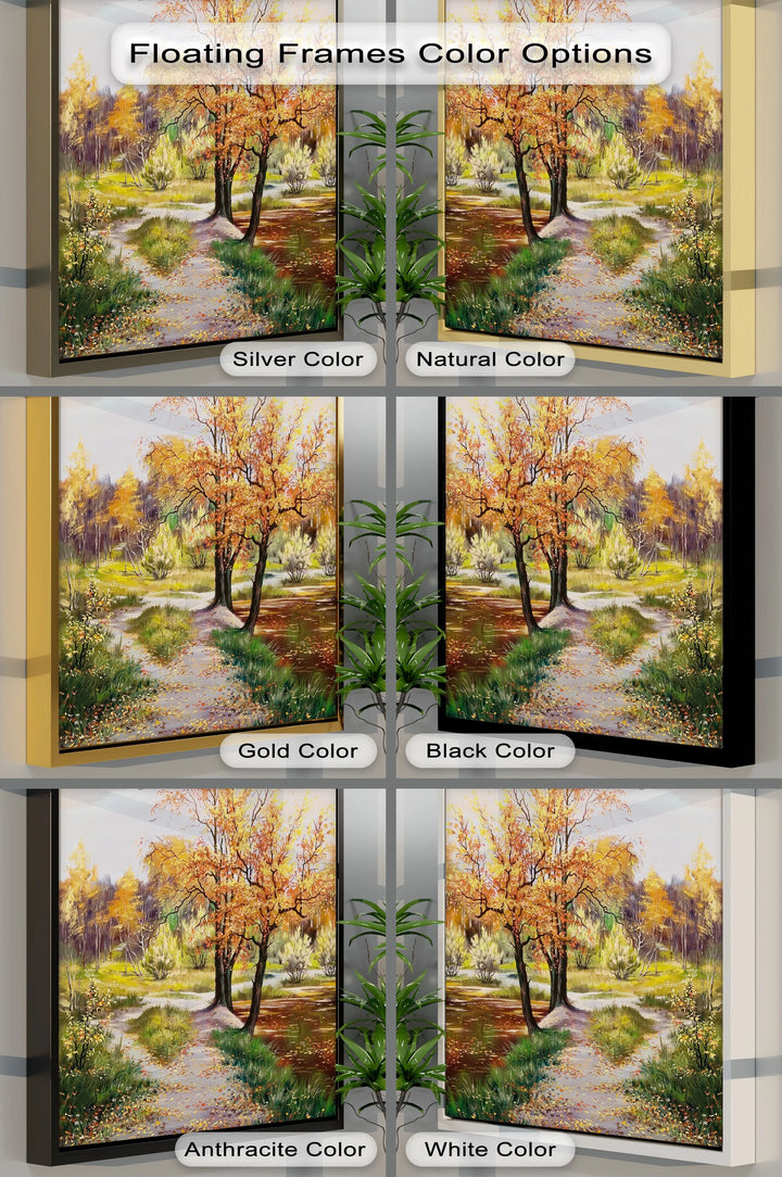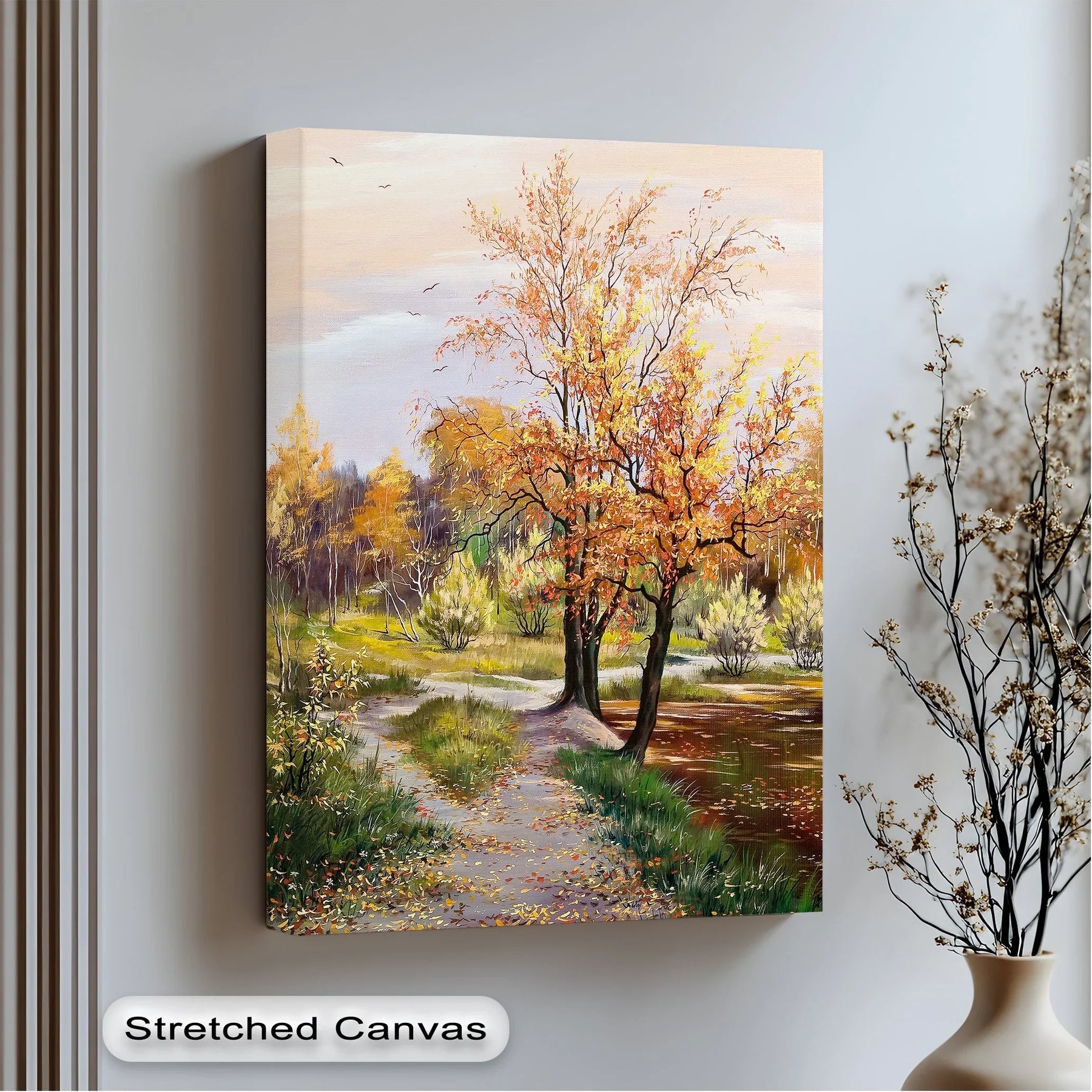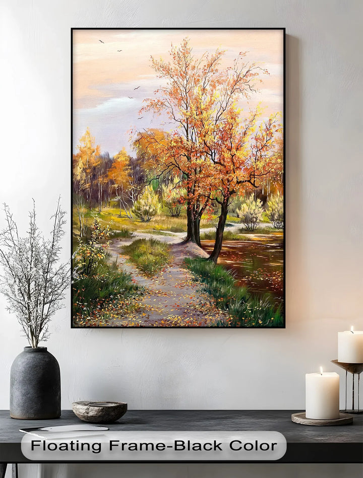 Step into the heart of autumn with this vibrant fall forest trail canvas print. The scene features a golden-leaved path winding through trees dressed in warm hues of amber, russet, and gold. Birds soar above a soft sky, while gentle reflections shimmer across a peaceful pond. This artwork captures the fleeting beauty of nature's most colorful season, evoking feelings of nostalgia, peace, and reflection.