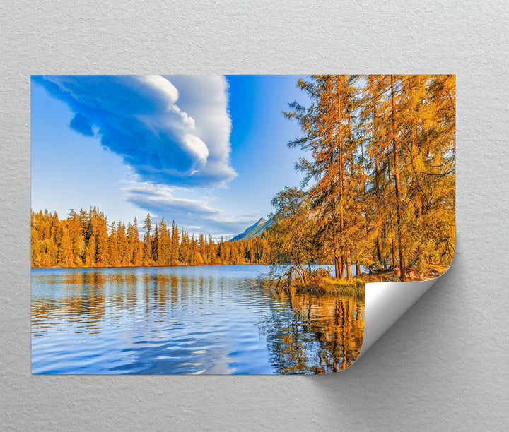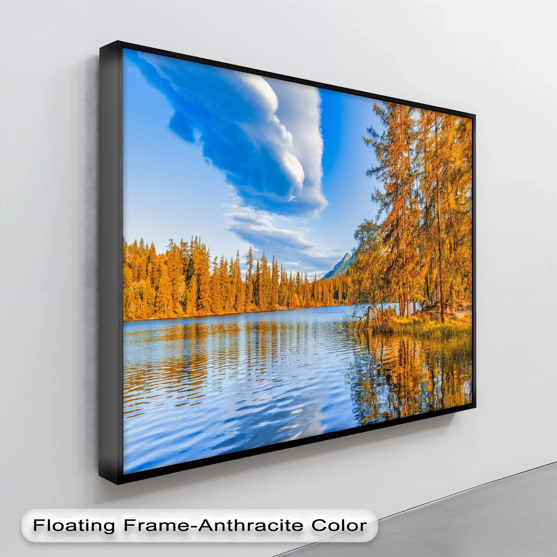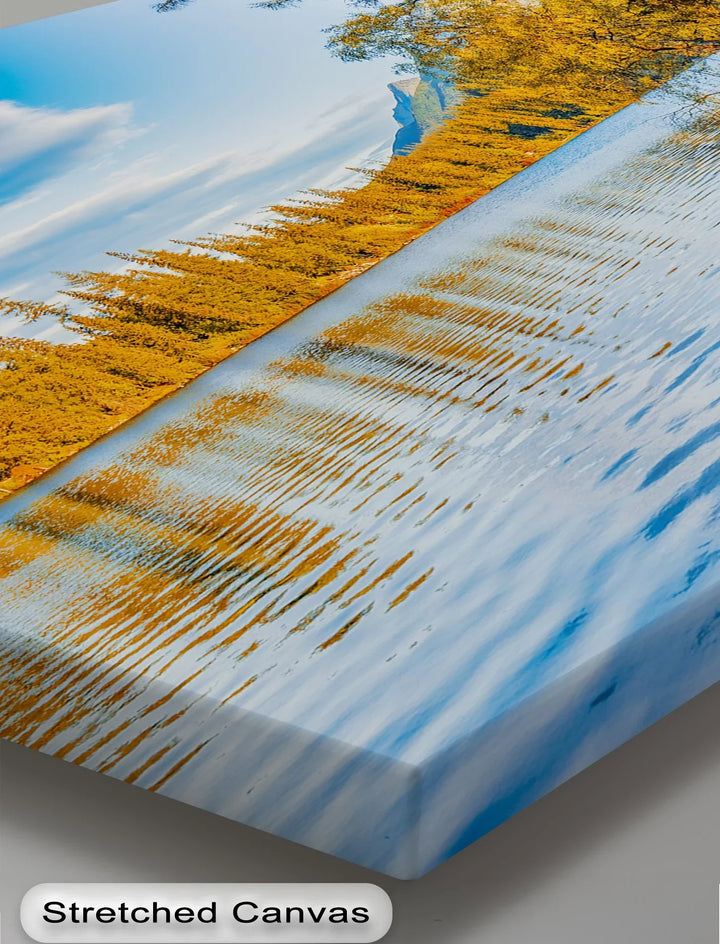 Celebrate the quiet beauty of fall with this vibrant canvas print featuring a golden pine forest mirrored in a still mountain lake. With crisp blue skies, dramatic clouds, and the serene peak in the distance, this scene radiates peaceful solitude and the magic of nature’s seasonal transformation. Perfect for creating a warm, cozy atmosphere in any space.