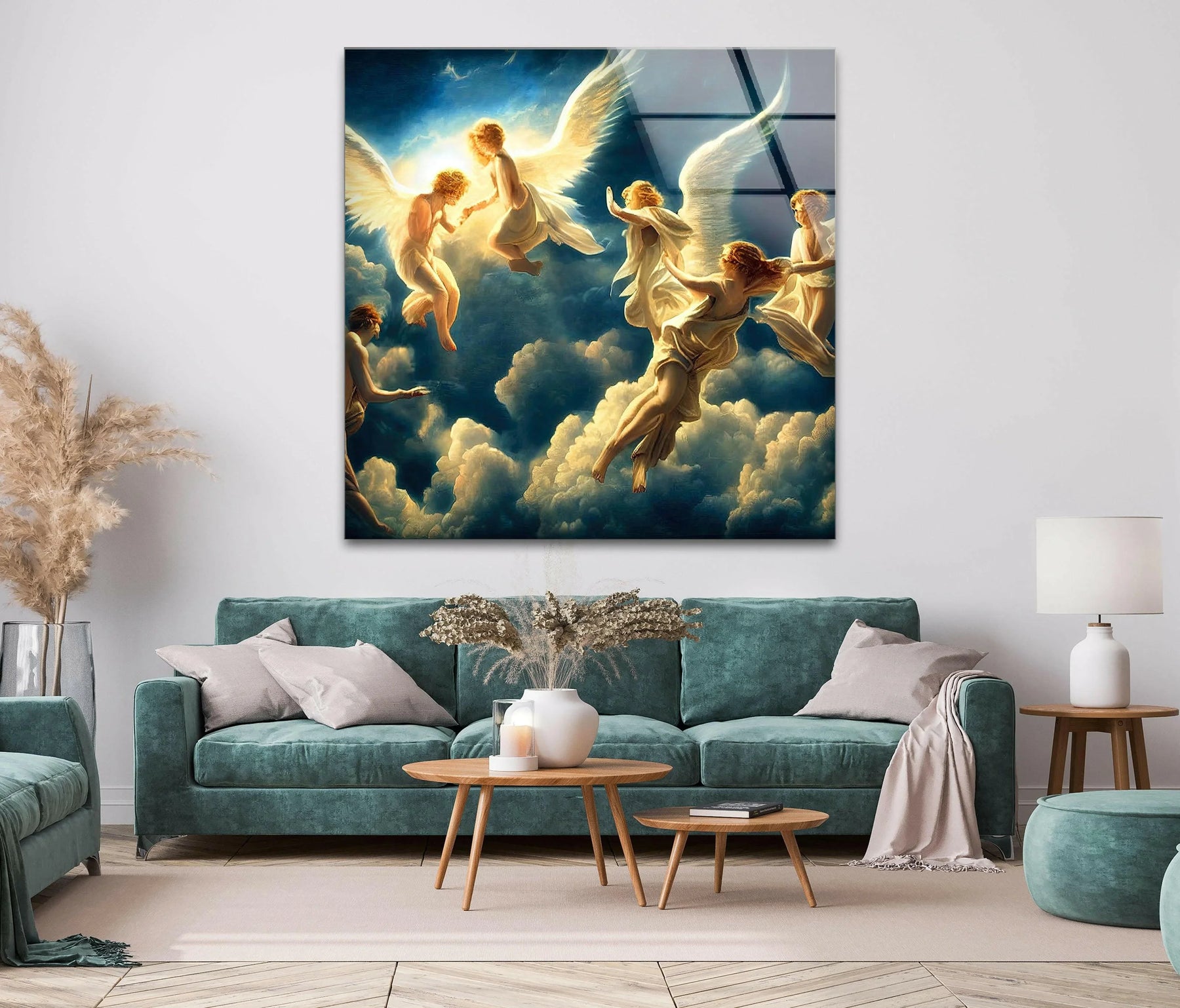 Tauchen Sie Ihren Raum in himmlische Anmut mit diesem atemberaubenden Himmel und Engel katholische Kunstwerke, gefertigt in elegantem Glasbilder. Dieses Kunstwerk zeigt heitere Engel, die inmitten strahlender Wolken schweben. Es verkörpert Frieden, Hingabe und göttliche Schönheit und ist somit eine faszinierende Ergänzung für jeden heiligen oder Wohnraum.