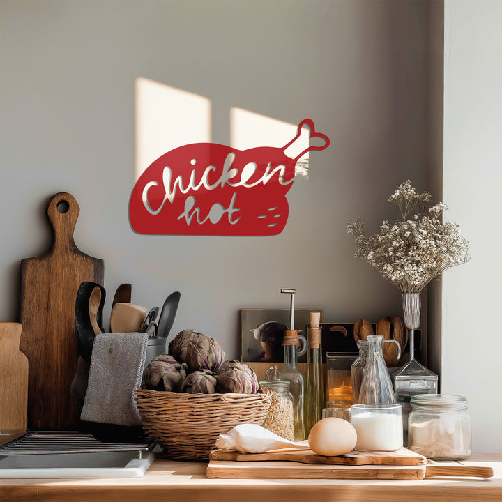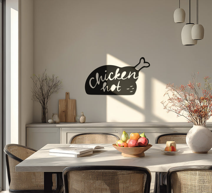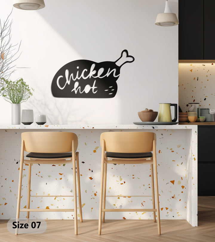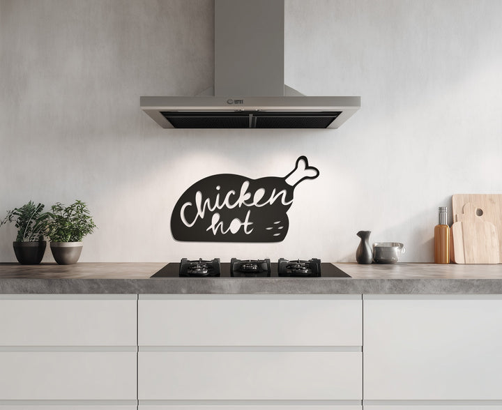 Spice up your kitchen décor with the Hot Chicken Silhouette Metal Wall Art! Featuring a sleek black metal design of a chicken leg with playful “Chicken Hot” lettering, this wall piece adds both humor and warmth to your cooking space.