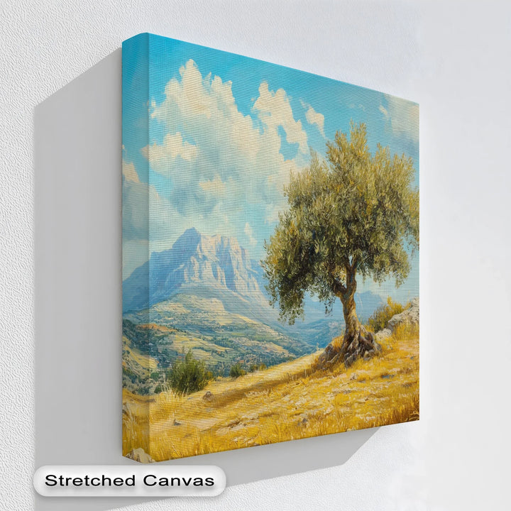 Bask in the warmth of the Mediterranean with this beautifully detailed canvas print. A solitary olive tree stands gracefully against golden fields and sunlit mountains, evoking peace, tradition, and timeless natural beauty. Gentle brushstroke textures and soft hues of ochre, sky blue, and sage green create a tranquil escape—perfect for adding rustic charm to any space.