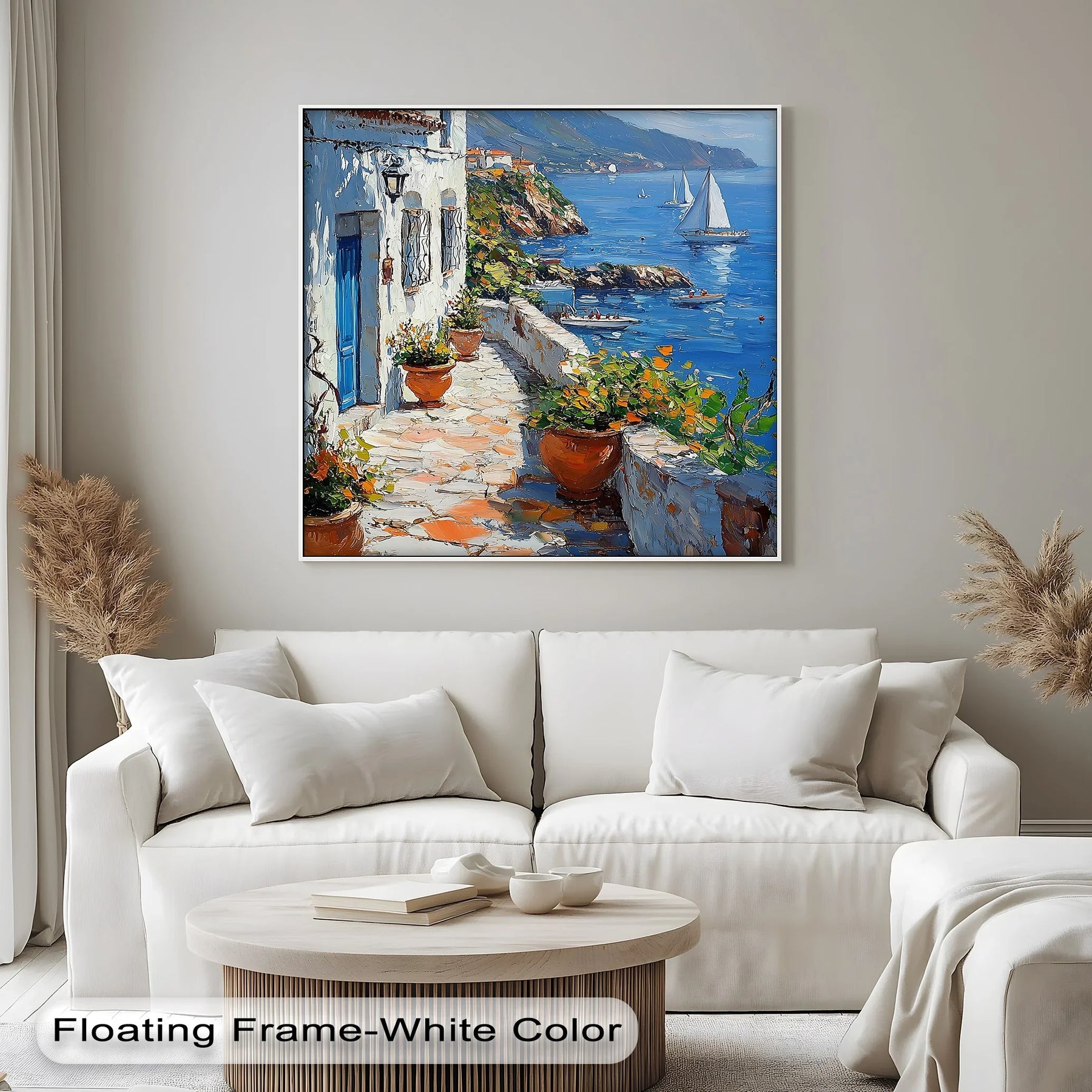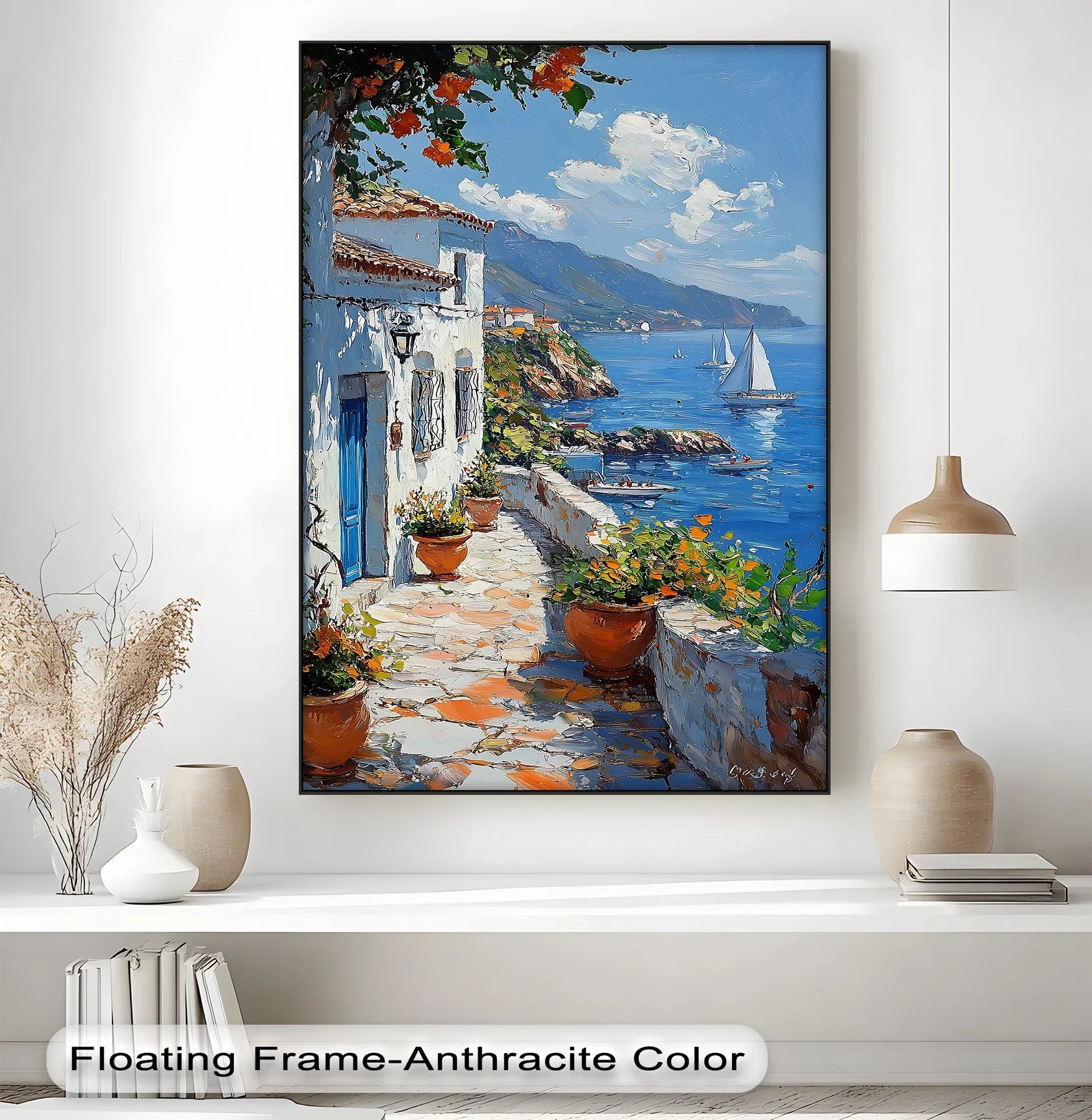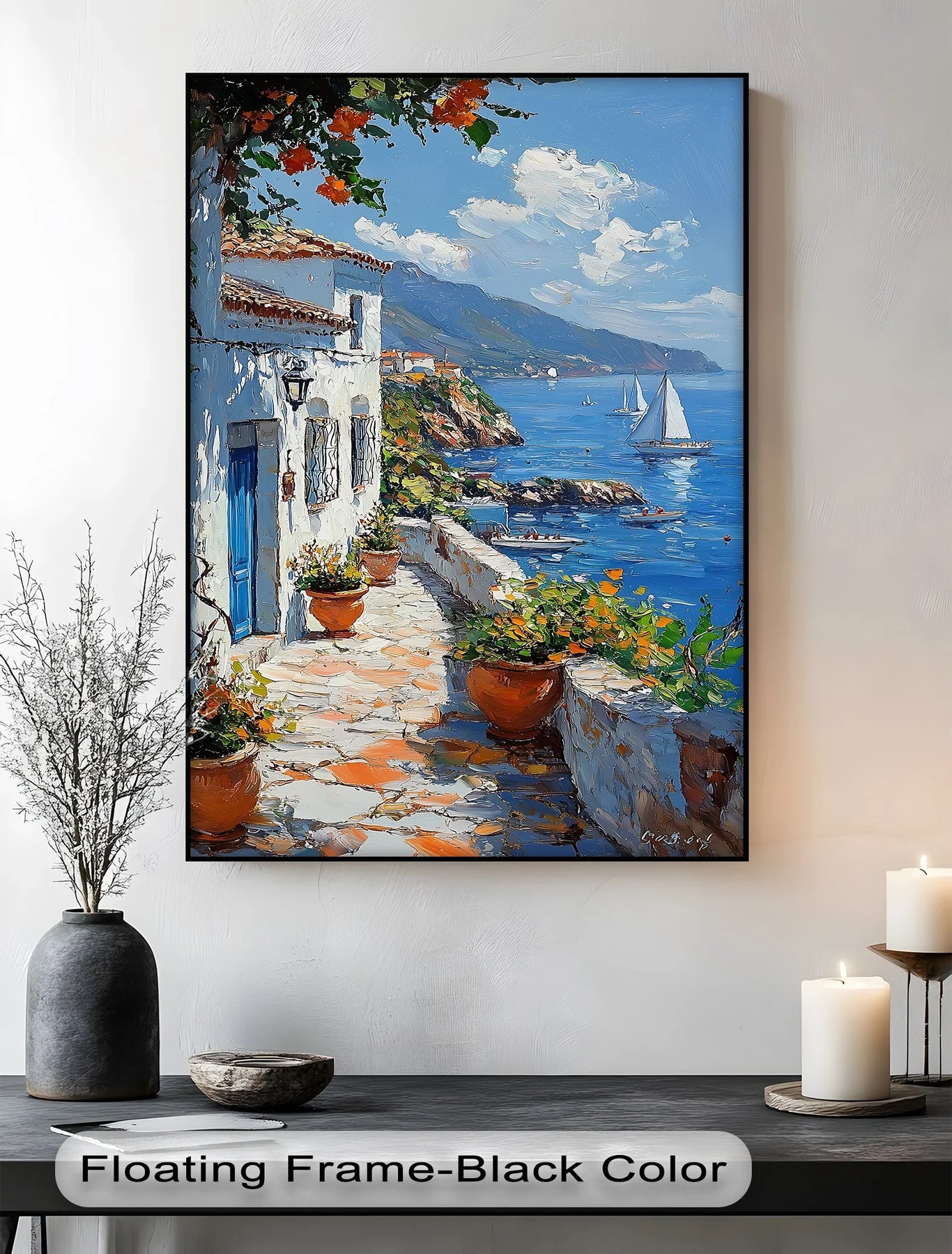 Step into the sun-drenched serenity of the coast with Mediterranean Stroll, a captivating canvas print that draws you down a rustic seaside path lined with terracotta pots and blooming vines. A cobalt-blue door invites you into the charm of whitewashed homes perched above sapphire waters, where sailboats drift across the horizon beneath a radiant sky.