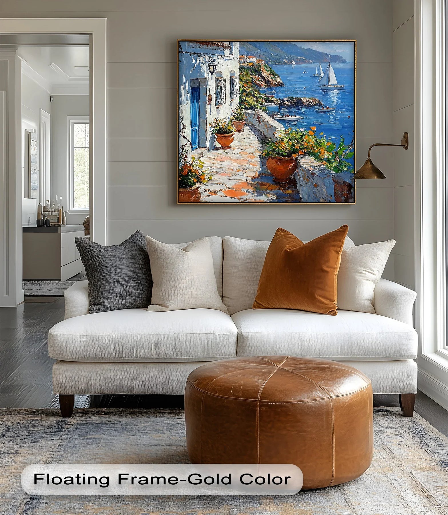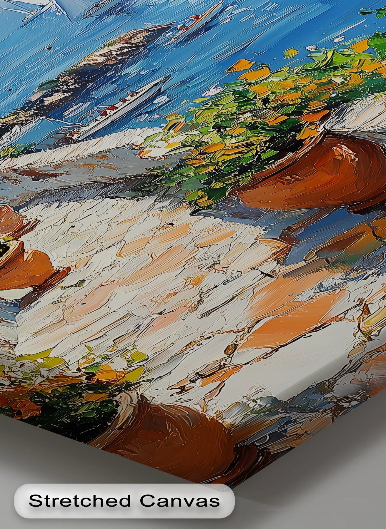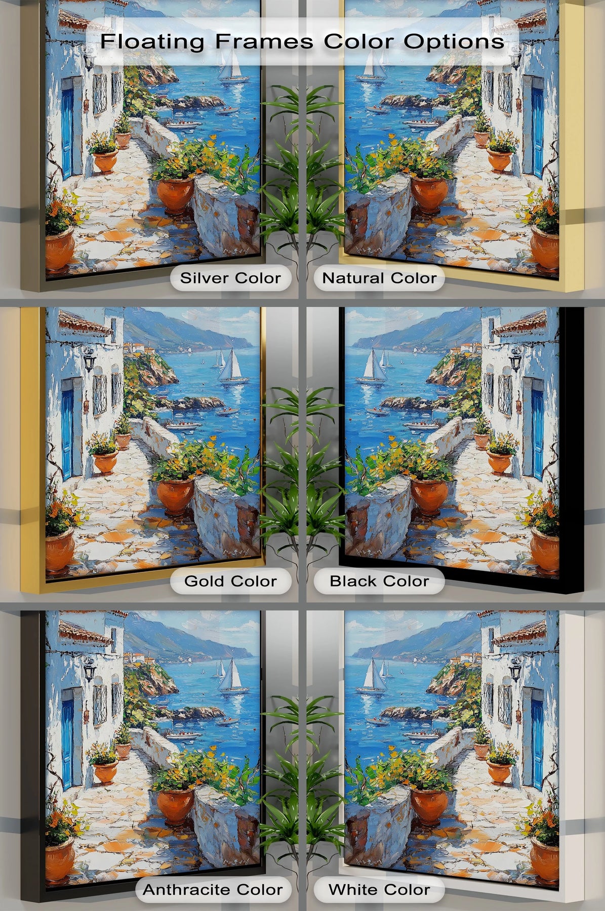 Step into the sun-drenched serenity of the coast with Mediterranean Stroll, a captivating canvas print that draws you down a rustic seaside path lined with terracotta pots and blooming vines. A cobalt-blue door invites you into the charm of whitewashed homes perched above sapphire waters, where sailboats drift across the horizon beneath a radiant sky.