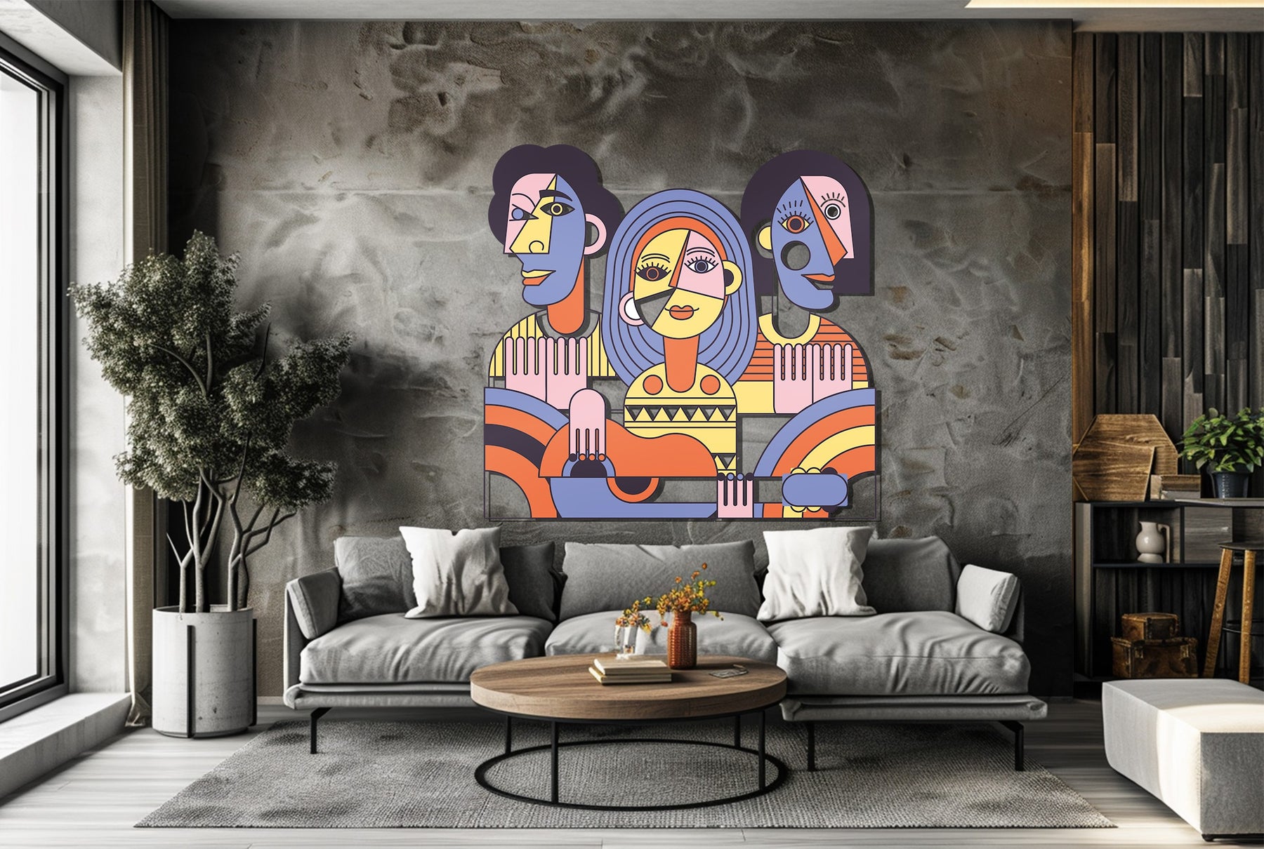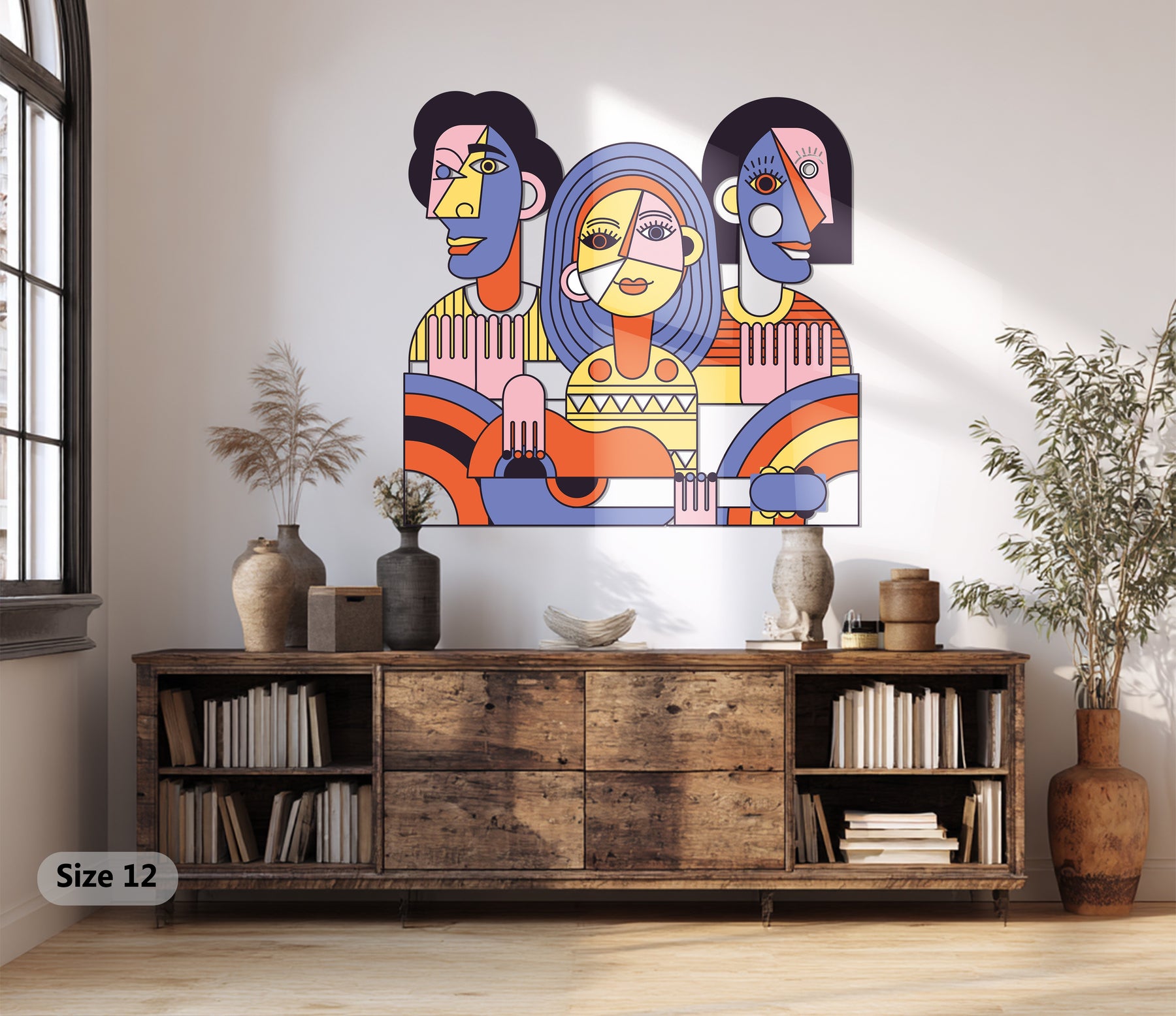 Experience rhythm and color intertwined with Melodic Harmony Metal Wall Art, an abstract depiction of three musicians brought to life in vibrant cubist style. The bold geometric shapes and expressive faces capture the soul of creativity, making it a perfect statement piece for art lovers and modern interiors.