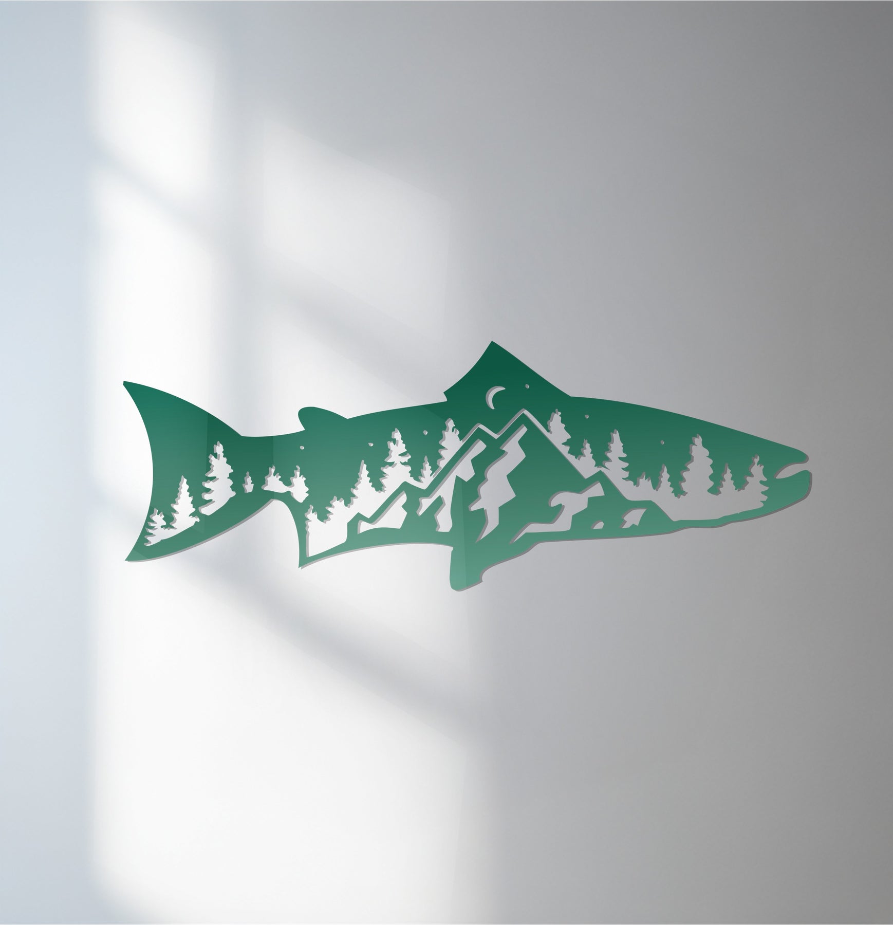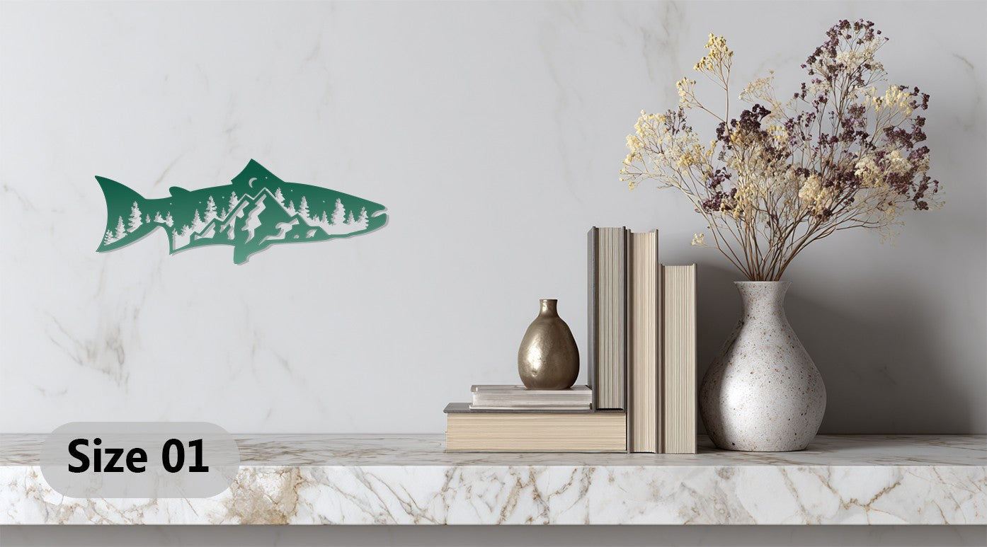 Celebrate the beauty of the great outdoors with the Mountain Trout Metal Wall Art – Nature-Inspired Fishing Decor. This stunning design blends the silhouette of a fish with a serene mountain landscape, complete with pine trees and a moonlit sky. Its clever cutout detailing symbolizes harmony between wildlife and nature — perfect for fishing enthusiasts and adventure lovers alike.