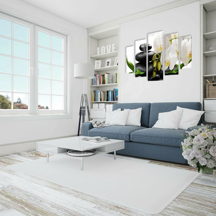 Werten Sie Ihren Raum mit der beruhigenden Eleganz von Orchid Flowers & Stones auf 5-teiliges Wandbild. Diese atemberaubende Komposition verbindet die sanfte Schönheit weißer Orchideen mit der erdenden Präsenz glatter schwarzer Steine und schafft so eine harmonische, Zen-ähnliche Atmosphäre.