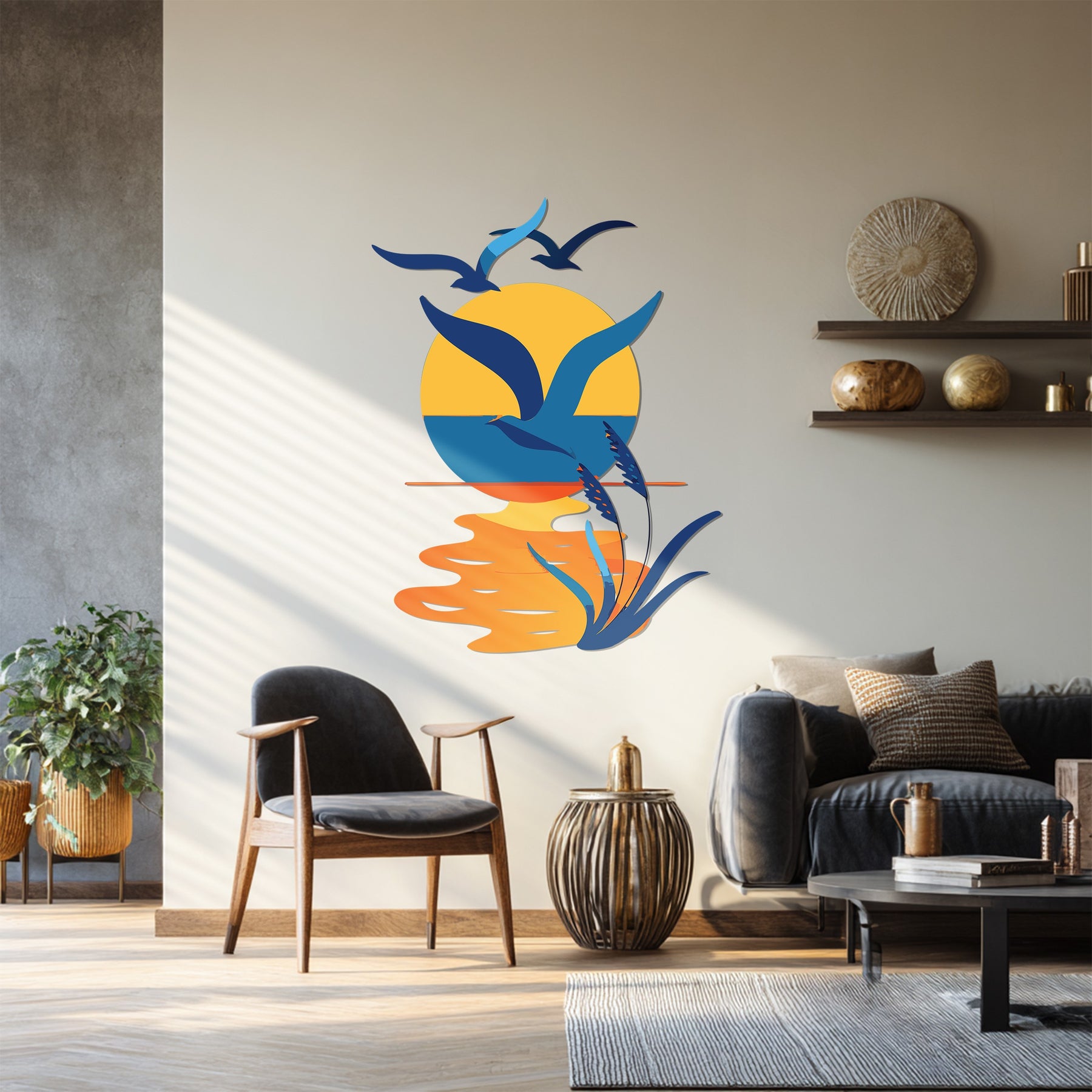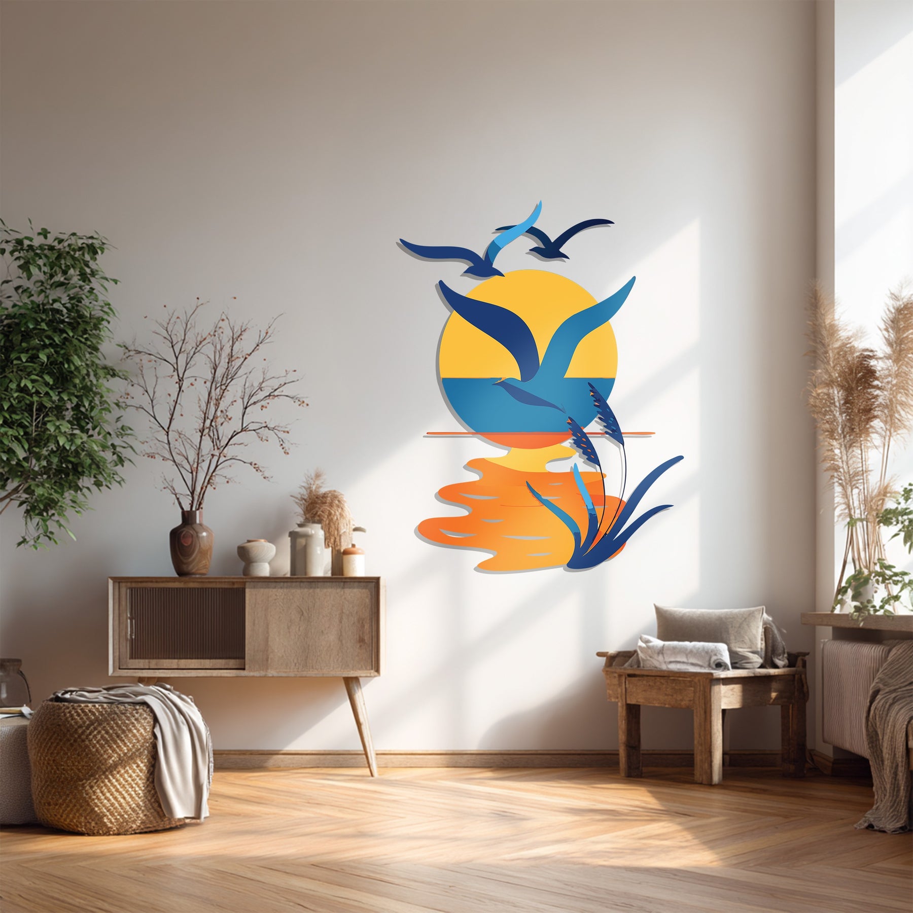 Seaside Harmony Metal Wall Art – Sunset & Flying Birds Design