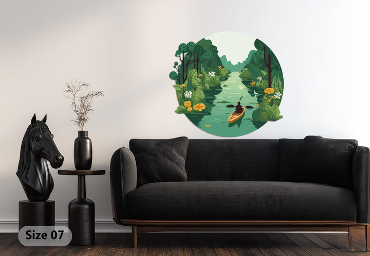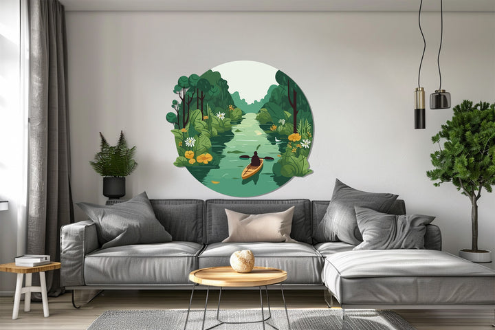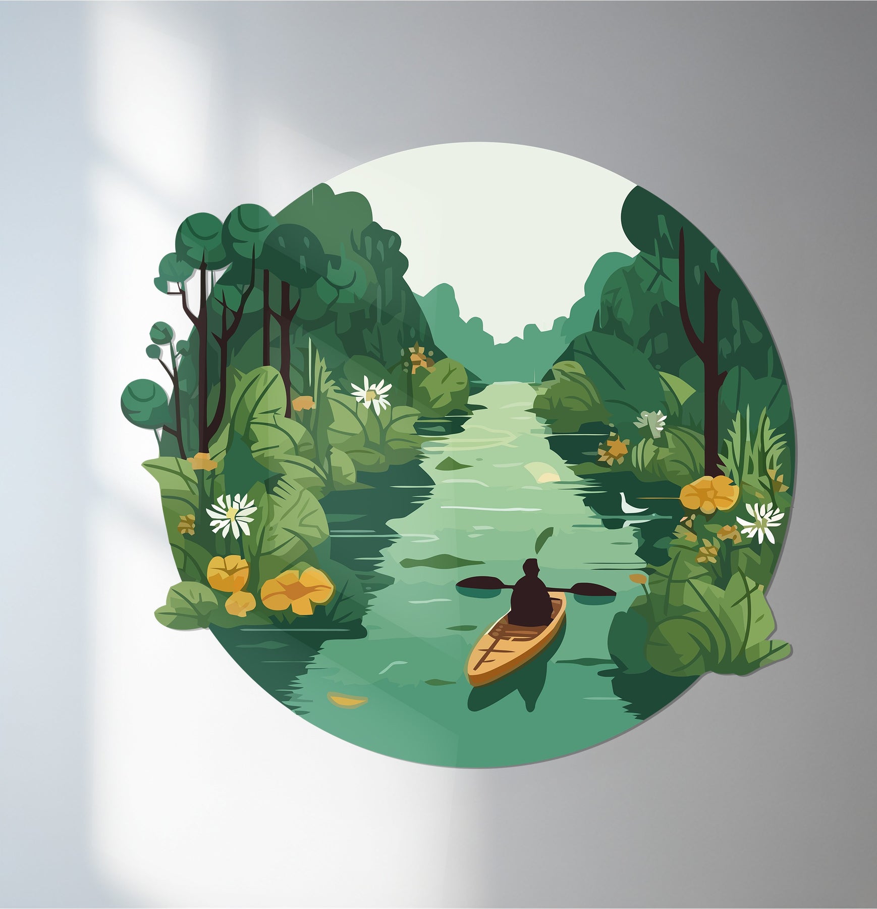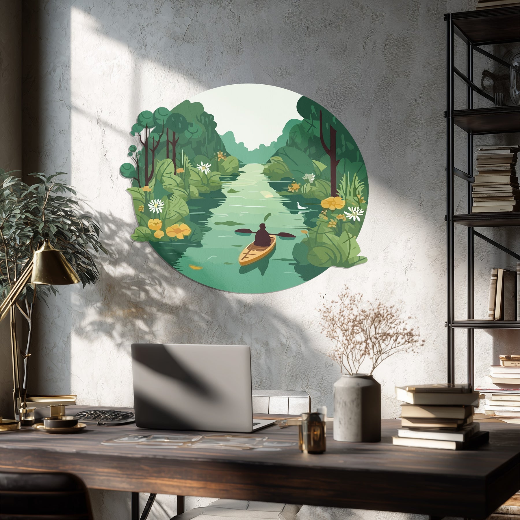 Escape into the calm of nature with the Tranquil Journey Metal Wall Art, a serene depiction of a lone kayaker gliding through lush green waters surrounded by vibrant forest life. Shades of deep emerald and soft sunlight create a peaceful balance of color and emotion — a reminder to slow down and embrace stillness.
