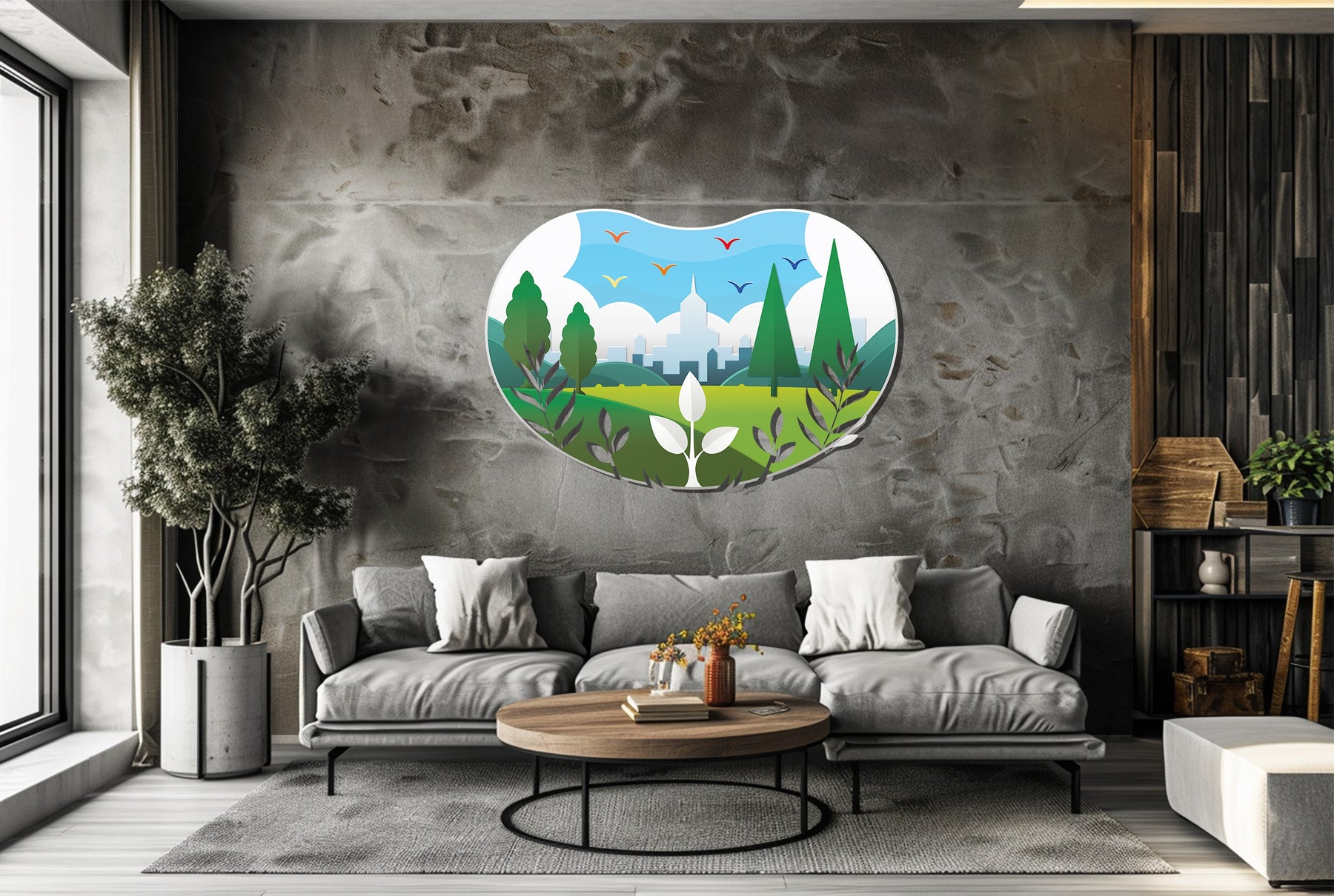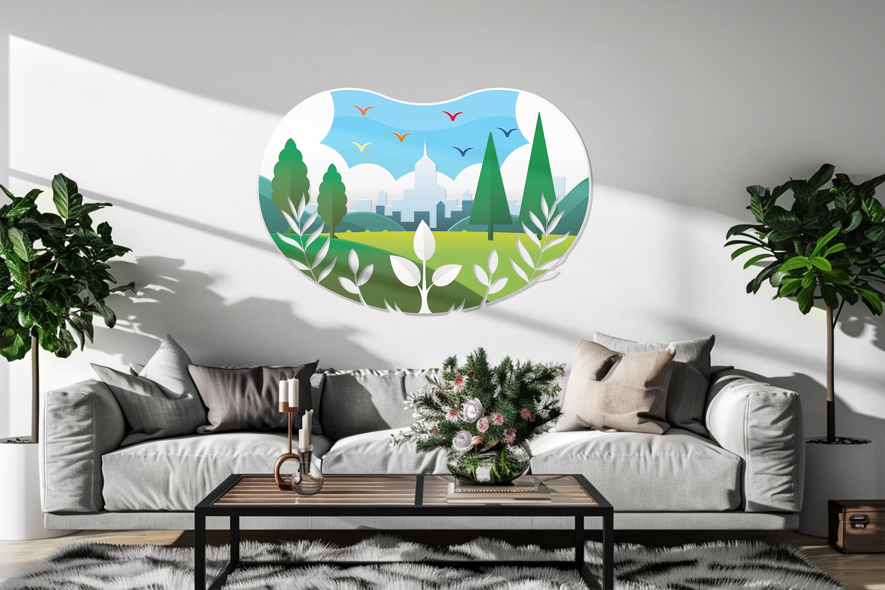 Bring harmony to your space with the Urban Serenity Metal Wall Art, a vibrant blend of city life and nature’s calm. This design features a peaceful green landscape framed by trees and foliage, with a modern city skyline rising in the background — a visual metaphor for balance between progress and peace.