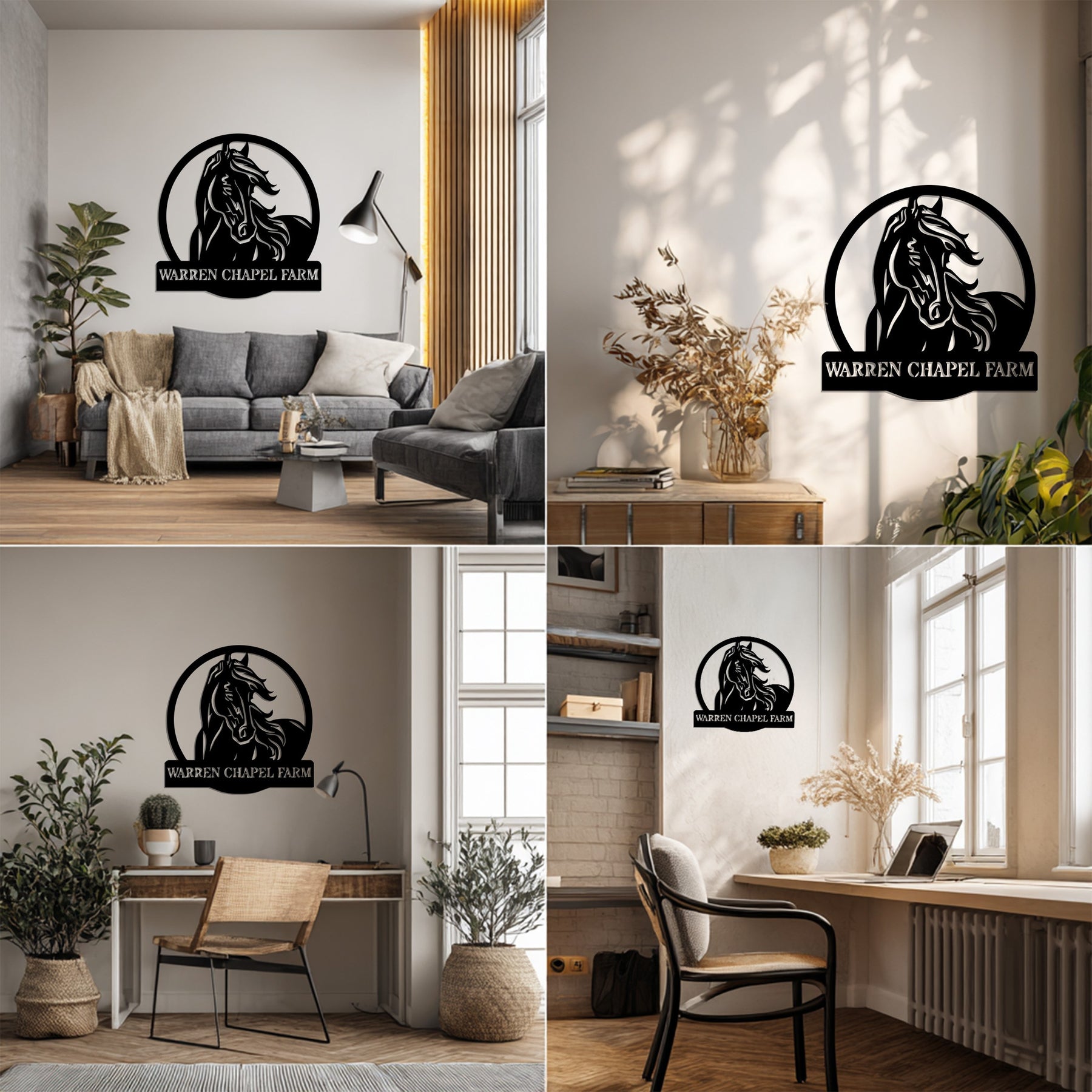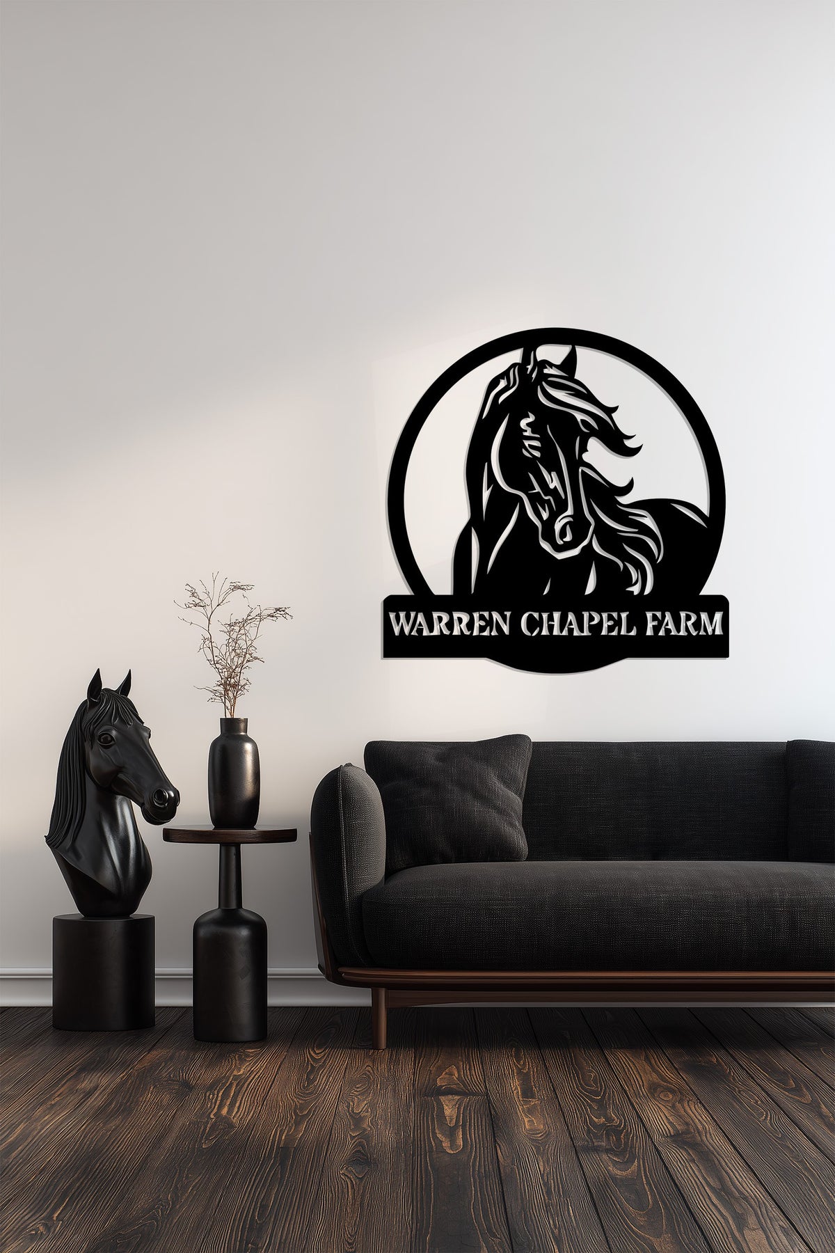 Celebrate your equestrian passion with the Warren Chapel Farm Metal Wall Art – Custom Horse Farm Name Sign. Featuring a powerful horse design framed within a circular outline, this piece captures the strength, grace, and spirit of farm life. The bold custom lettering makes it perfect for displaying your farm’s name with pride and elegance.
